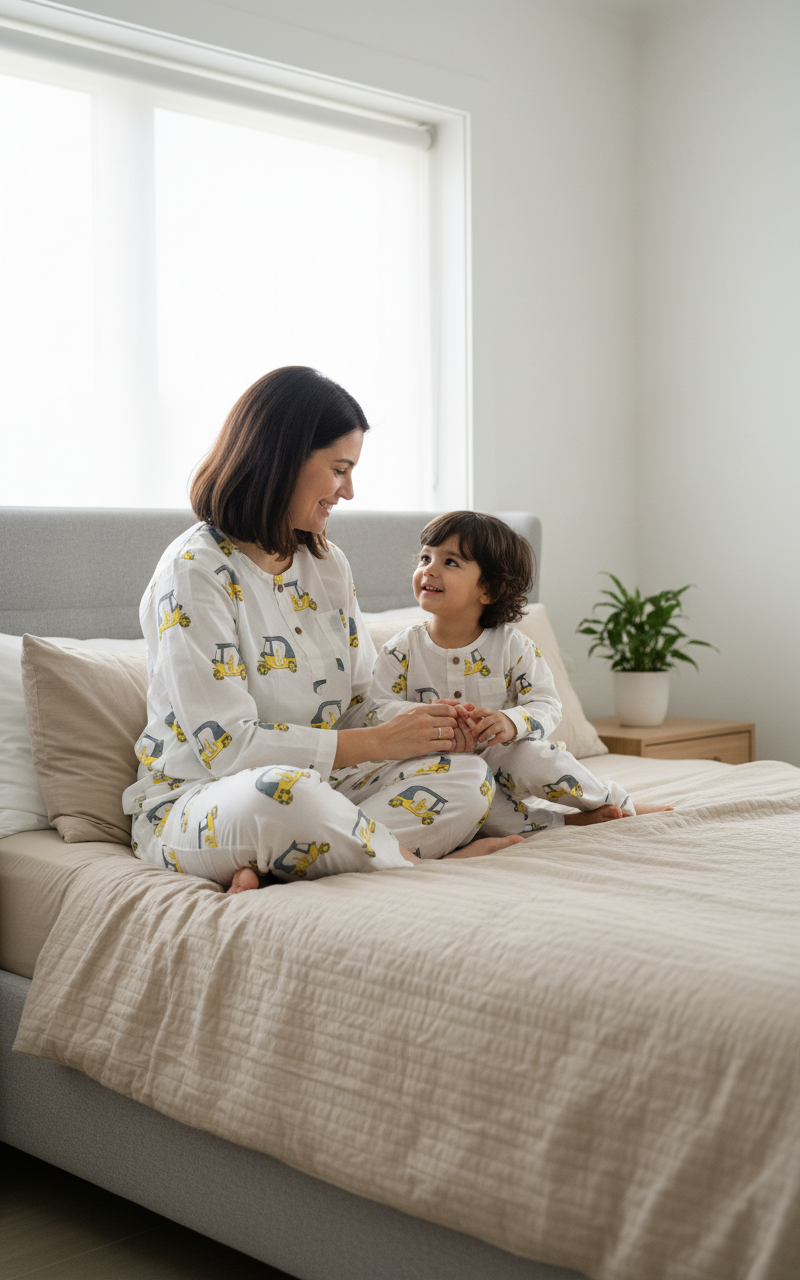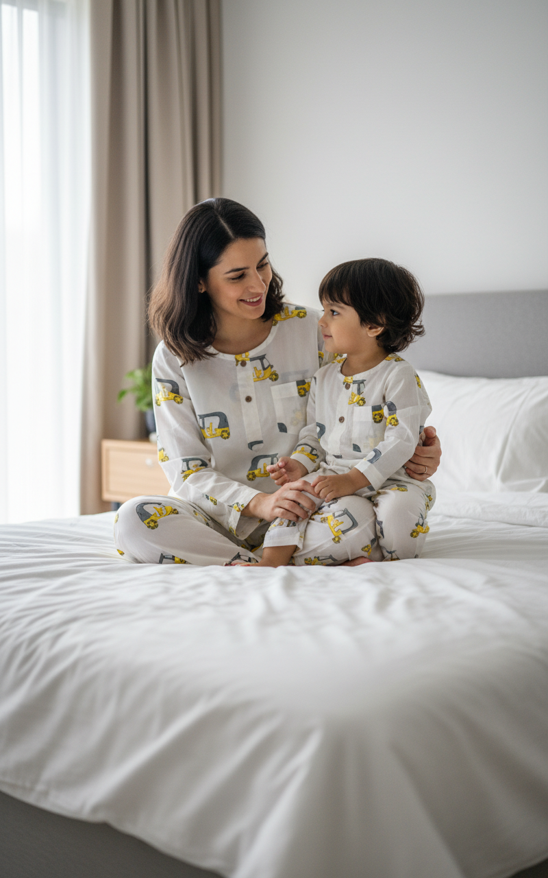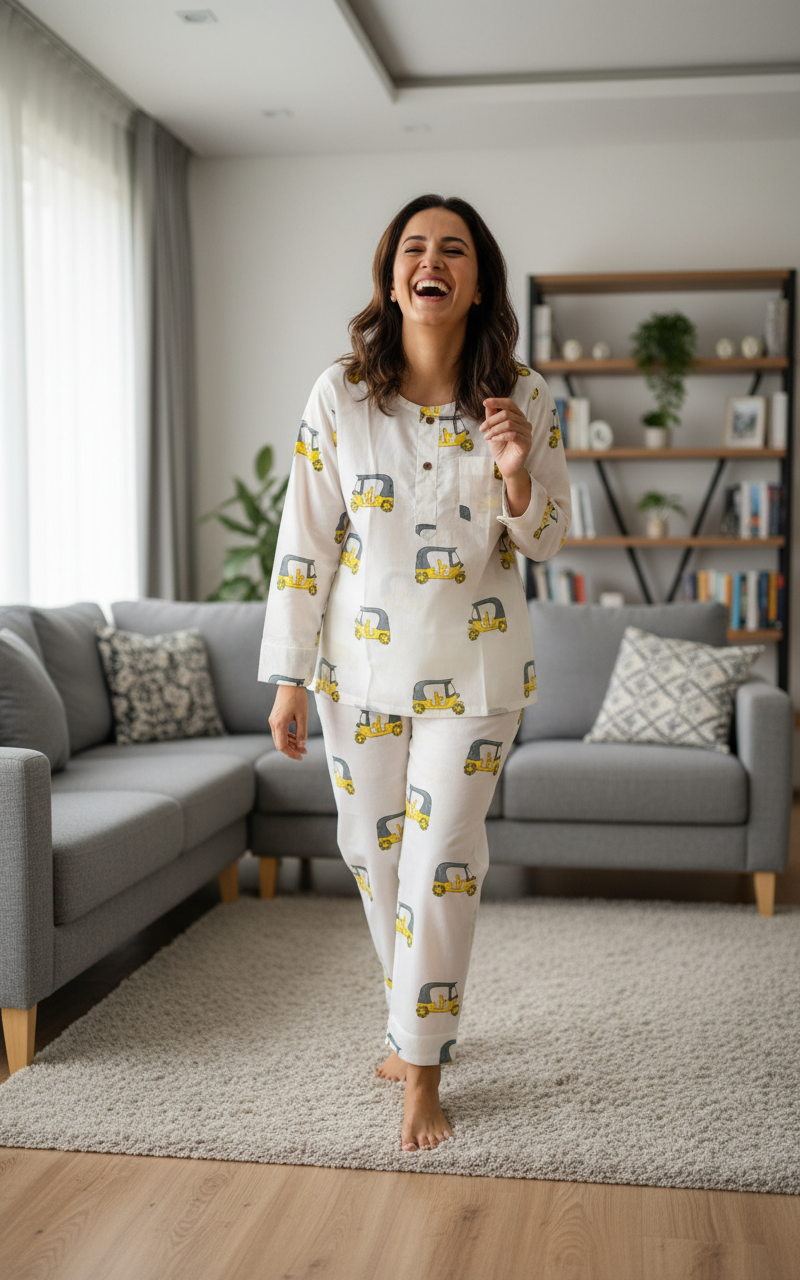 Adult Jammies: Embrace comfort and style with our hot favourite Auto Rickshaw print Pajama Set. Made from 100% cotton,hand-block printed, this super comfortable set is perfect for cozy night snuggles with your little! A relaxed-fit kurta pajama style with elastic waisted pajamas and side pockets.