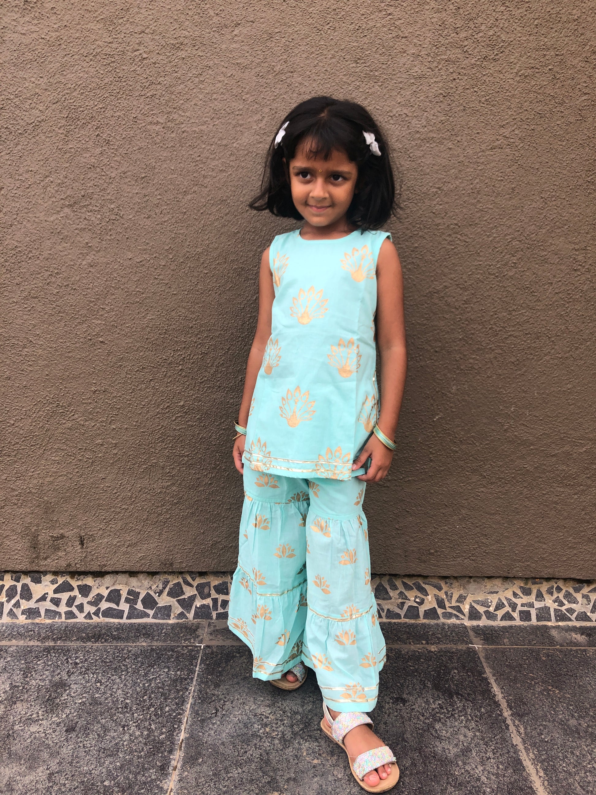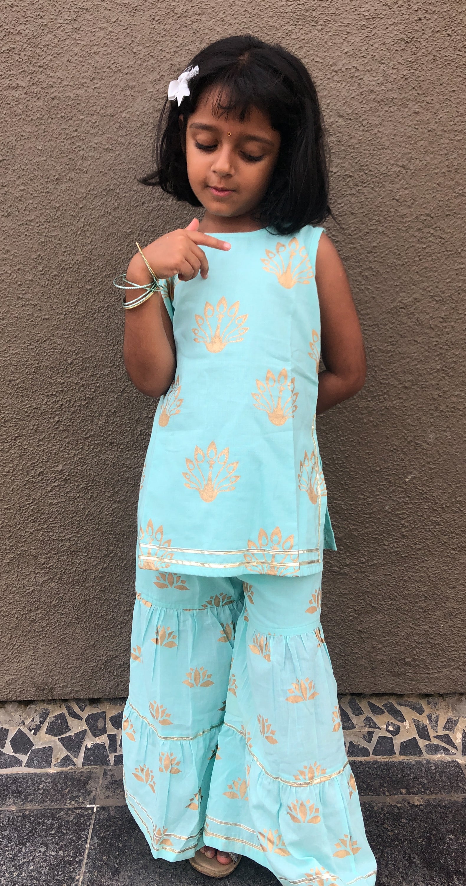 Brighten up festive occasions with this Blue Peacock print short knee-length kurta and a sharara set for girls. Made with 100% cotton, the set features intricate gold gota patti detailing on the bottom of the kurta and the sharara, combining comfort and elegance for a stylish traditional look.