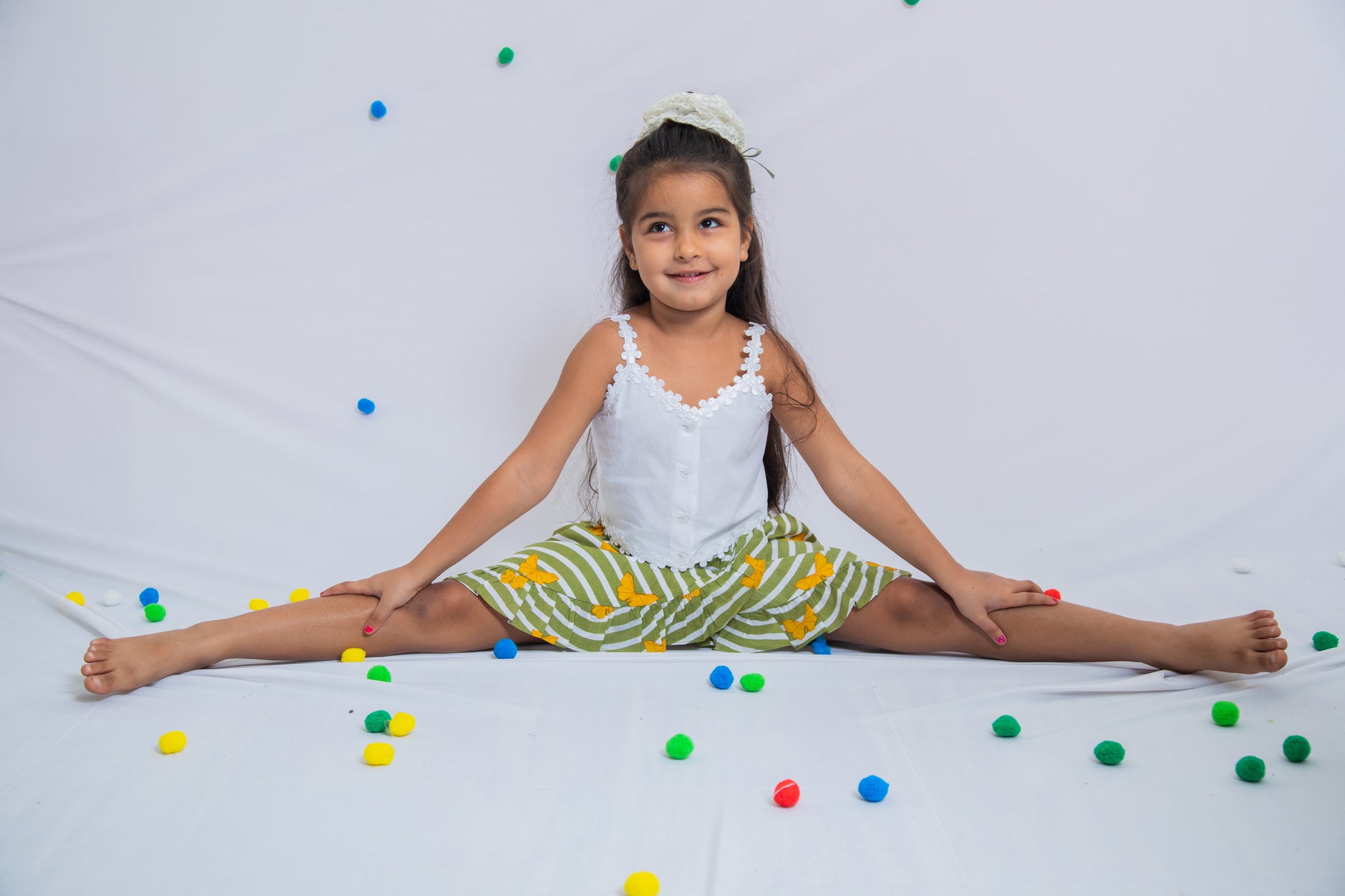 Introducing our Butterfly print skirt set from the Garden Whimsies Collection for girls: Crafted from 100% cotton, this set features green waves background with pretty yellow butterflies. Perfectly co-ordinated for effortless style, a must have ensemble for every child.