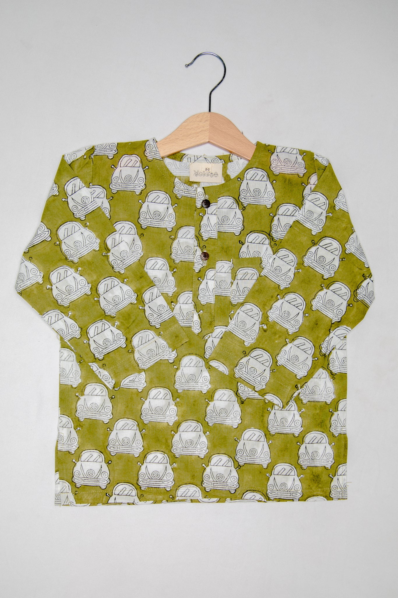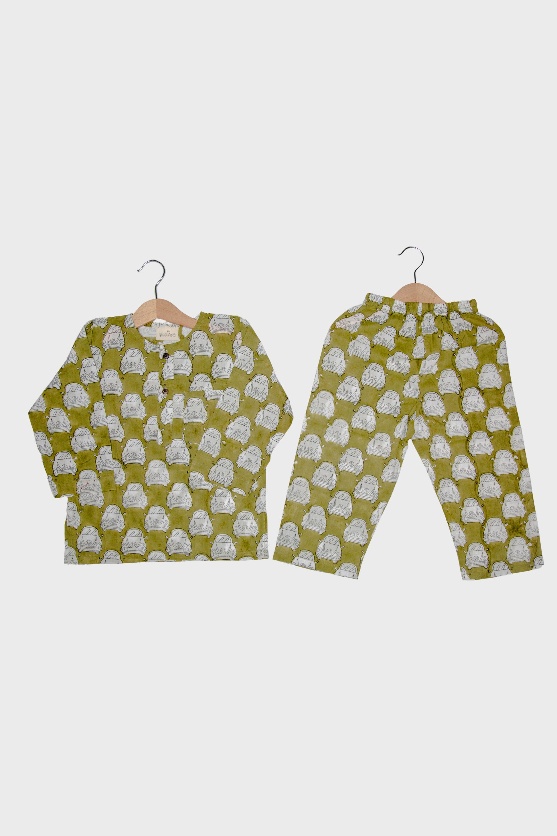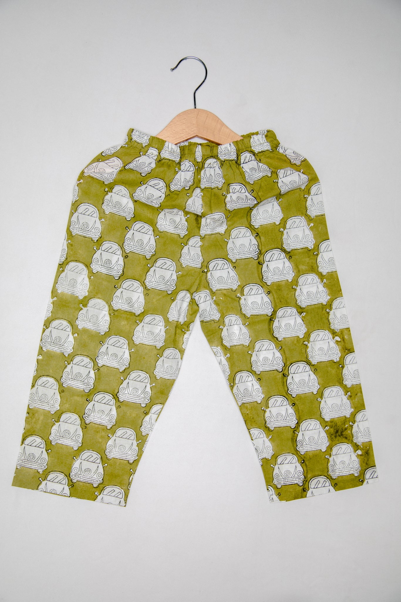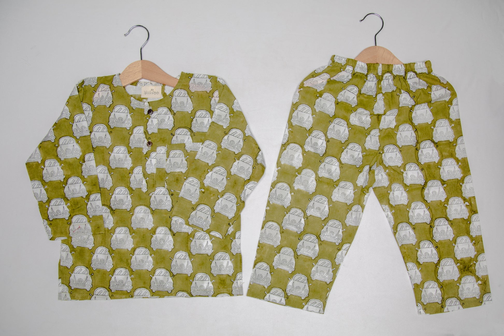 Sleep tight in our soft cotton mul night suit with Car kurta and pajama set, hand-block printed.