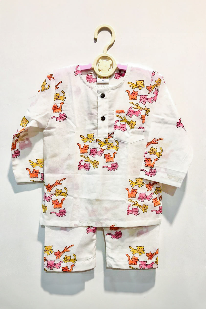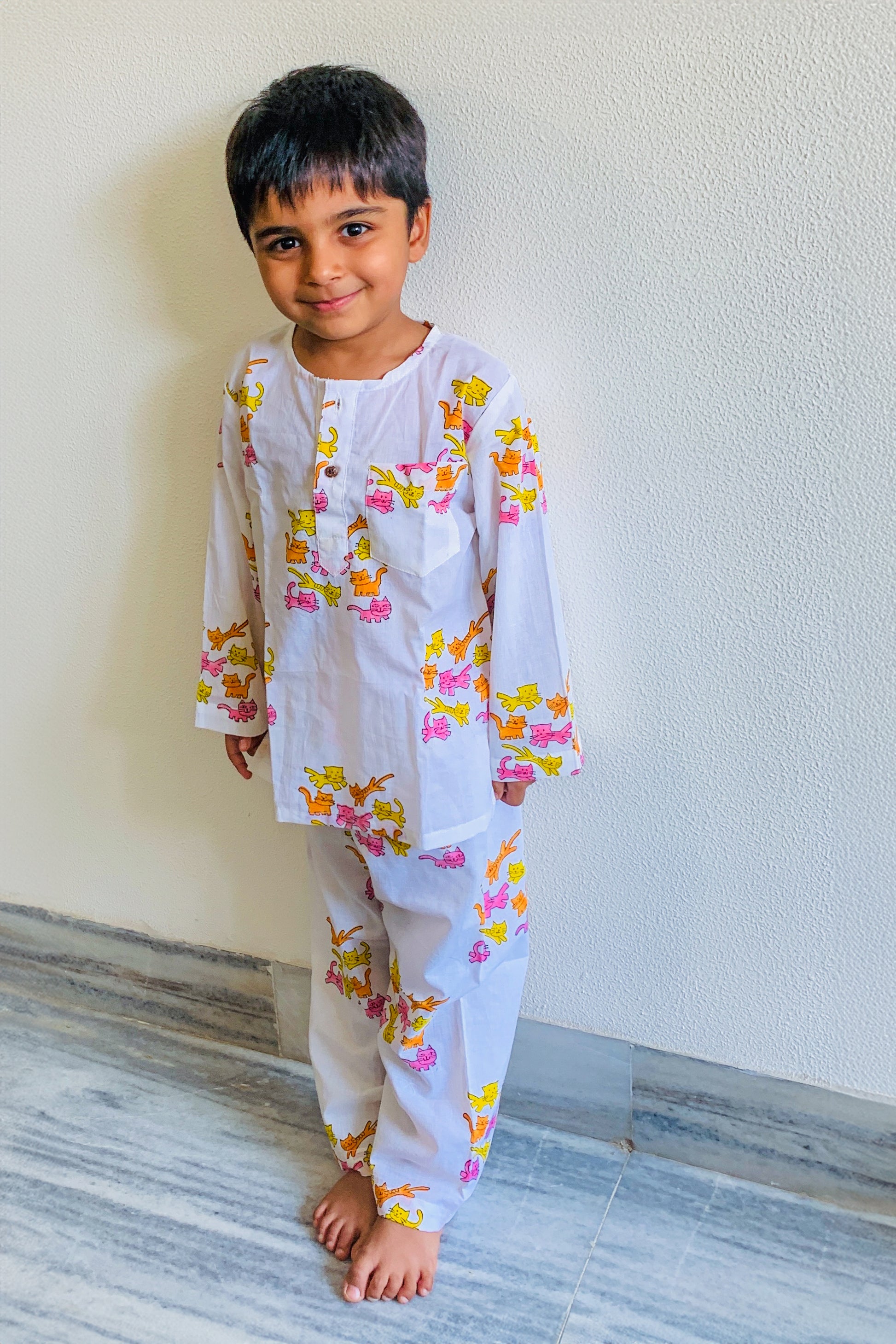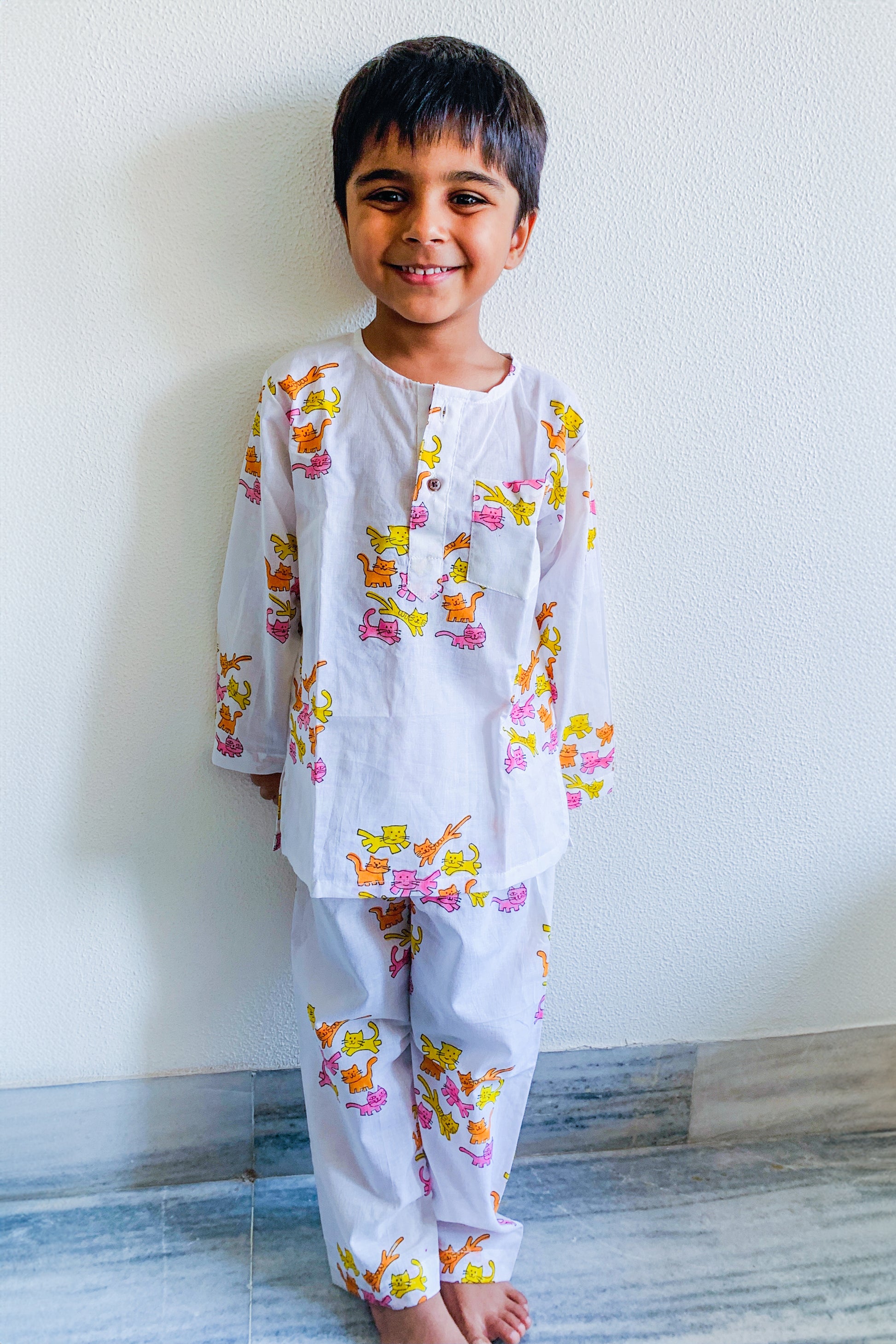 Sleep tight in our soft cotton mul night suit with Cat kurta and pajama set, hand-block printed.