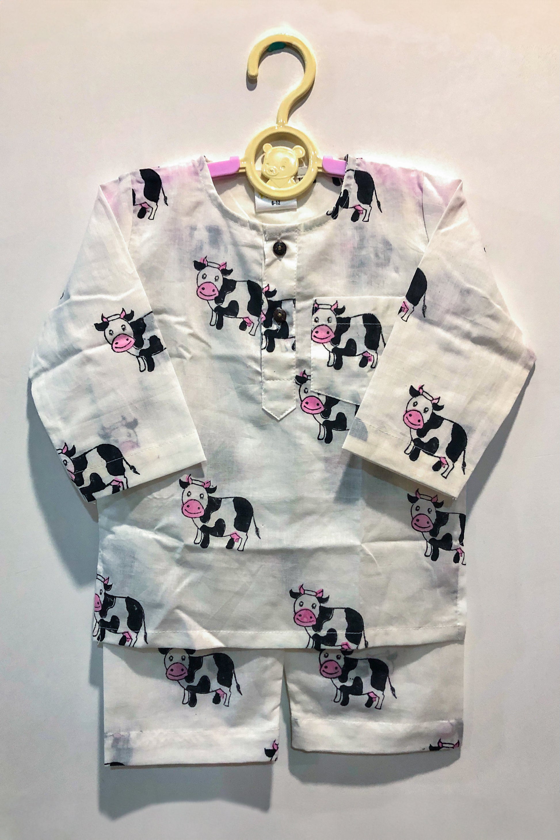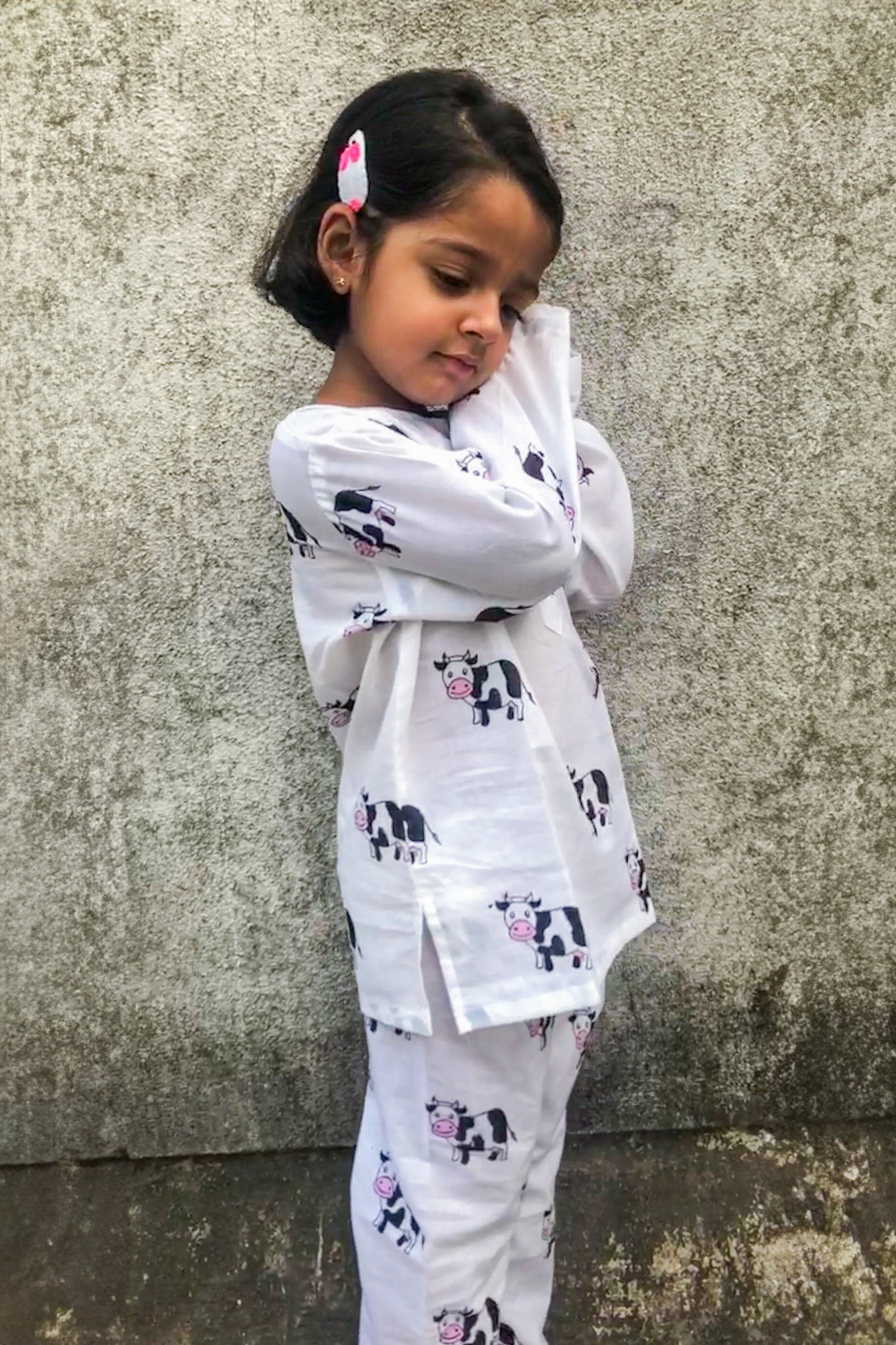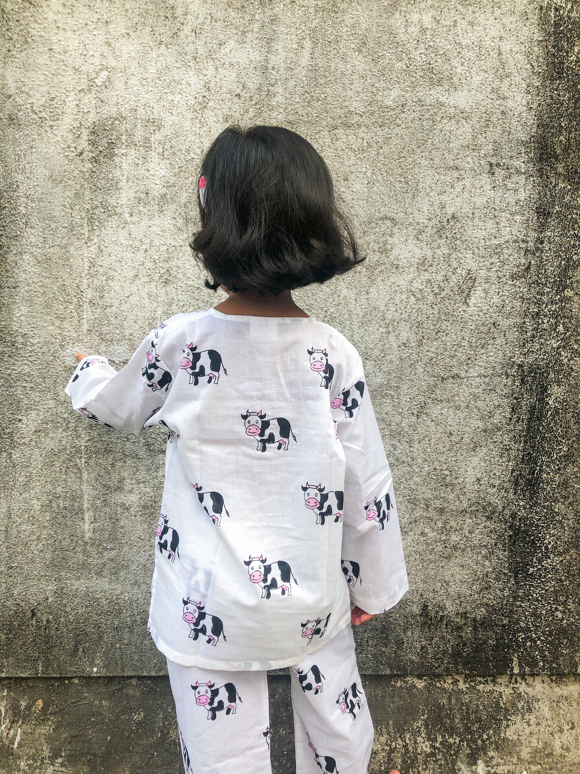 Sleep tight in our soft cotton mul night suit with Cow kurta and pajama set, hand-block printed.