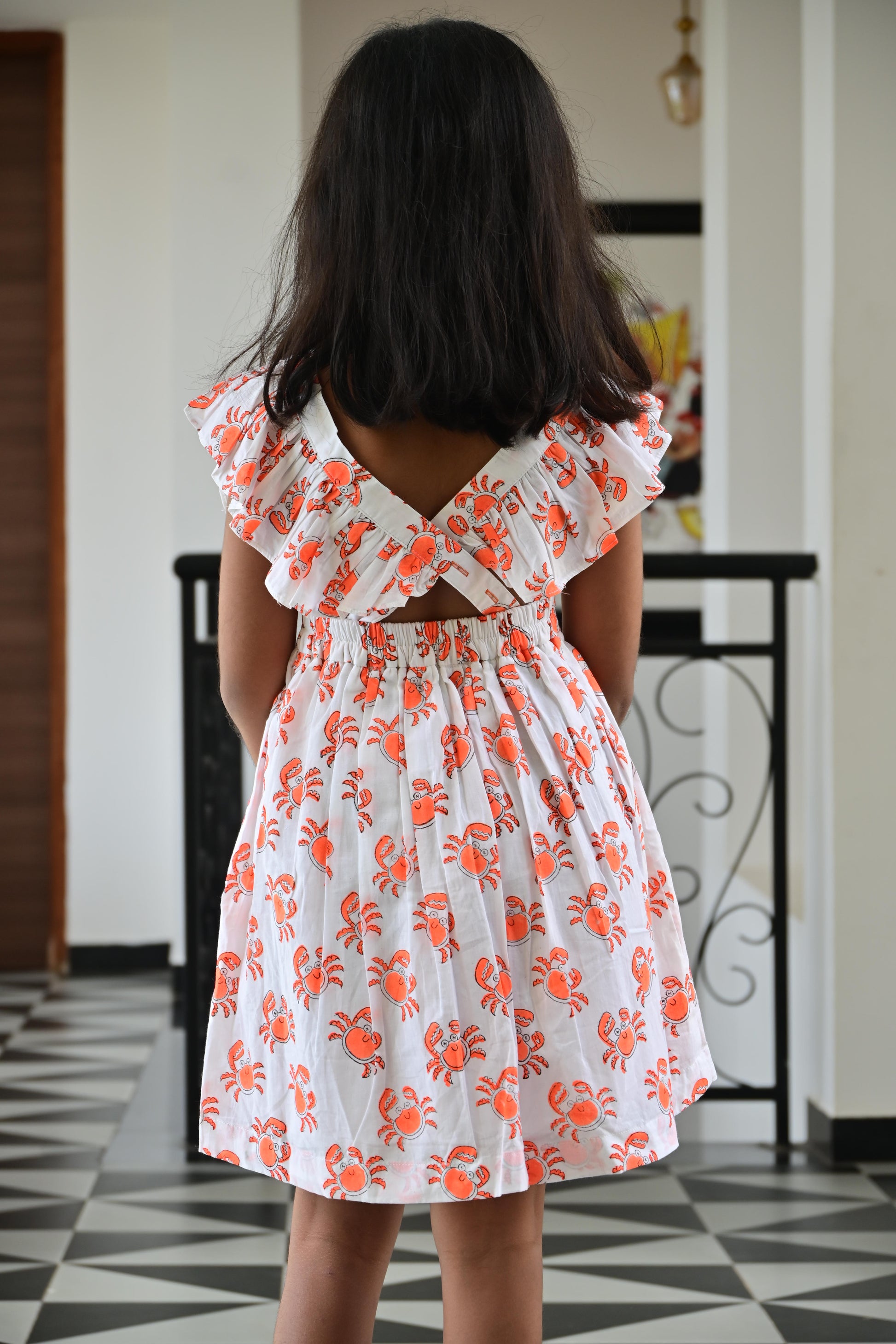 Flutter around in our signature Neon print crabs ruffle dress. Hand-block printed.
