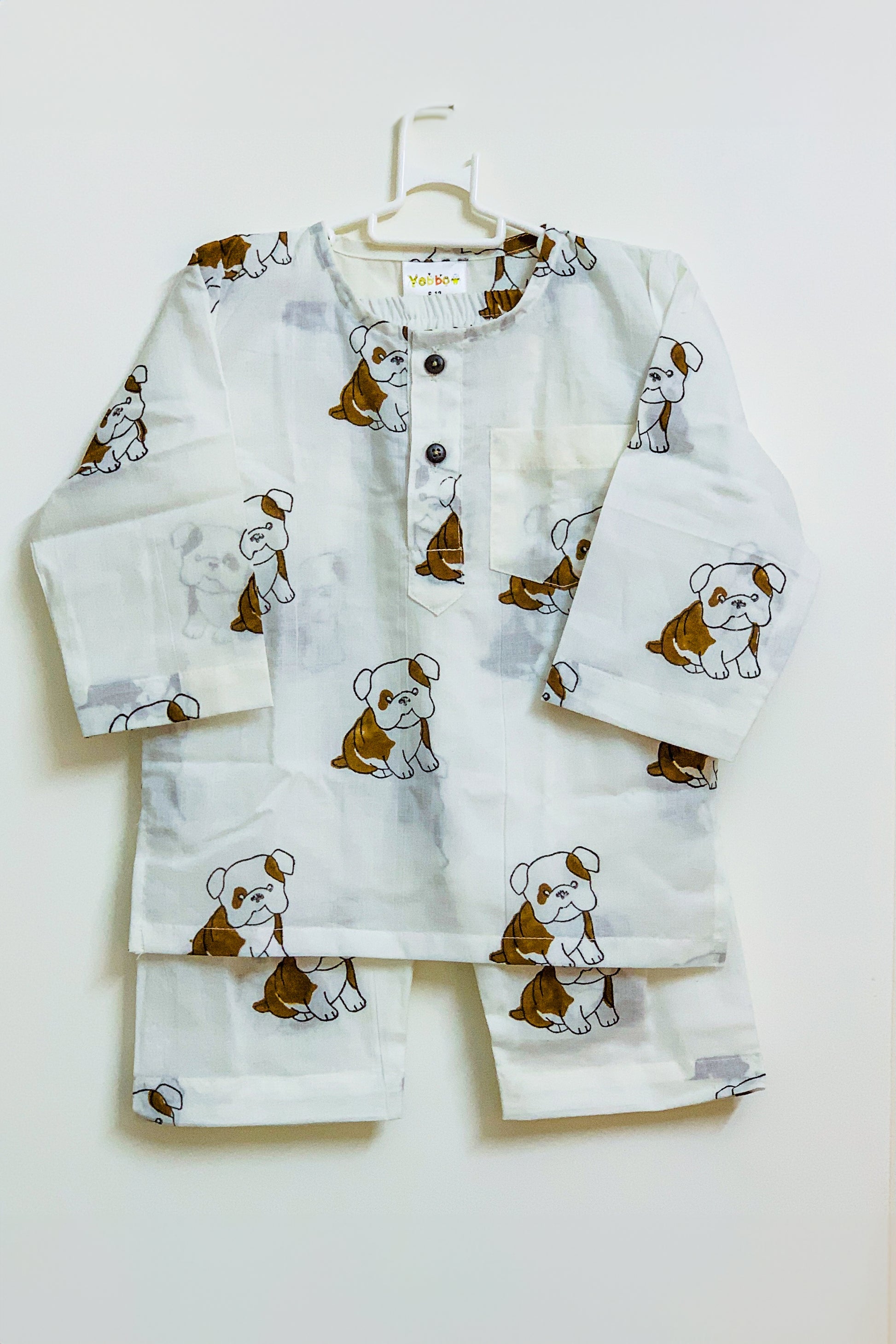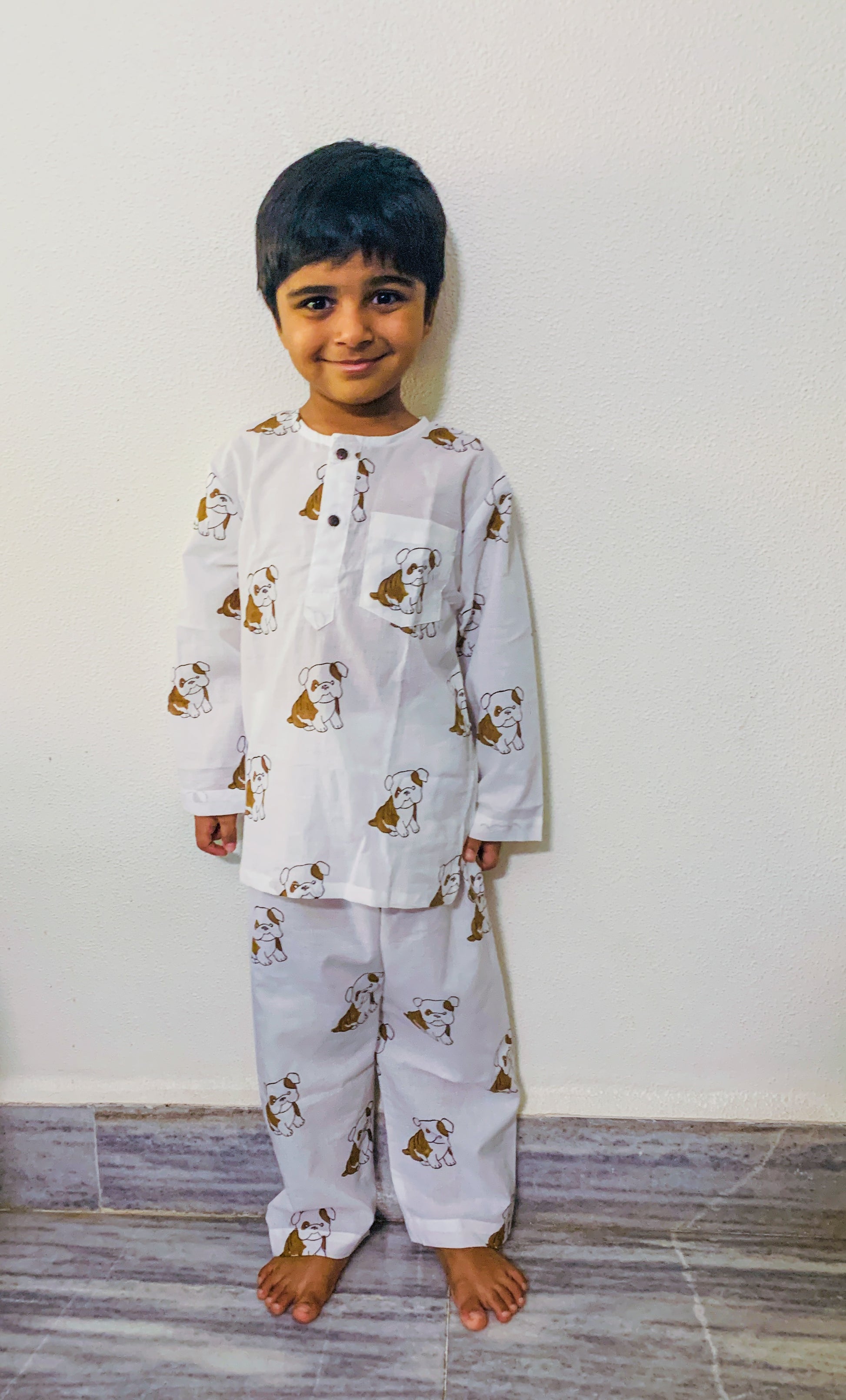 Sleep tight in our soft cotton mul night suit with Dog kurta and pajama set, hand-block printed.