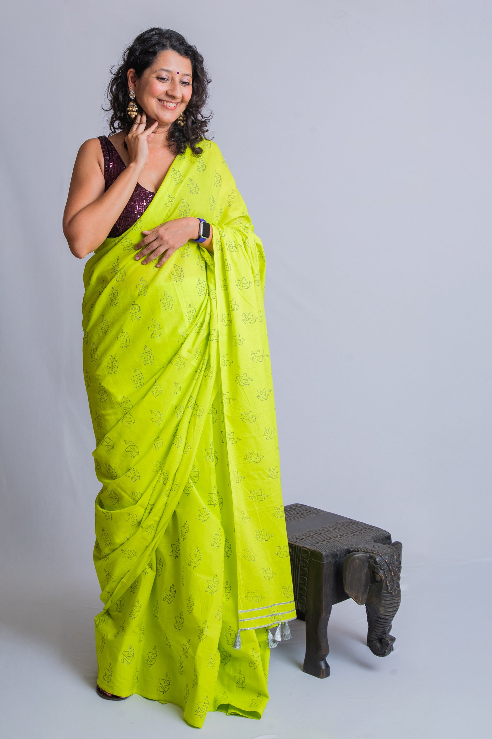 Discover our latest launch: the Women's Saree Collection, crafted from 100% cotton and adorned with our signature quirky prints. This versatile saree in our Green Origami Elephant print are perfect for both casual and formal occasions, offering effortless style and endless stylish possibilities.