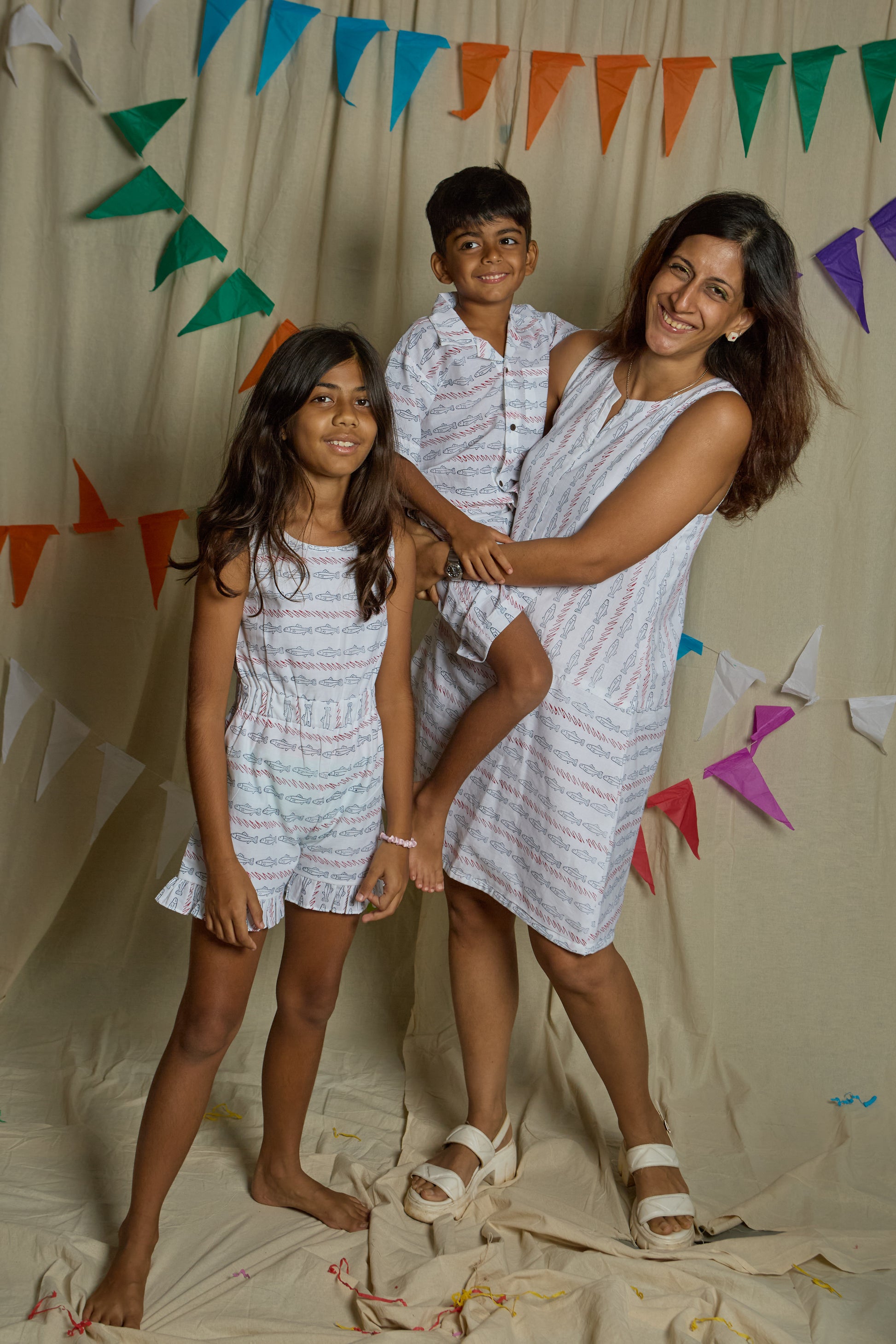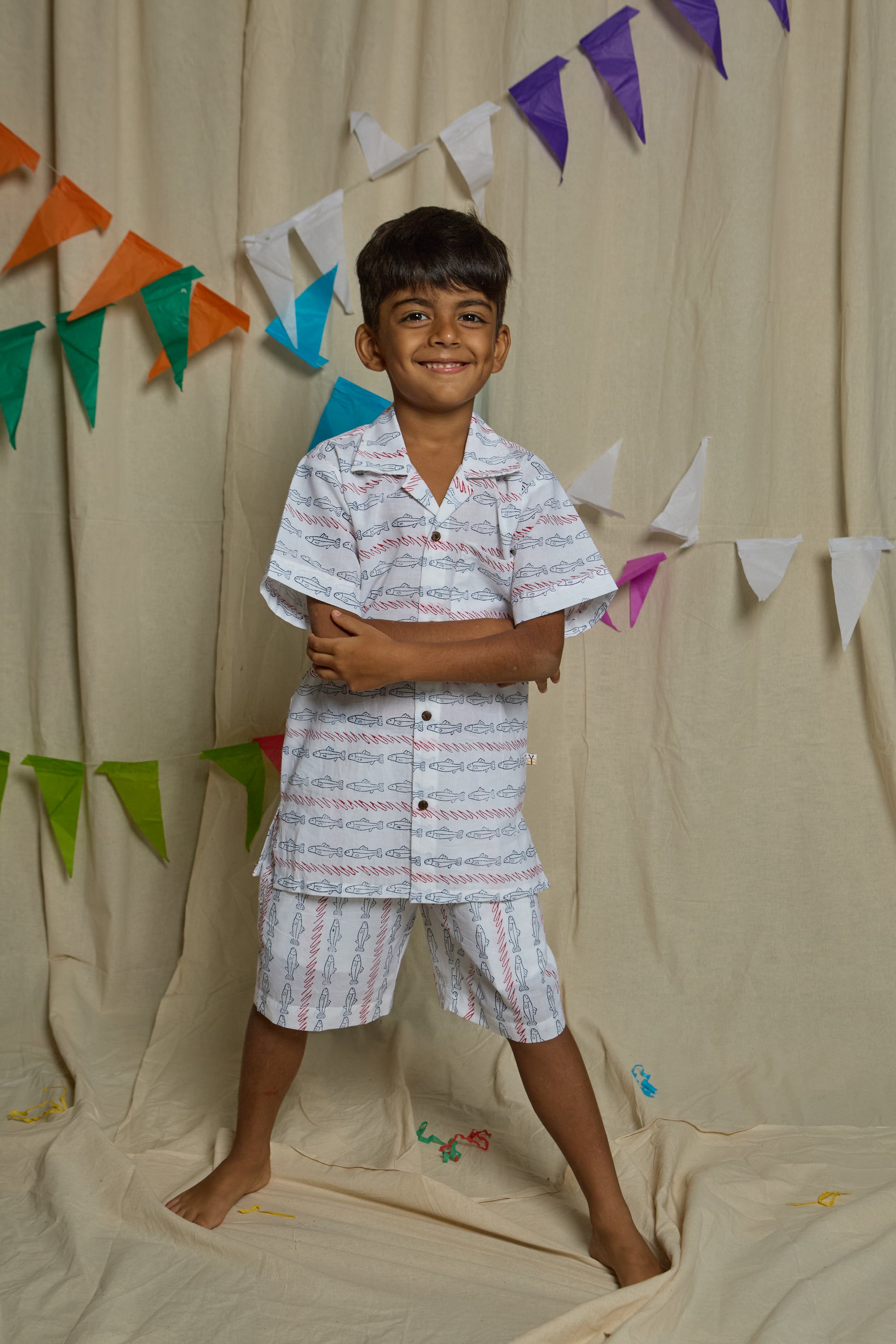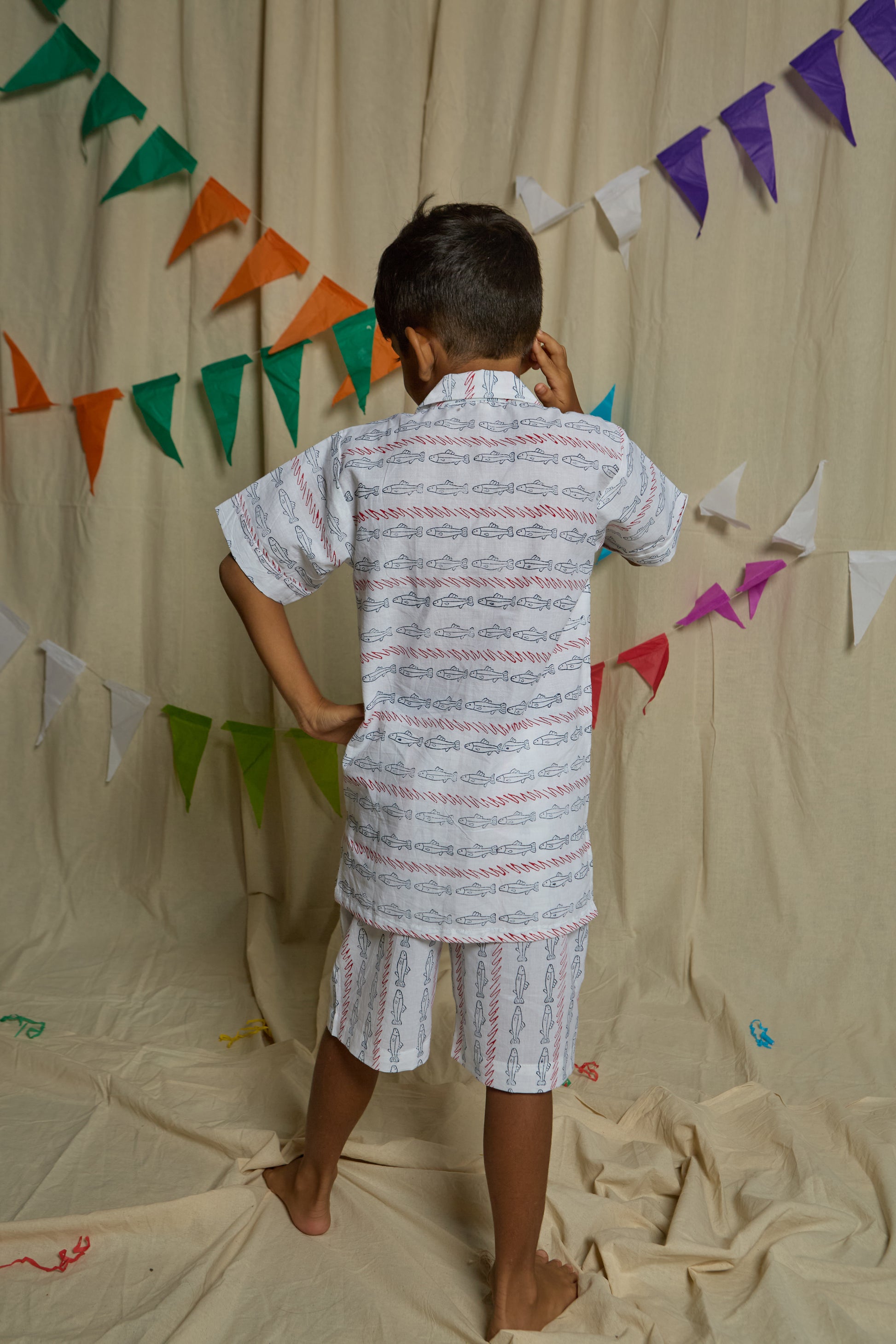 Co-ord Set:- Introducing our Fish Waves co-ord set: Crafted from 100% cotton, this set features cute little fishies with wave which is hand-block printed. Perfectly co-ordinated for effortless style, a must have ensemble for every child.