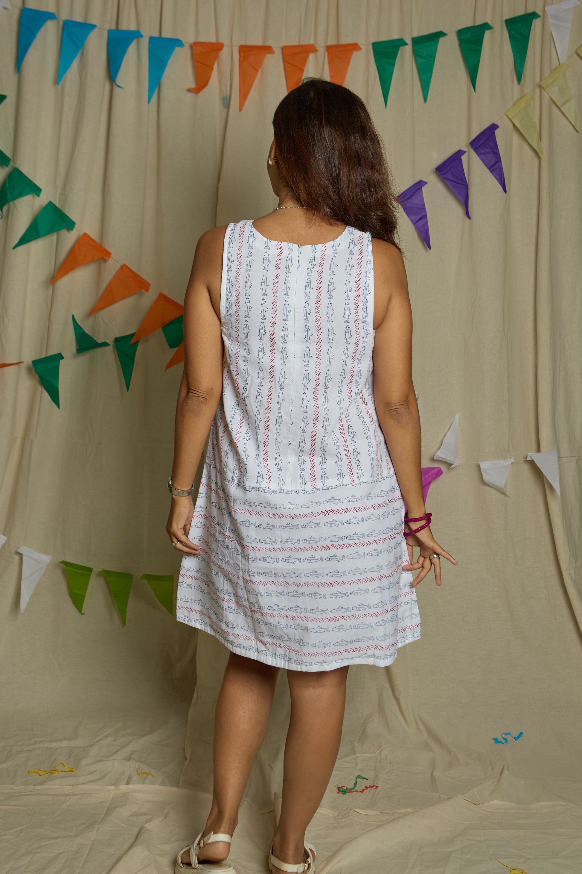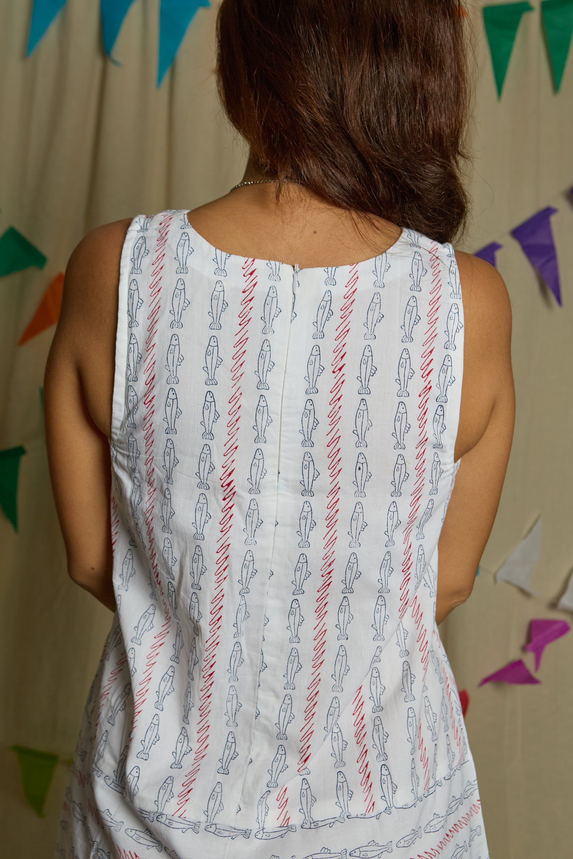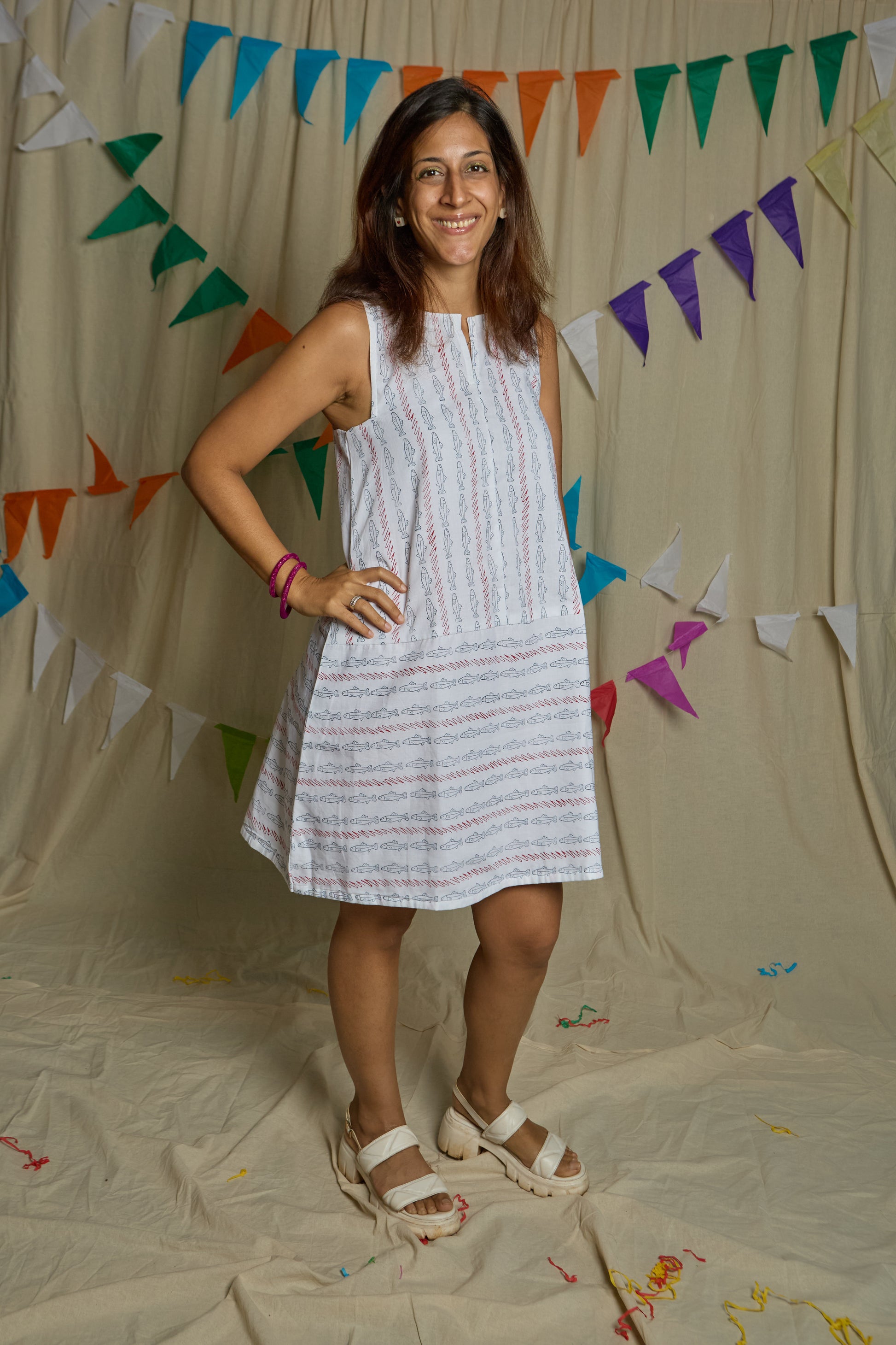 Adult dress: Elevate your wardrobe with our sleeveless adult dress made from 100% cotton. Featuring subtle red waves with blue fishes which are hand-block printed, this dress boasts an interesting A-line style shift dress style with a back-zip for a perfect fit.