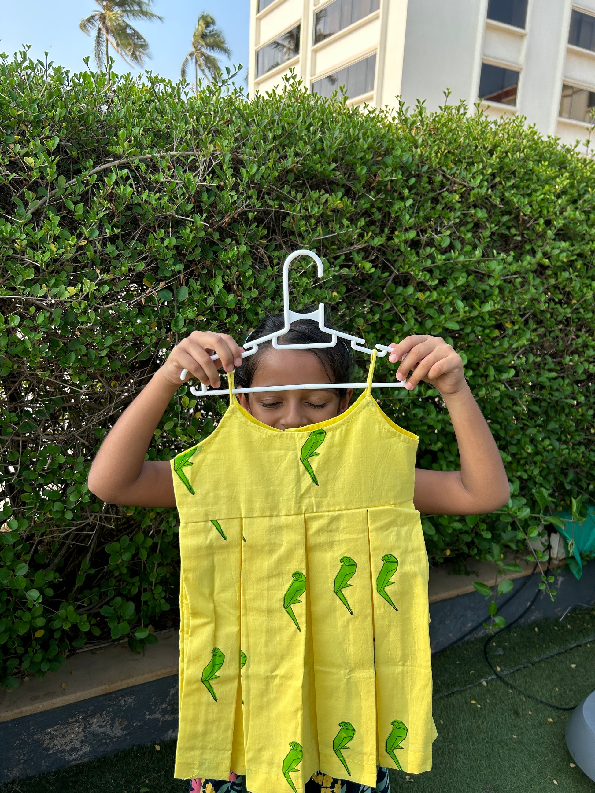 Girls Dress: Get the Same look as Mommy! Our most Favourite Print & Style! The Origami Hand Block Print Parrot Adult & Kids Dress, crafted from 100% Mul cotton fabric. A thick strapped spaghetti with wide box pleats from the waist onwards, gives this dress a great fit