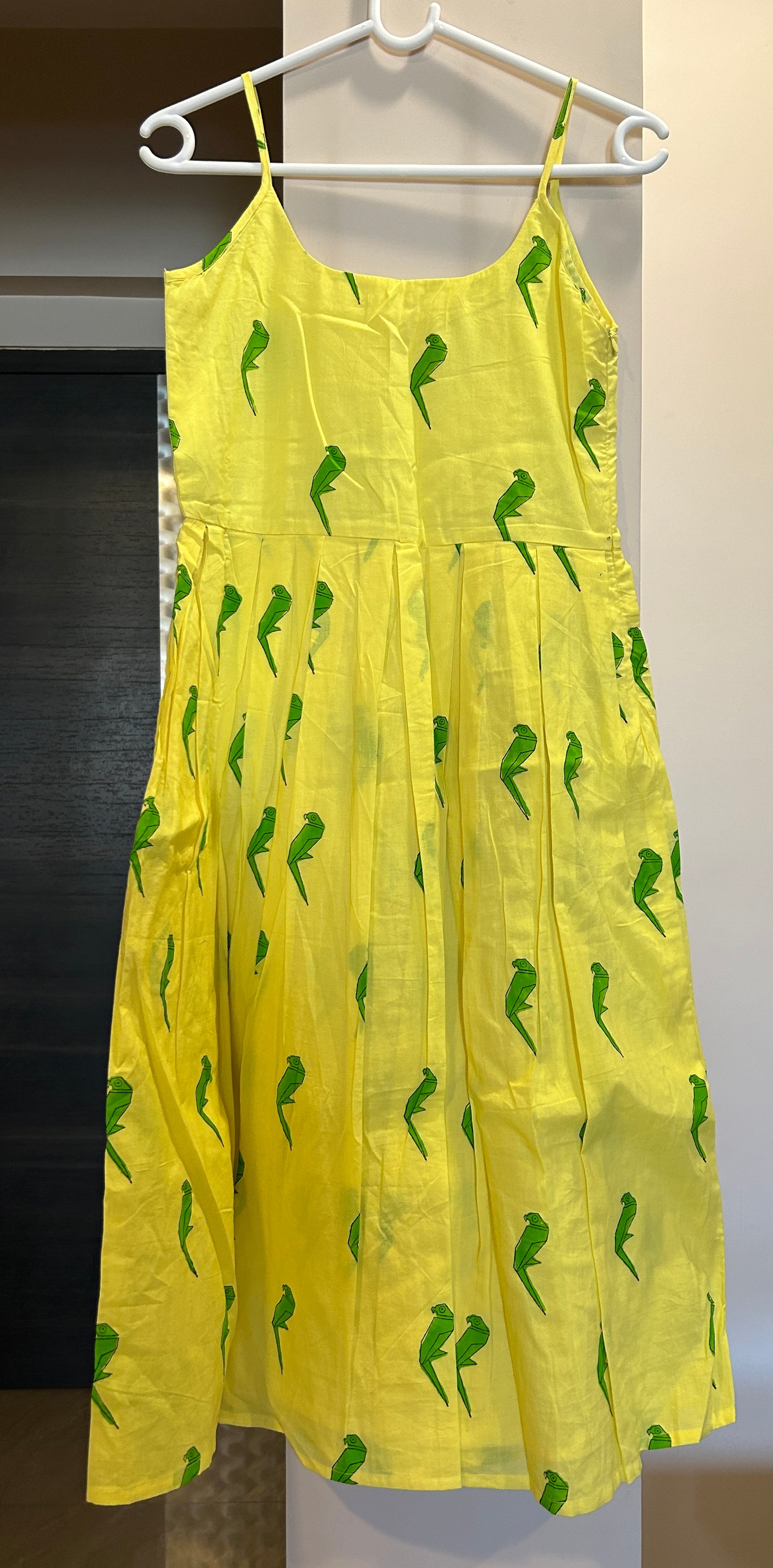 Adult Dress: Our most Favourite Print & Style! The Origami Hand Block Print Parrot Adult & Kids Dress, crafted from 100% Mul cotton fabric. A thick strapped spaghetti with wide box pleats from the waist onwards, gives this dress a great fit and is a great option for Twinning.