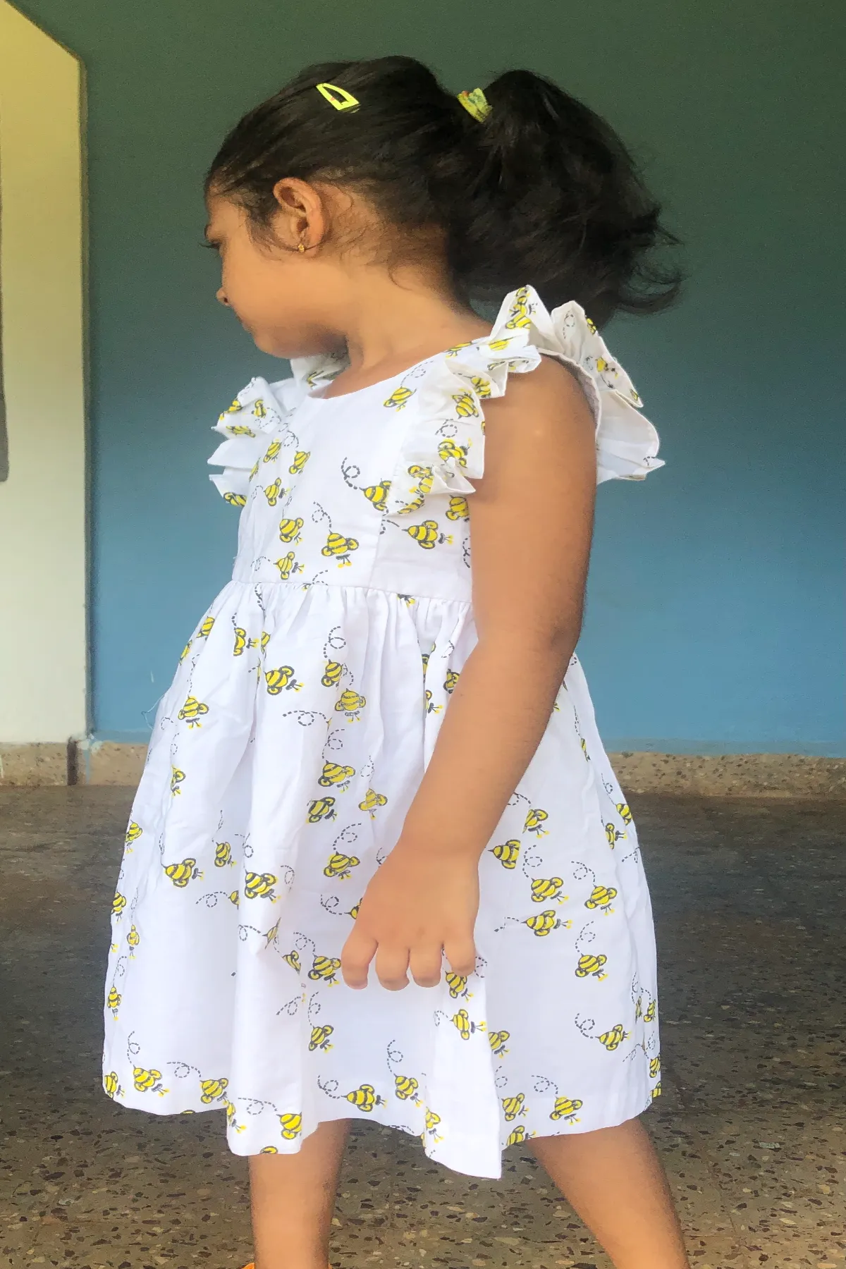 Adult Dress: Discover our Signature most favourite Bumblebee Hand Block Print Adult Dress, crafted from 100% Mul cotton fabric. Flutter sleeves with slight gathers at the waist, gives this dress a great fit, and to top it, we have cute front pockets. You could find something similar styled for your daughter, and a cute coord set for your son, perfect to twin with them!!!