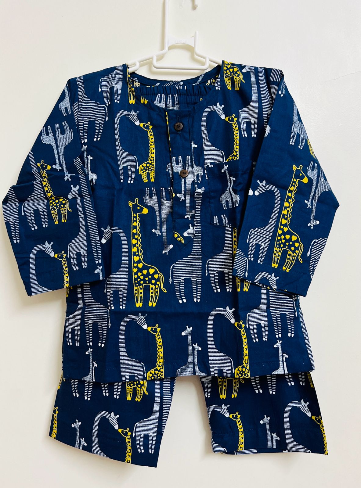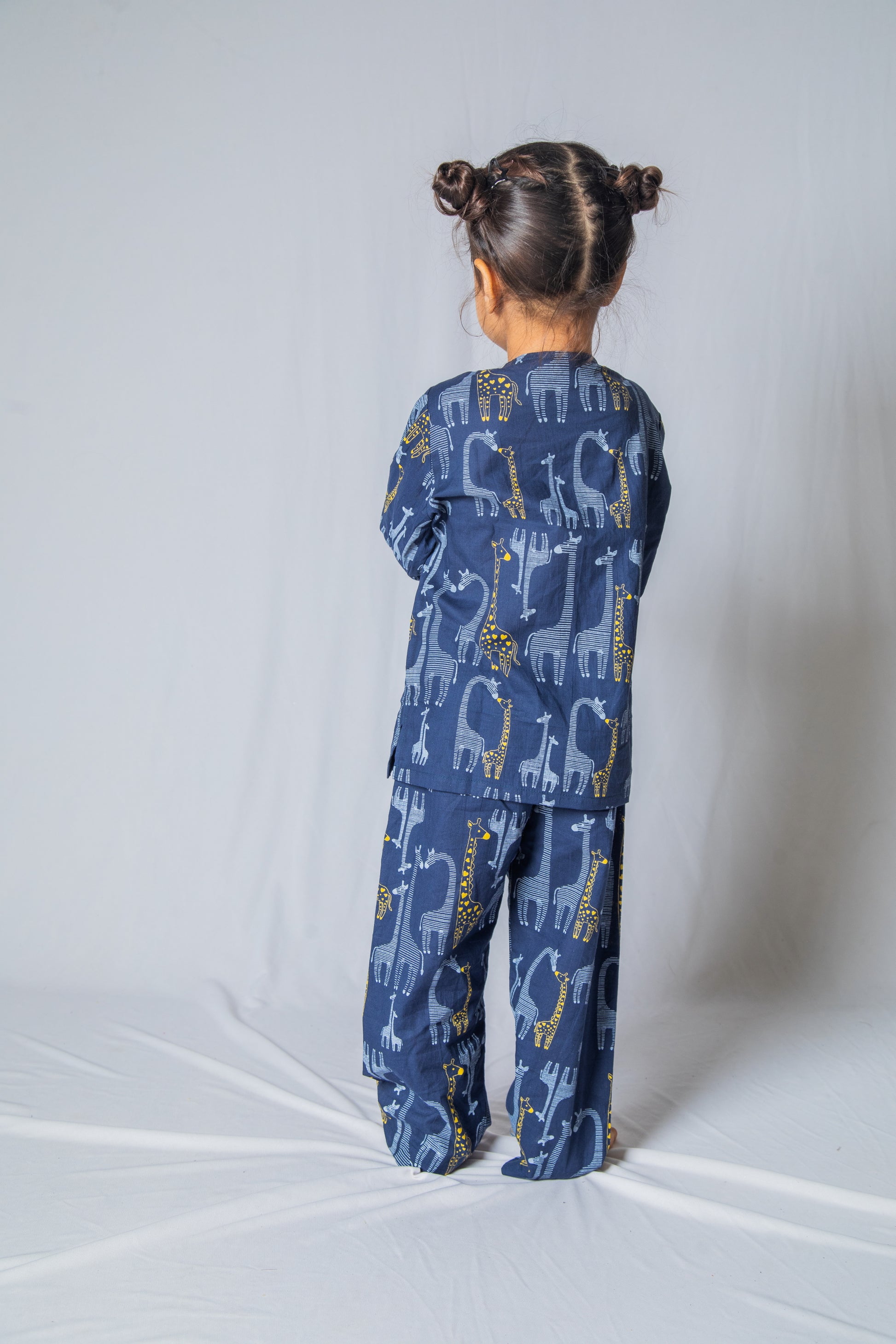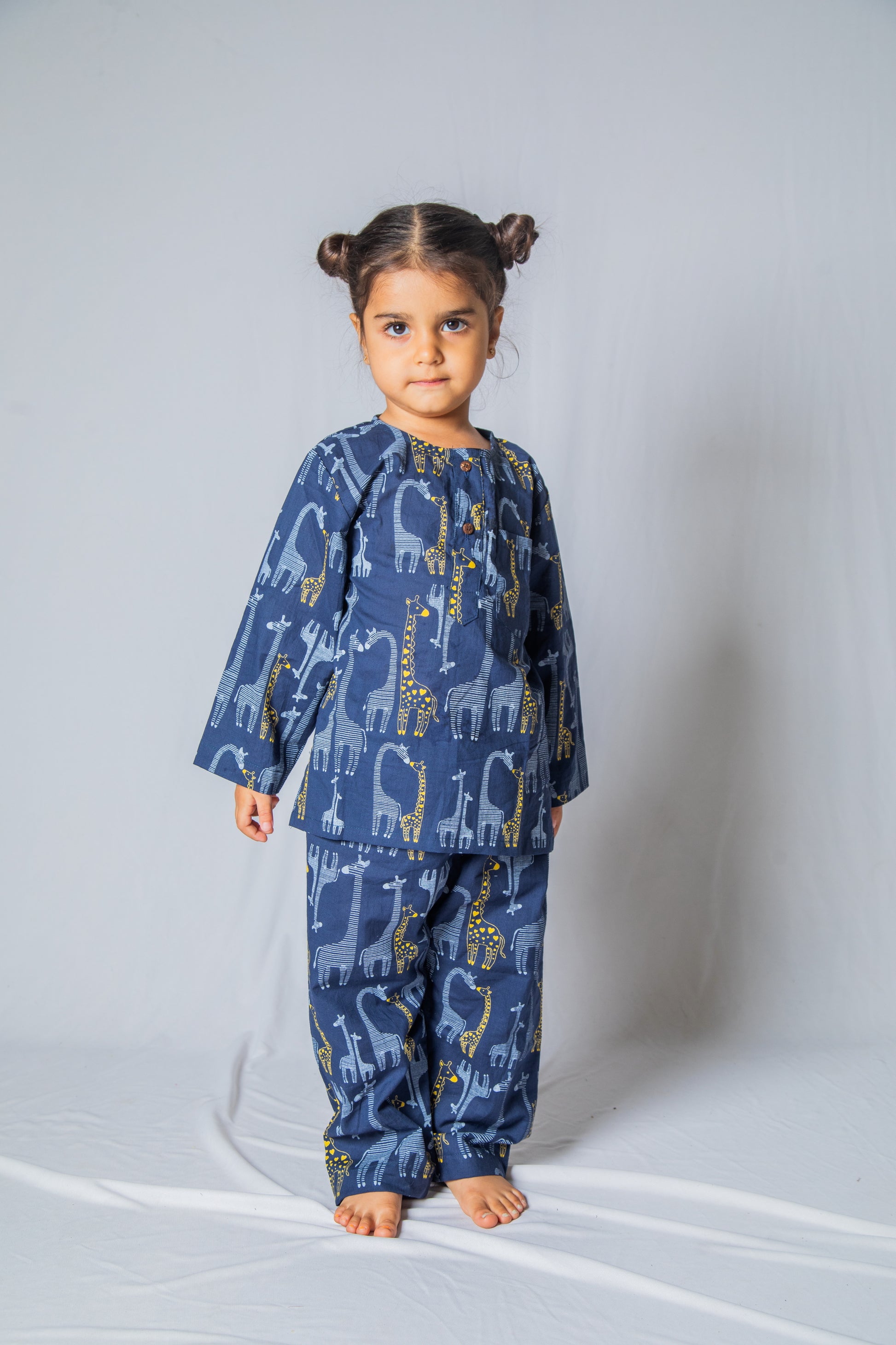 Sleep tight in our soft cotton mul night suit with giraffe print top and bottom set which is screen printed.