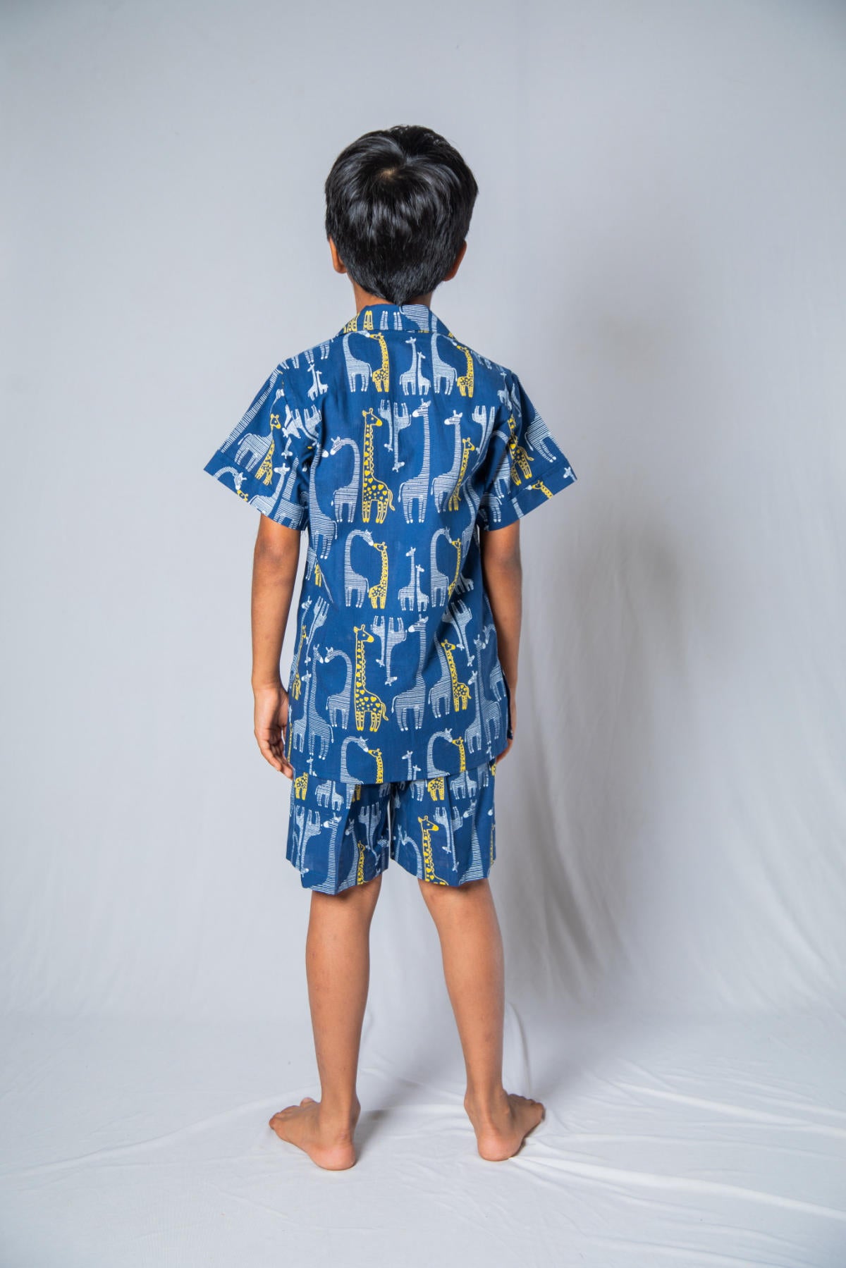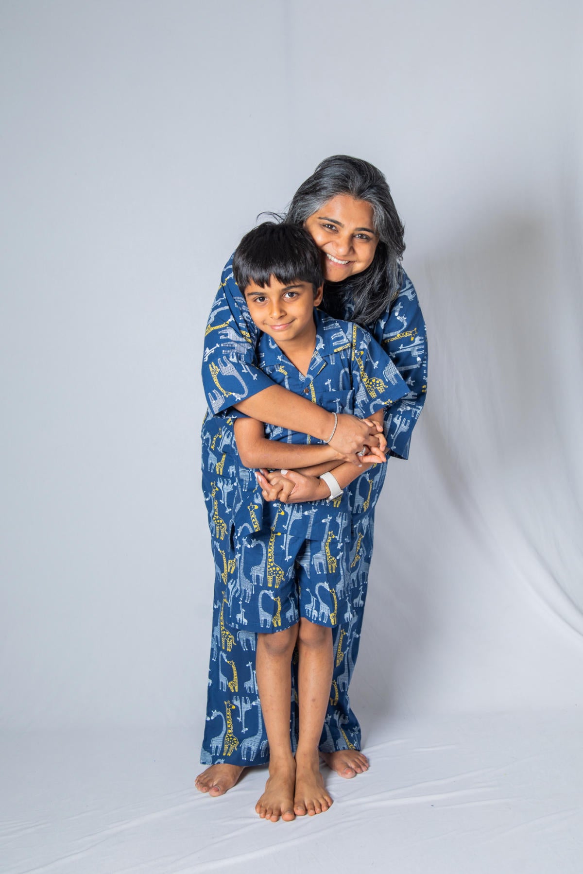 Adult dress: Embrace comfort and style with our indigo Giraffe Print Lounge Set. Made from 100% sustainable cotton, this super comfortable set features a playful day out or lounging at home, it includes a relaxed-fit top and half elastic waistband bottoms with side pockets.