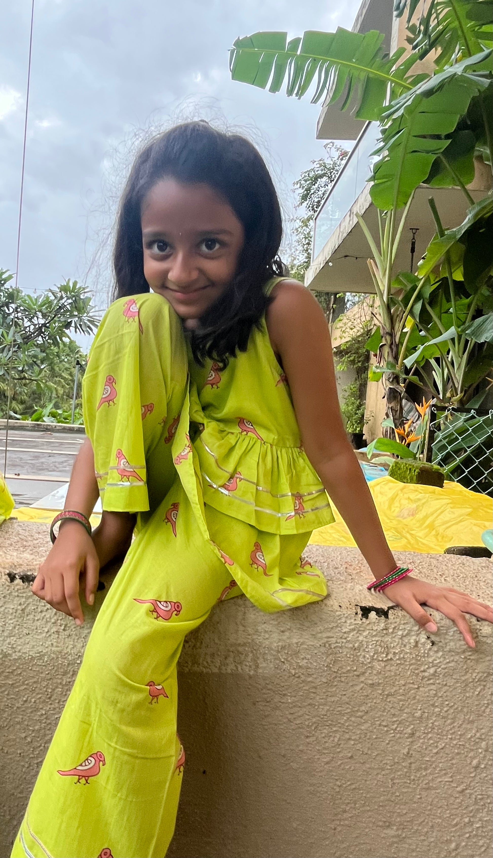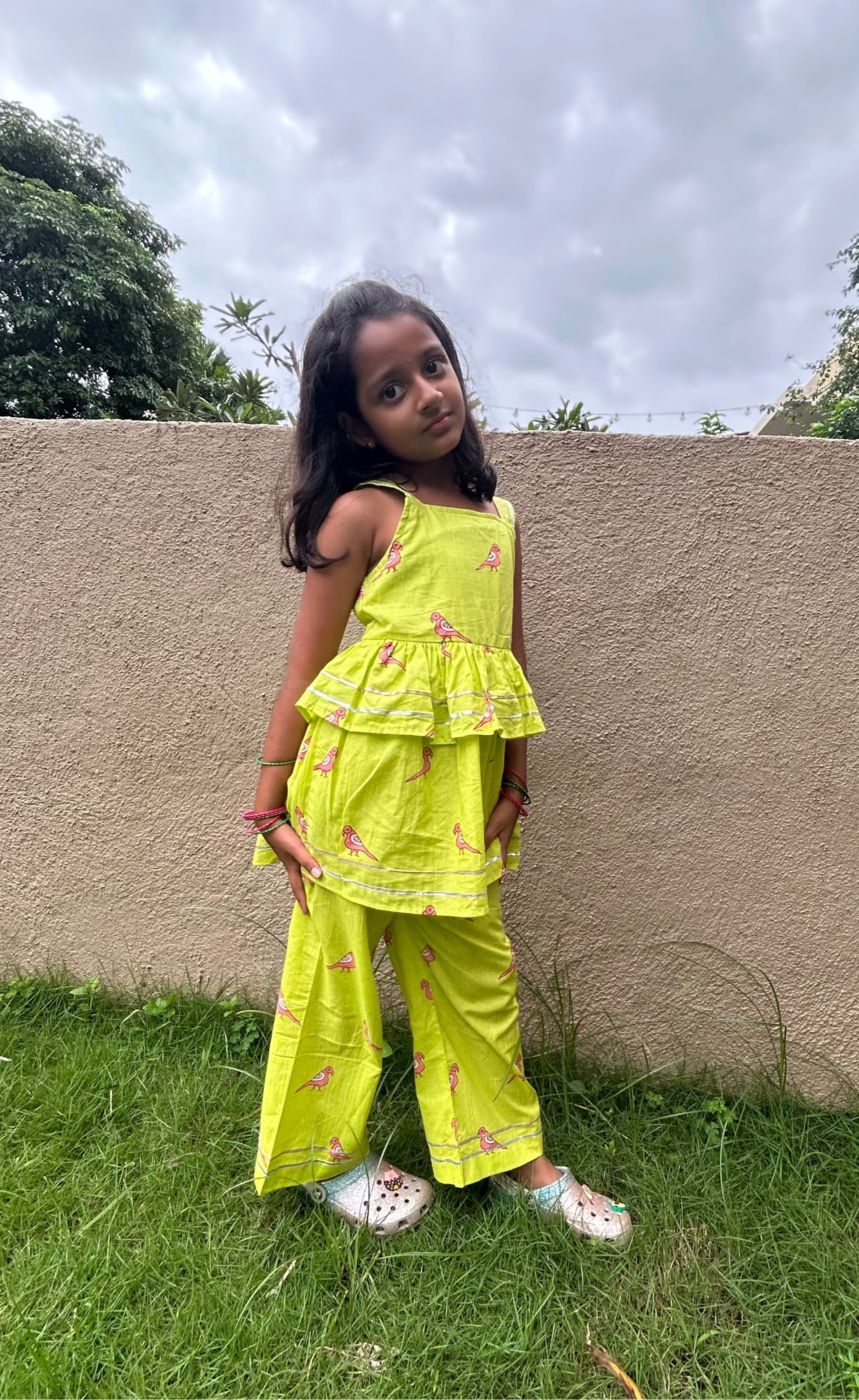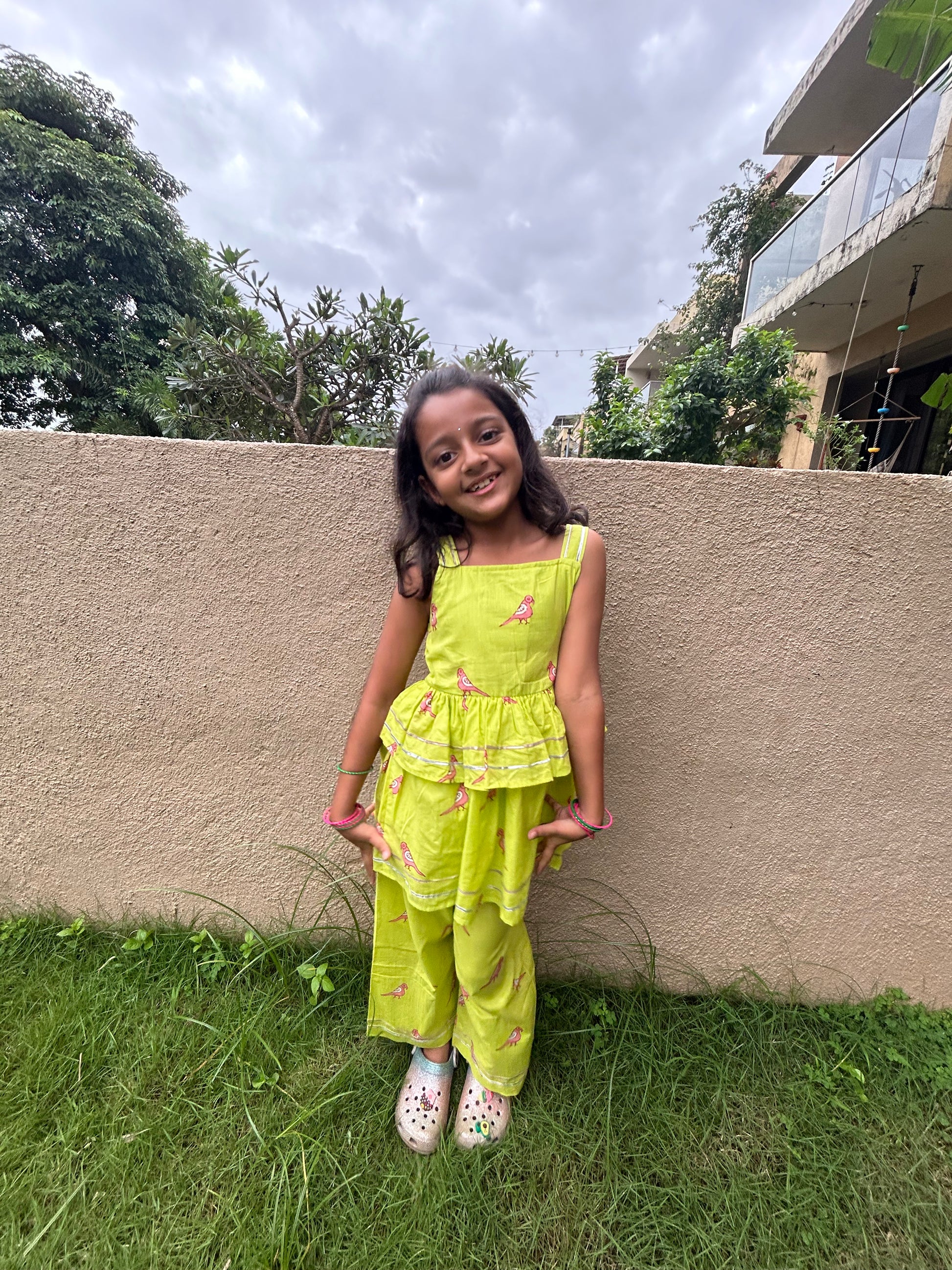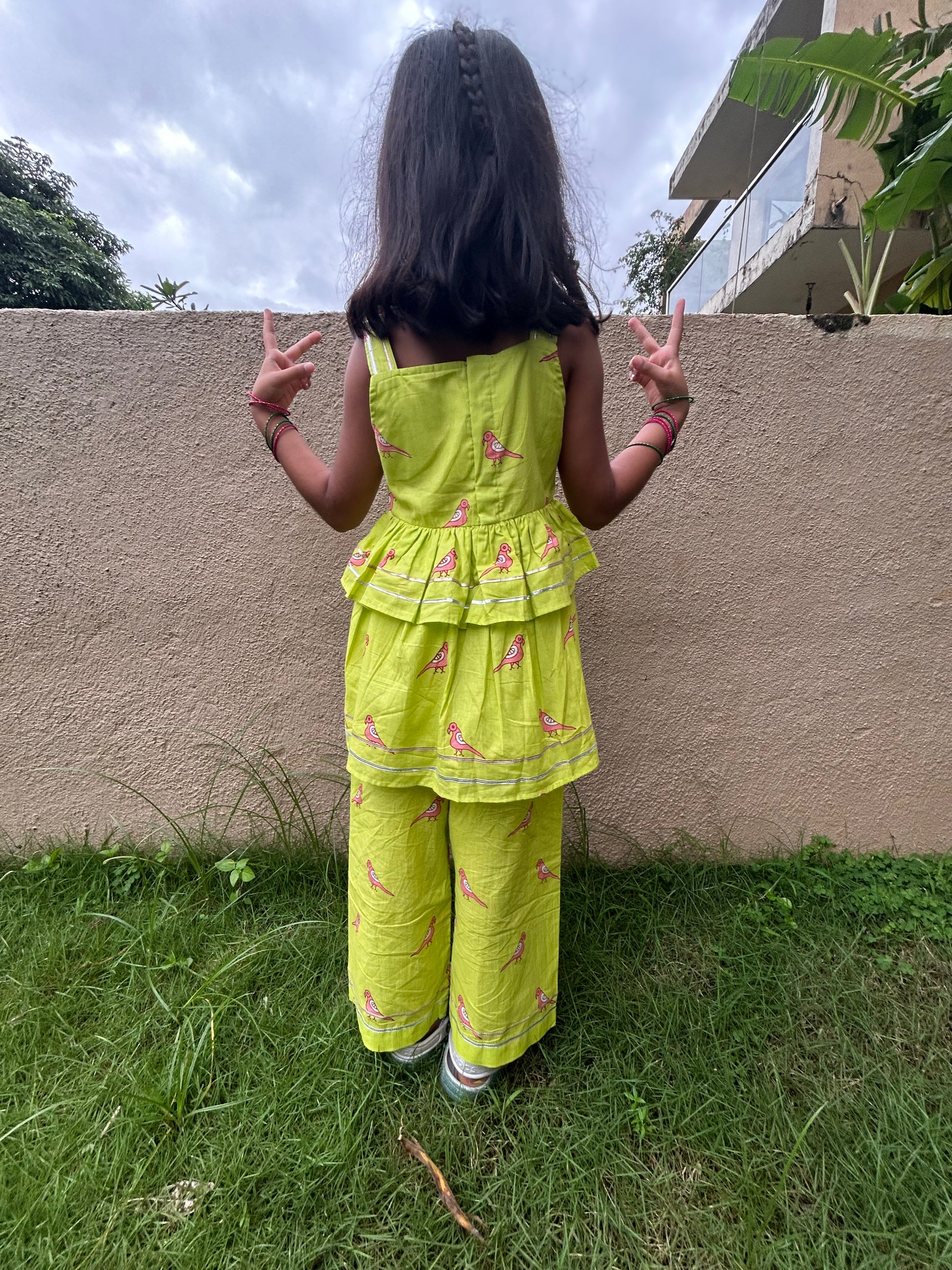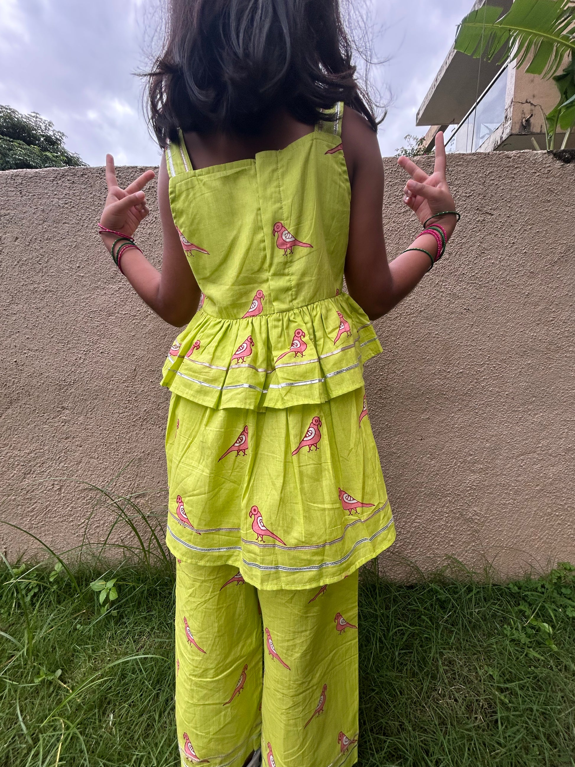 A stylish coord set for Girls in our Bright Green with Pink Parrots print, featuring a two layers top and matching pants with some gota patti detailing. The outfit blends Indo western style with screen-print, crafted from 100% cotton for comfort and breathability. Perfect for a unique Festive look!