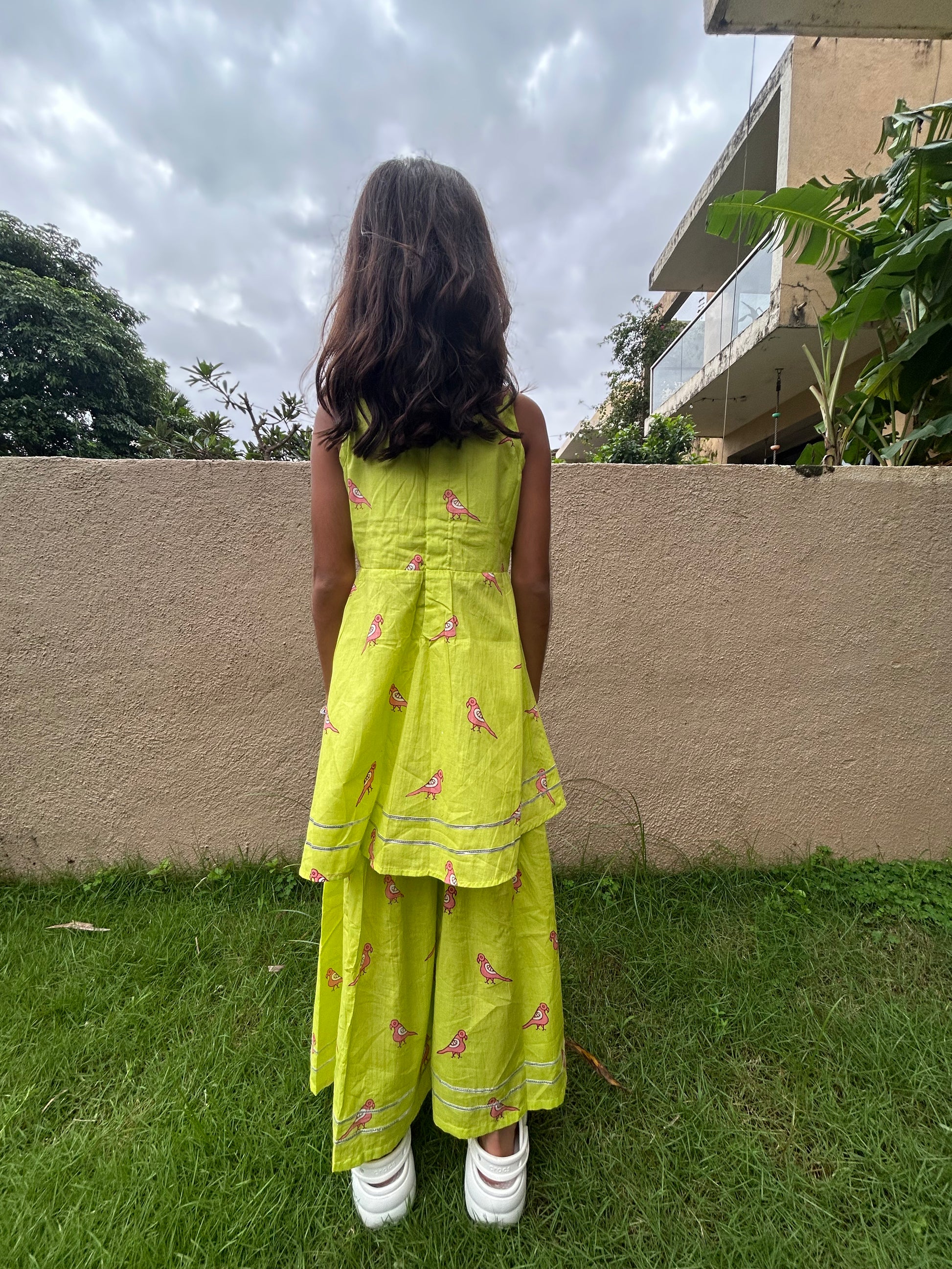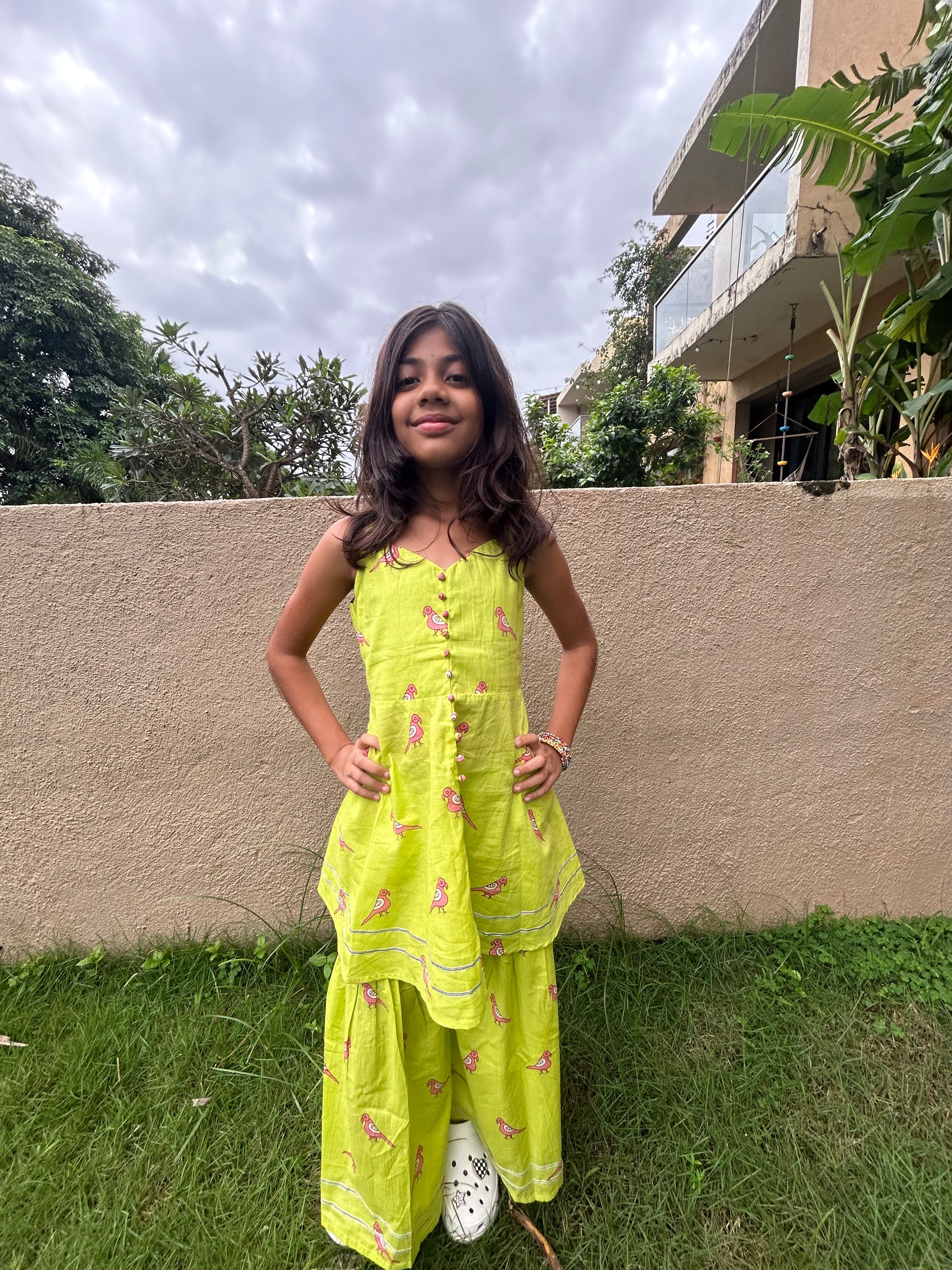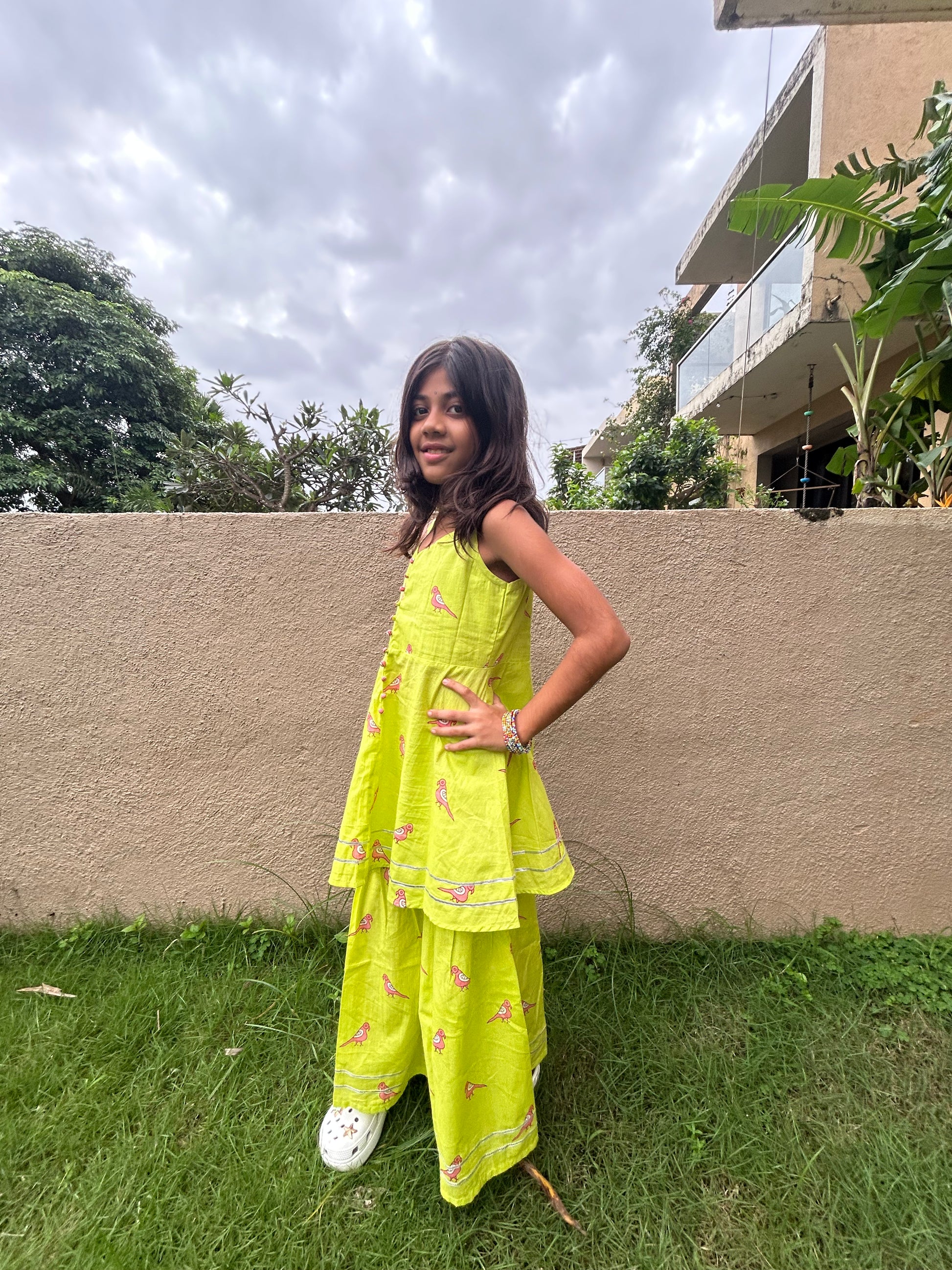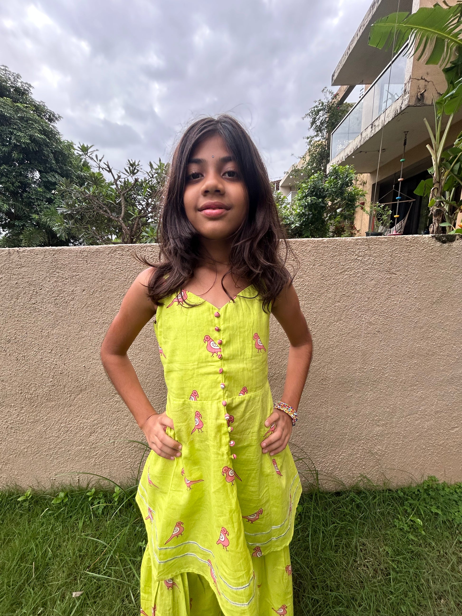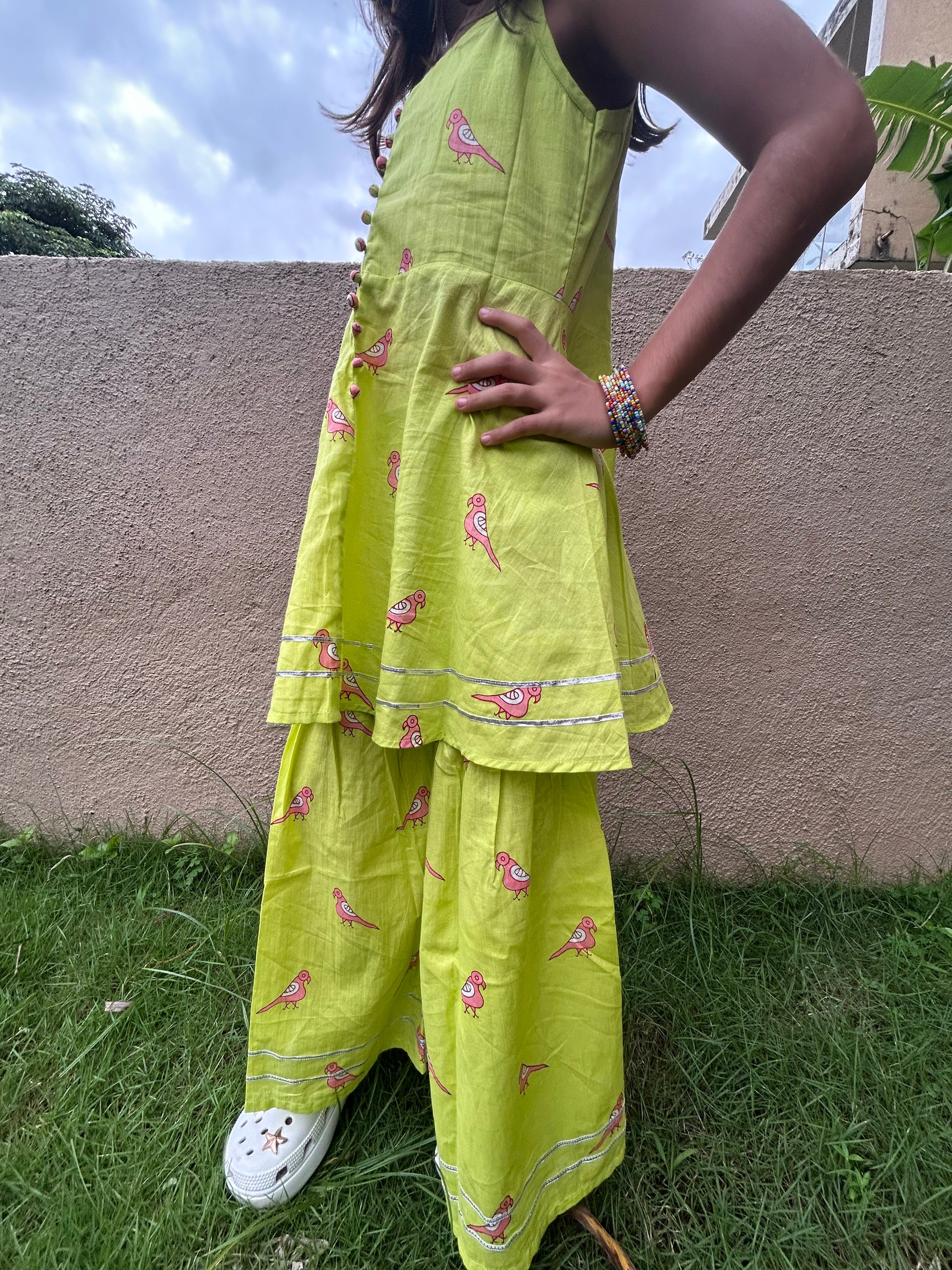 Brighten up the festive occasions with this beautiful Pink Parrots on bright Green based cotton fabric, knee-length umbrella styled kurta and sharara set for girls. Made with 100% cotton, combining comfort and elegance for a stylish traditional look.