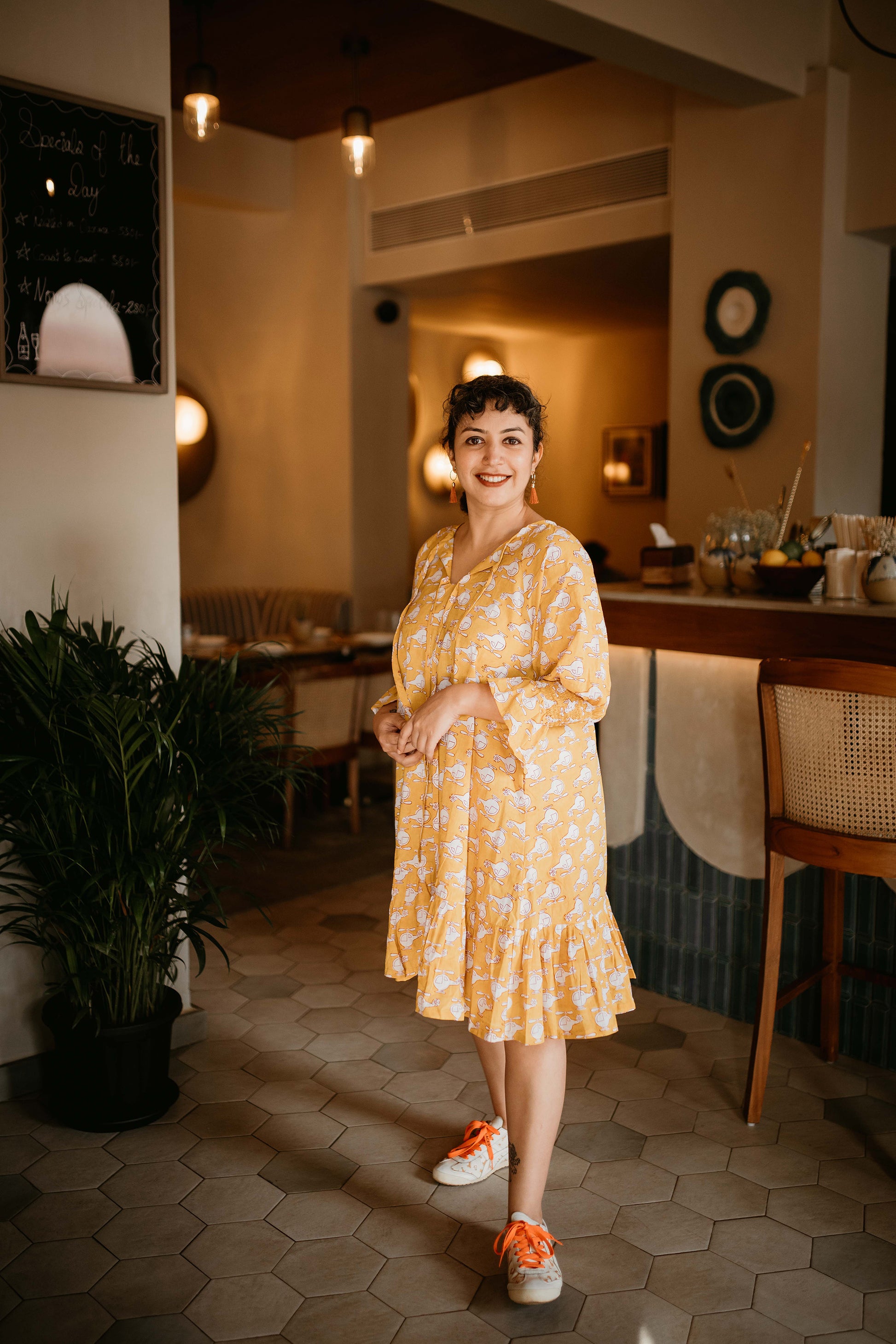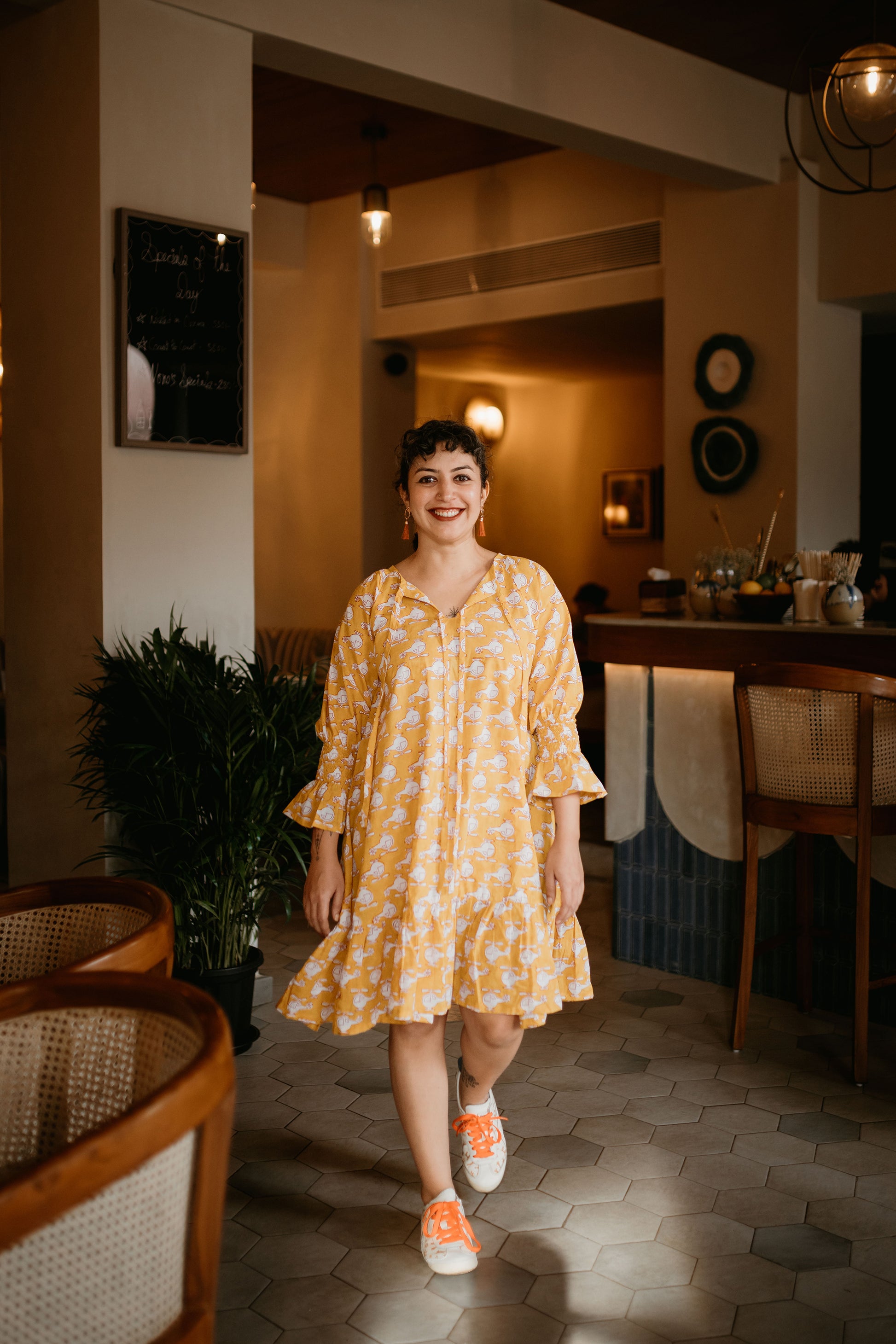Adult Dress: Stand out with our cute Helicopter Print Dress! Crafted from 100% premium cotton and hand block printed, this dress features our most loved style, "The Flowy, Elastic Sleeved Dress" that adds a touch of elegance to this playful design. Perfect for casual outings!