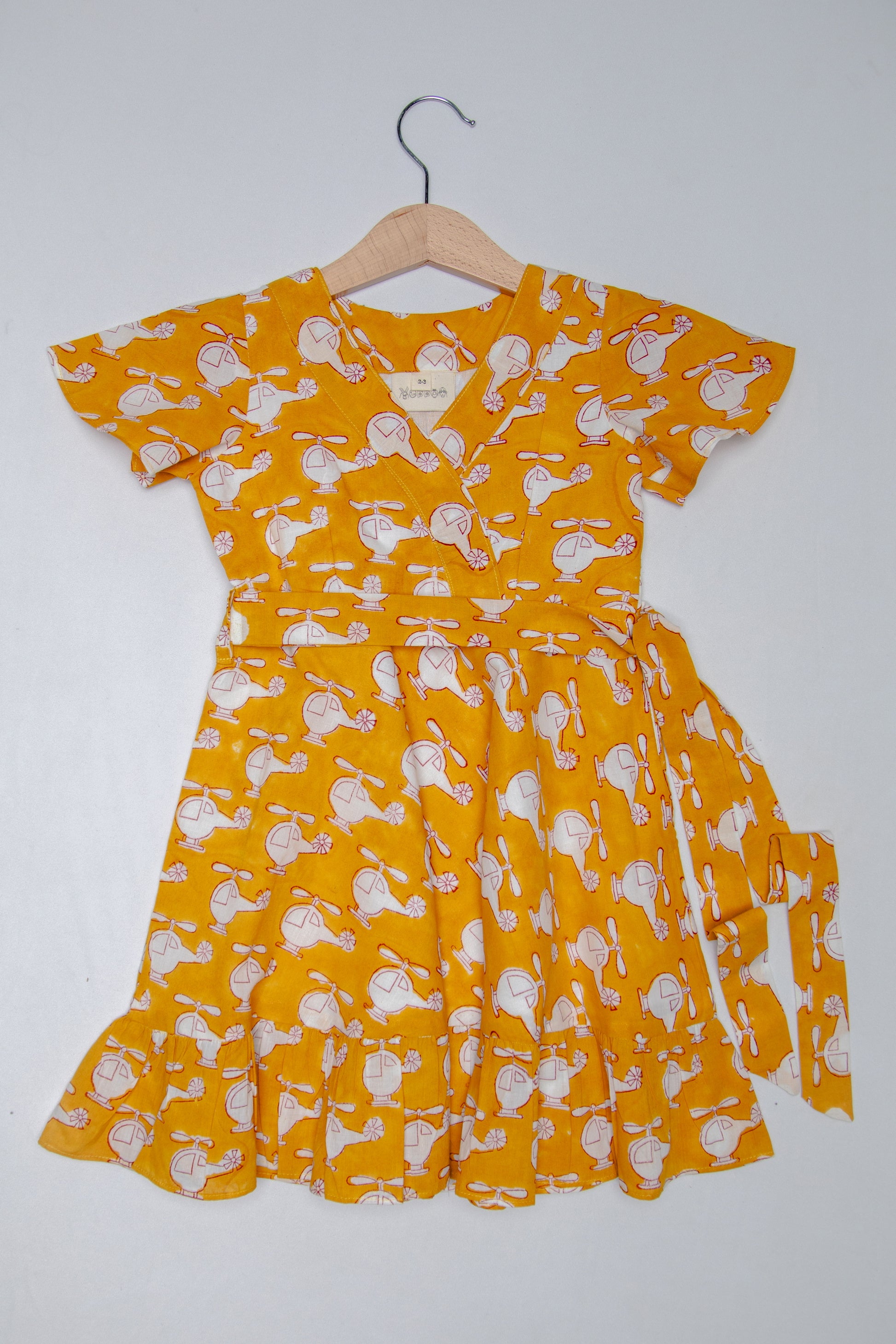 This pretend wrap styled dress featuring adorable helicopter prints is perfect for little trendsetters who love to stand out. Crafted with care and love.