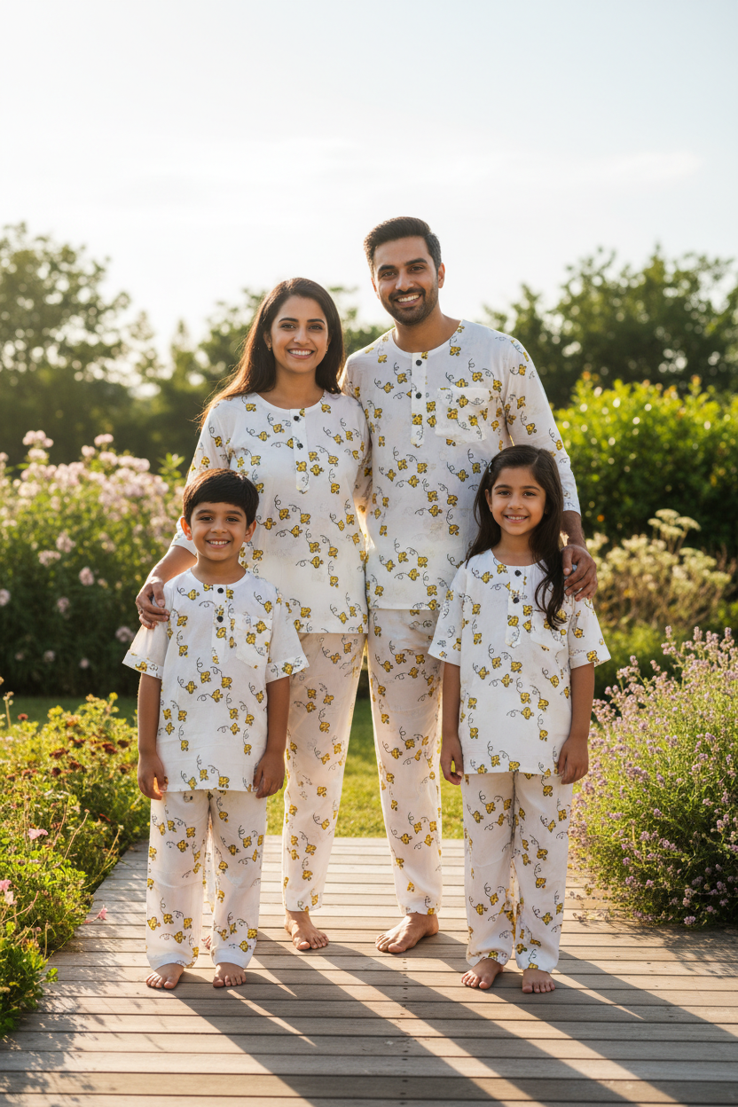 Adult Jammies: Embrace comfort and style with our super cute Honeybee print Pajama Set. Made from 100% cotton,hand-block printed, this super comfortable set is perfect for cozy night snuggles with your little! A relaxed-fit kurta pajama style with elastic waisted pajamas and side pockets.