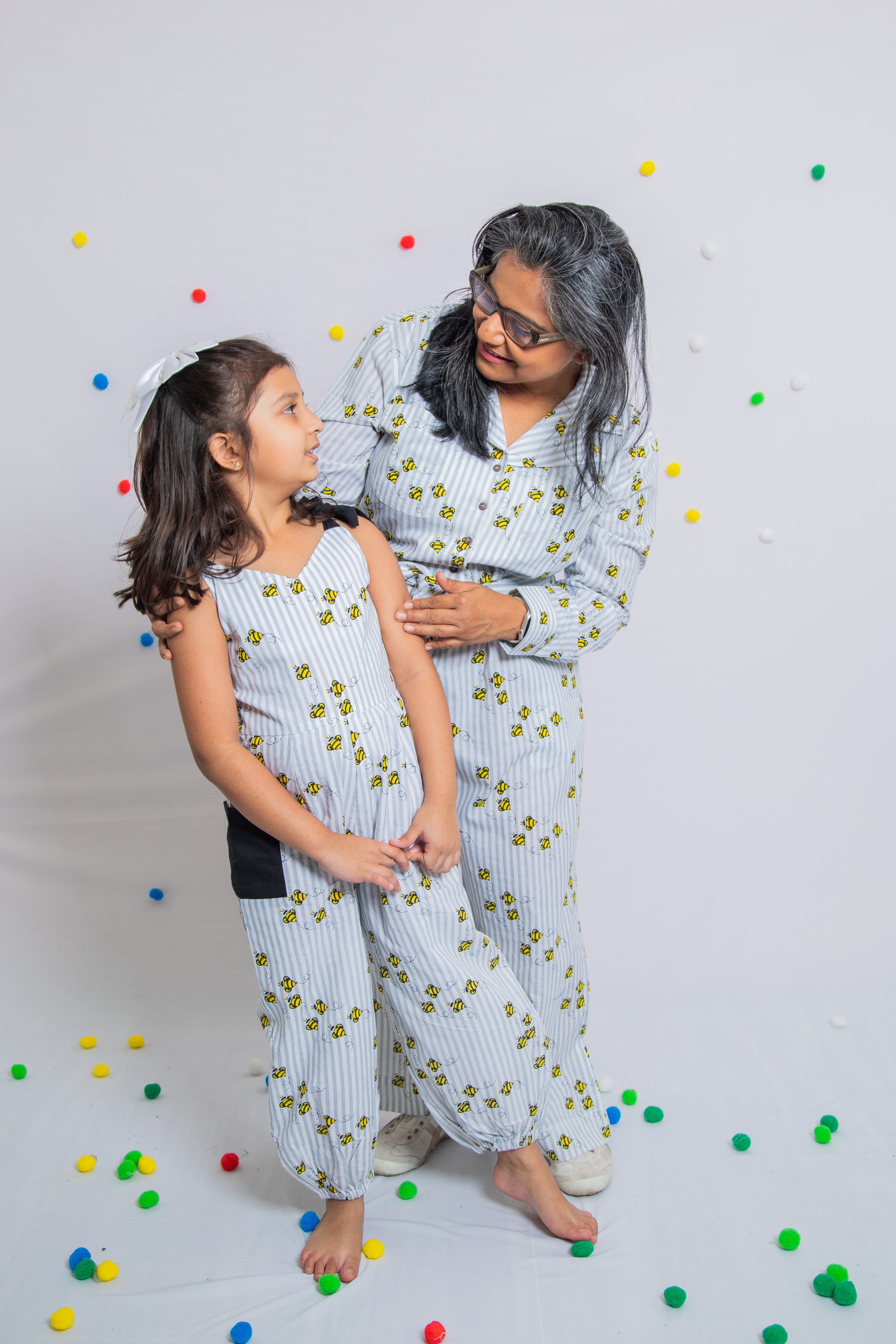 Elevate your wardrobe with our Shirt collar style full sleeve Jumpsuit made from 100% sustainable cotton.Featuring grey stripes with cute honeybees screen-printed, this jumpsuit boasts an interesting print with a comfortable fit.