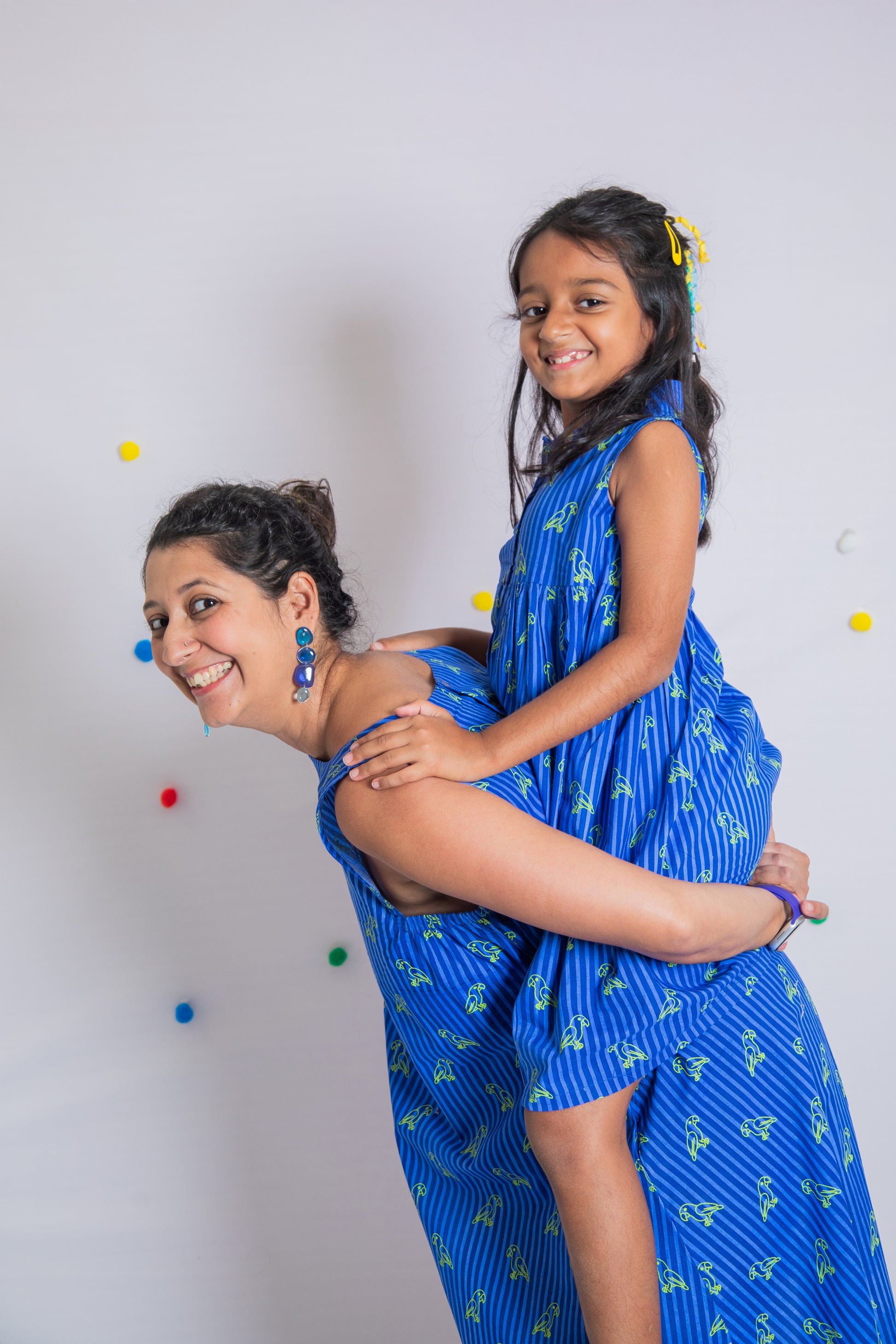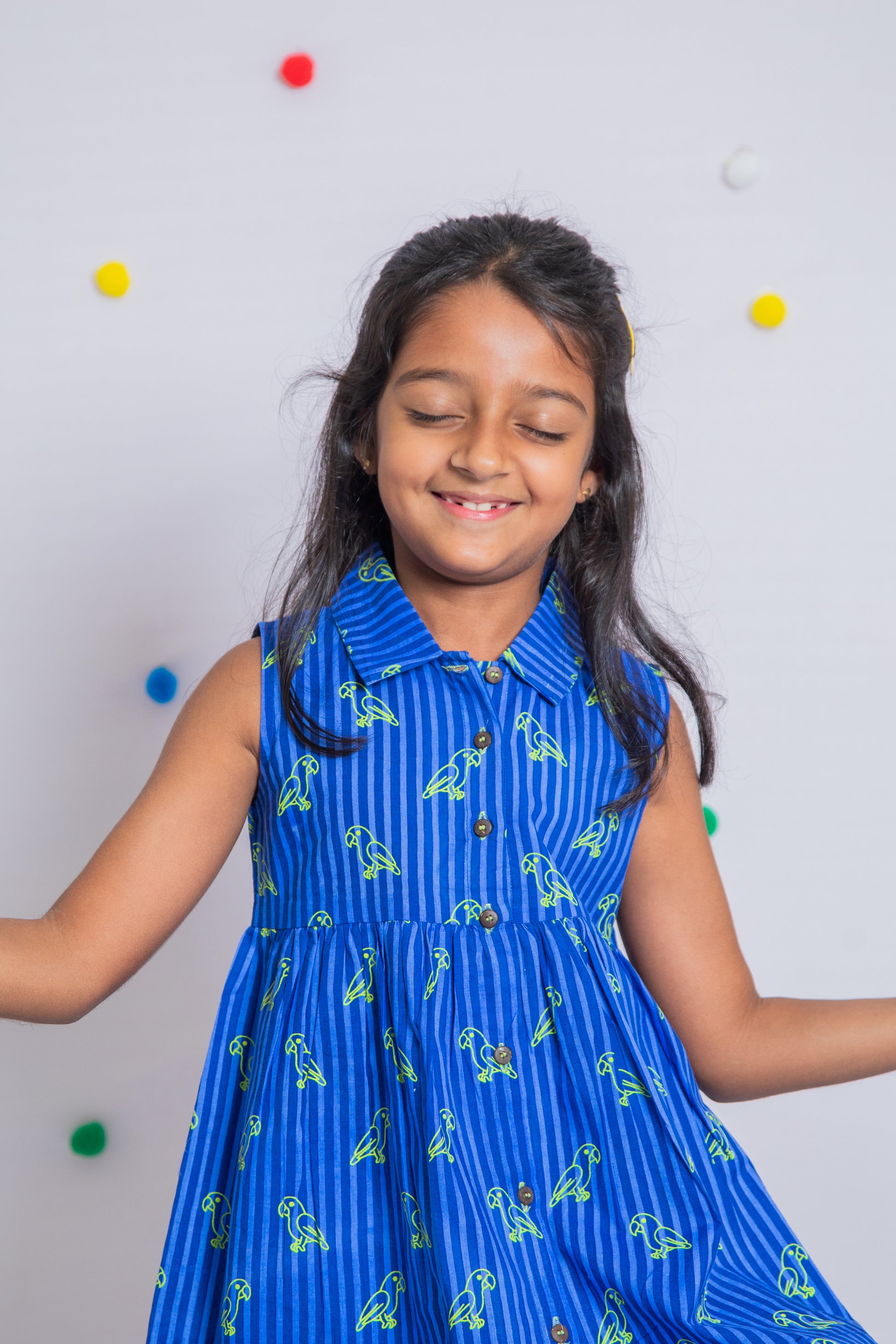 Say hello to our charming Neon Parrot Collar Style Dress- a burst of color and fun! Handmade from 100% cotton and screen-printed with love, this dress features a vibrant blue striped backdrop sprinkled with bright neon parrots. Designed for all-day twirls and adventures.