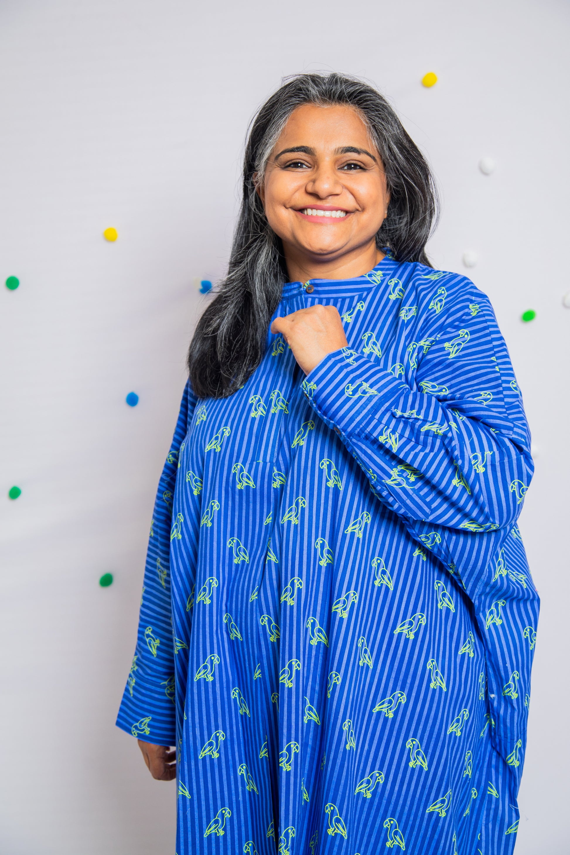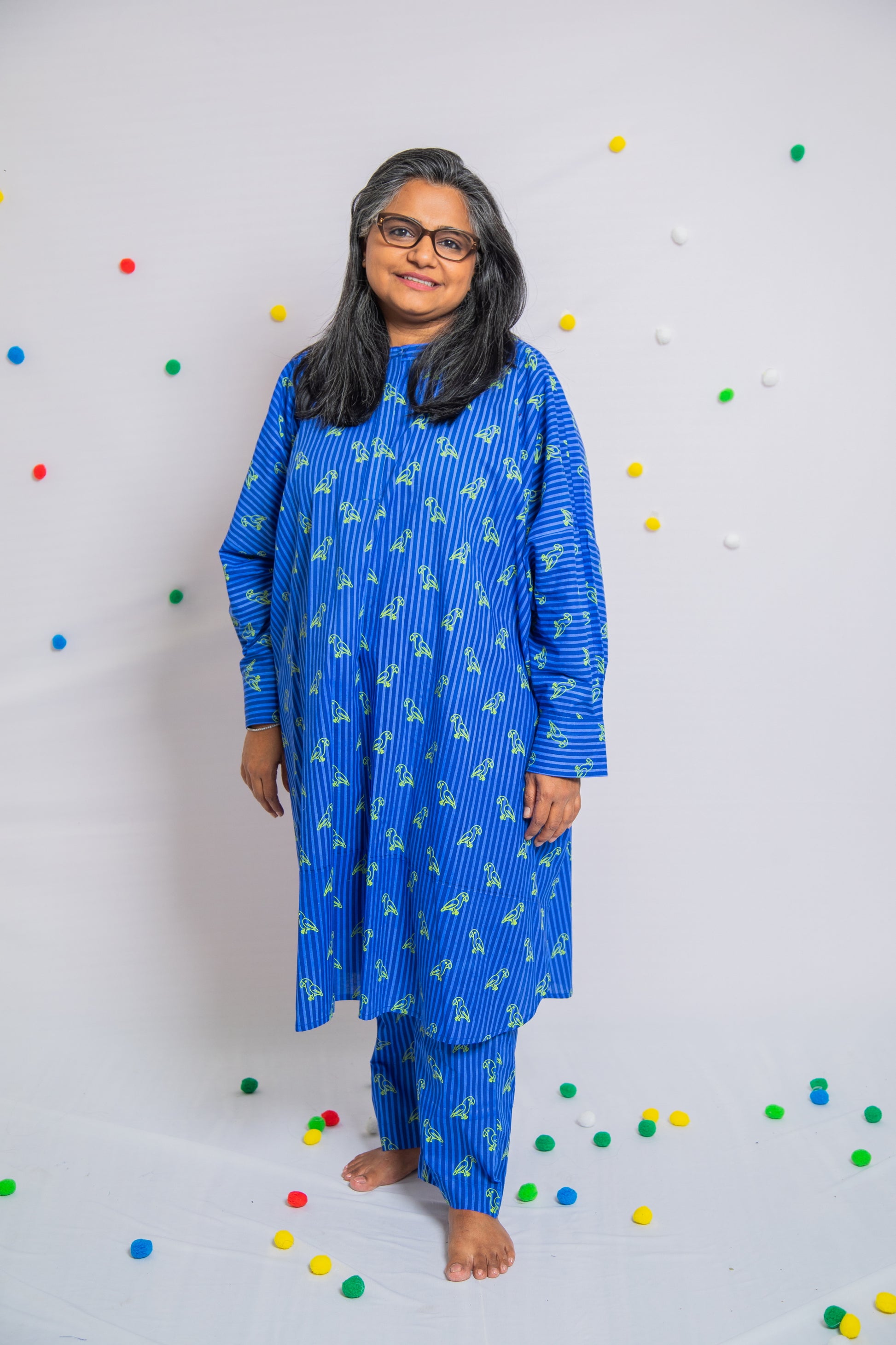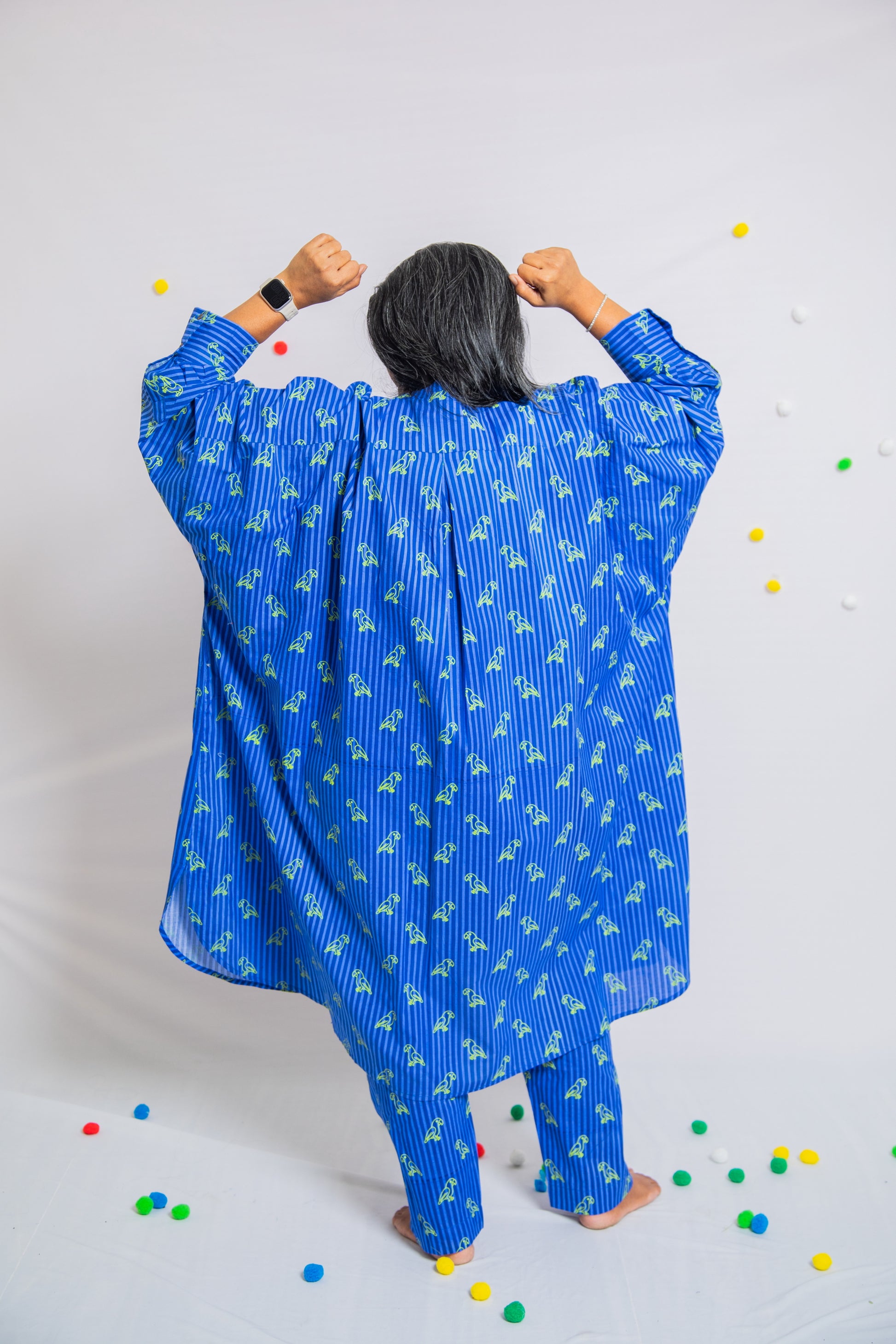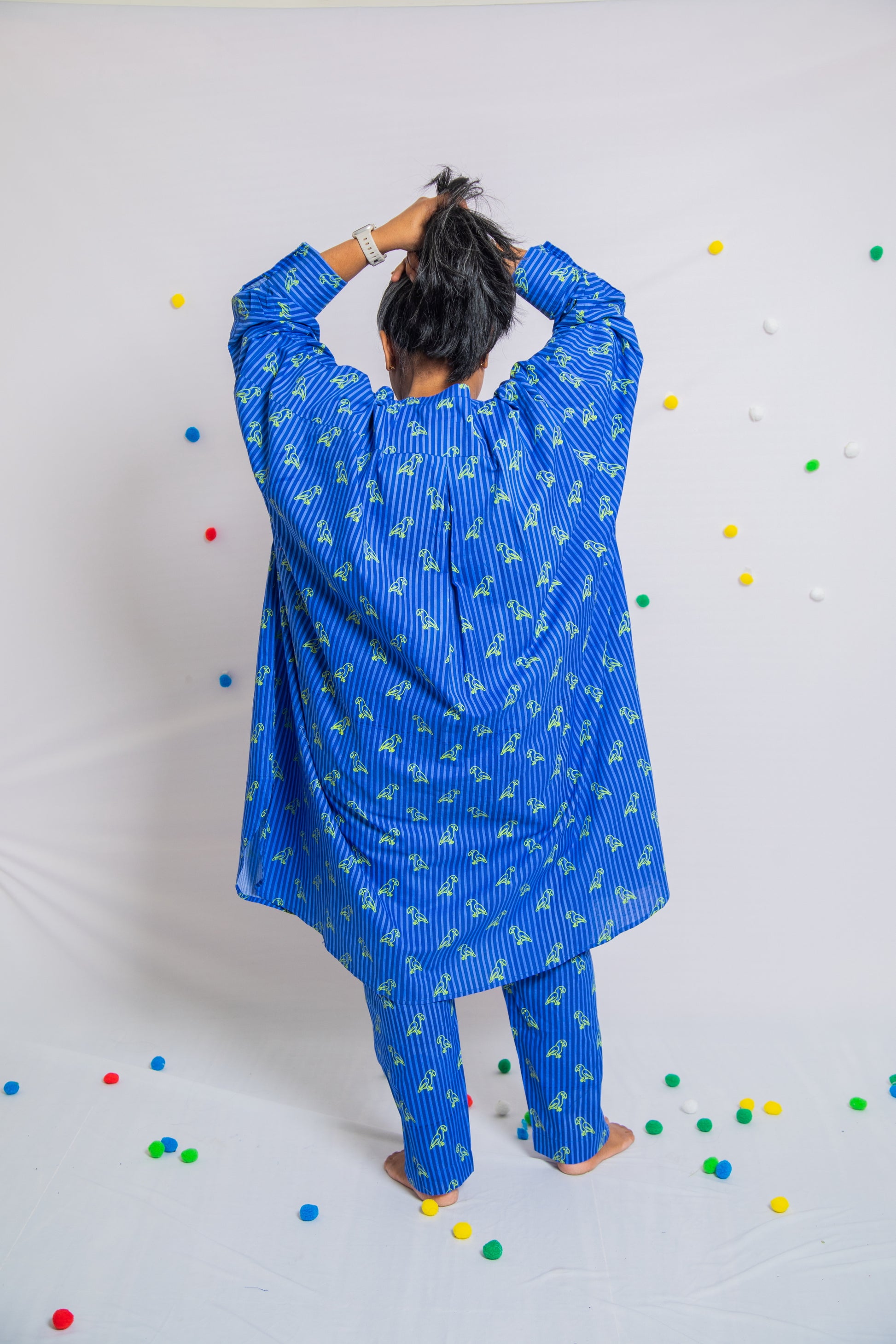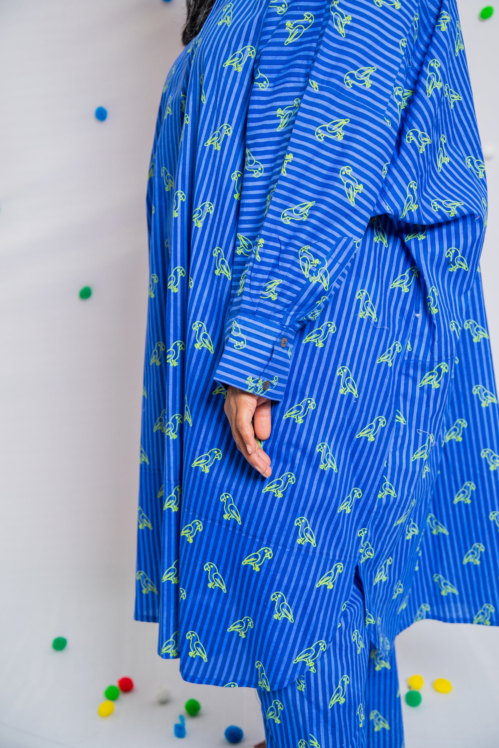 Adult Co-ord set: Make a vibrant statement with our Bright Blue stripes background with Neon Parrots Coord Set! Made with 100% cotton, this screen-printed set features an easy breezy style with a fun parrot design. The set includes a comfortable straight-fit pant and an anti-fit long kurta top with cuff full sleeves, offering a perfect blend of style and comfort for any casual outing.