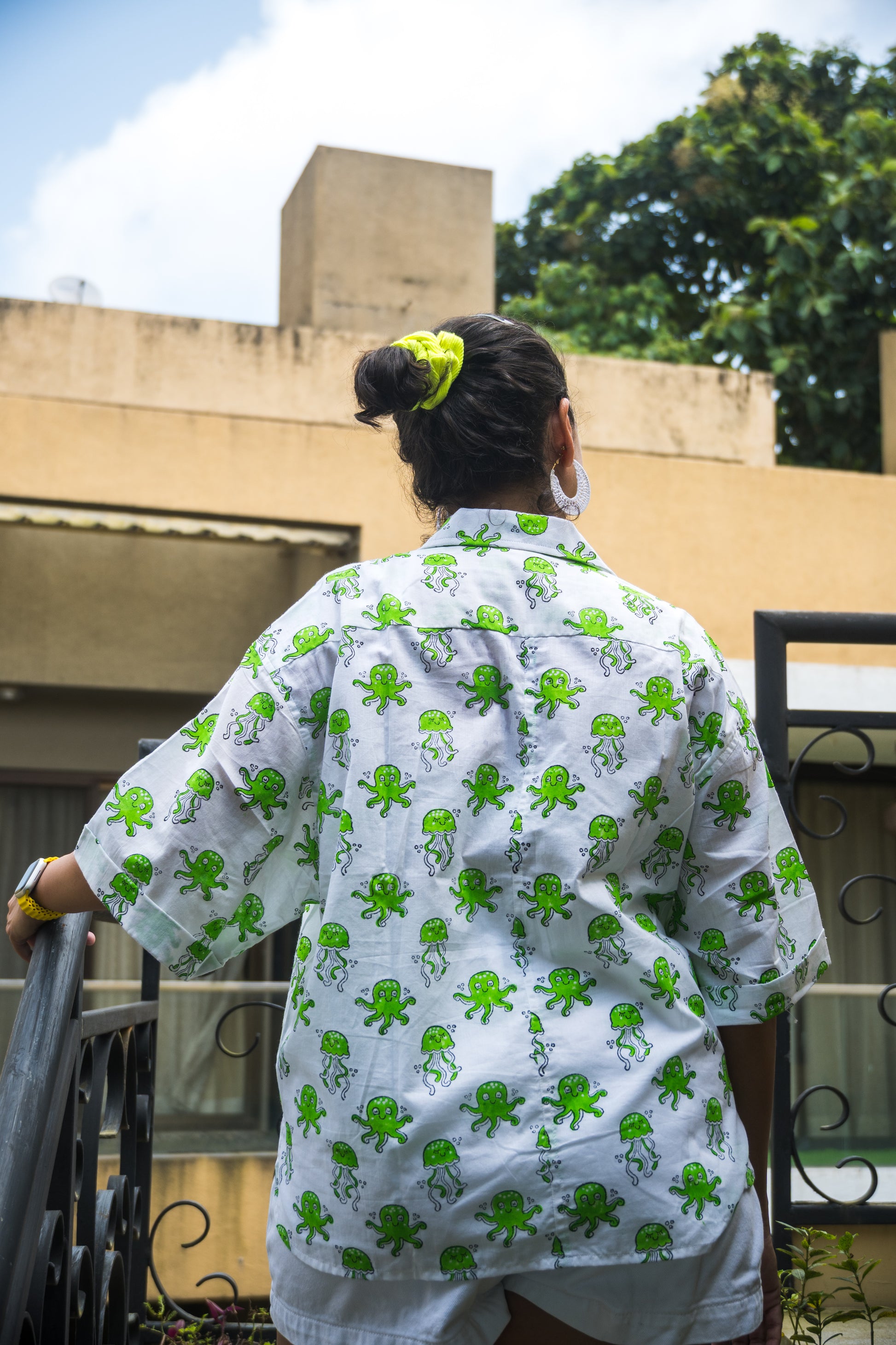 Adult Shirt: Embrace comfort and style with our Bright Neon Green Octopus & Jellyfish print Shirt. Made from 100% cotton, this super comfortable shirt can be paired with black or white shorts or pants and is perfect for a playful day out or lounging at home.