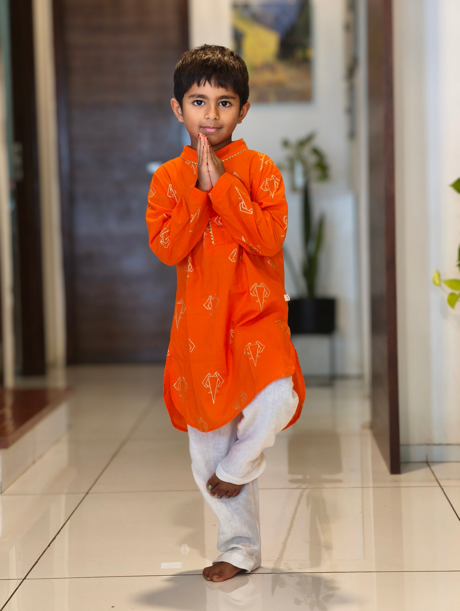 Dress your little one in this beautiful Orange Ganpati print festive set, made from 100% cotton for all-day comfort. Featuring a bright orange cotton fabric with cute gold origami ganpatis, the kurta comes with a stylish button placket with triangle shaped gota patti detailing around it, with white cotton pants to offer a unique look. Perfect for a festive occasion which blends traditional elegance with playful details.