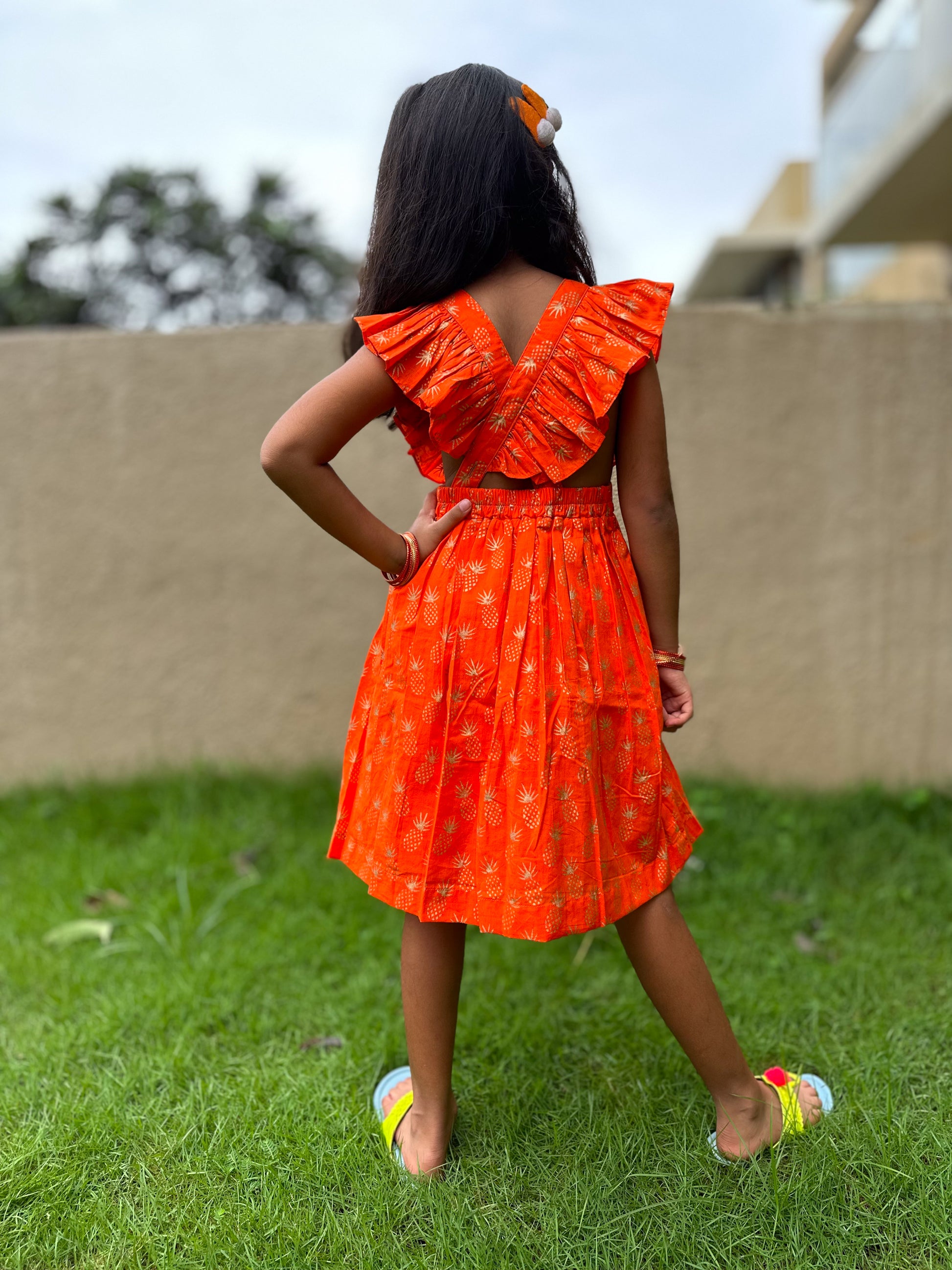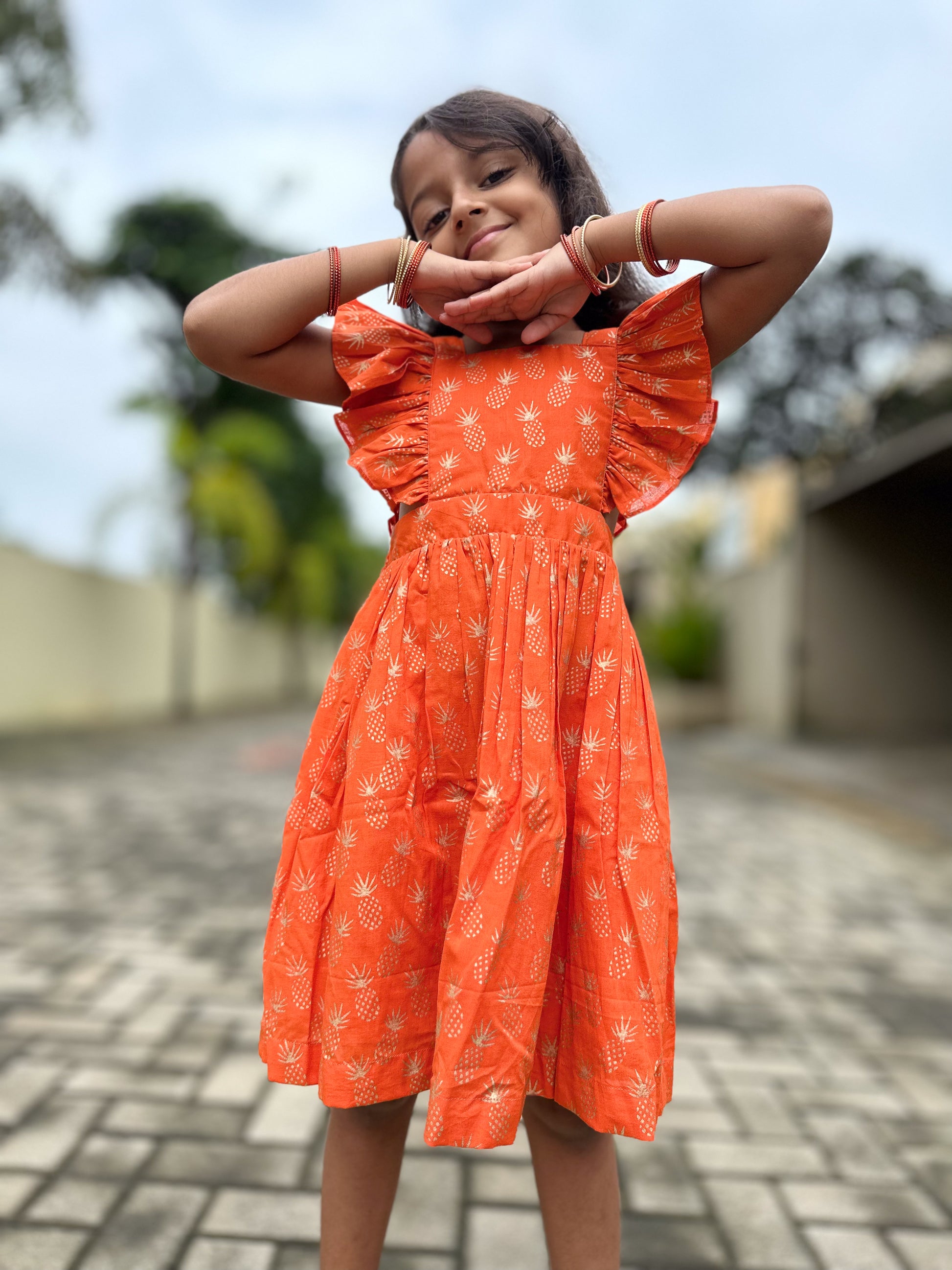 Flutter around in our Orange & Gold Parrot print Ruffle Dress which is full of charm. It has a super cute detailing of frills around the shoulder going upto the back.