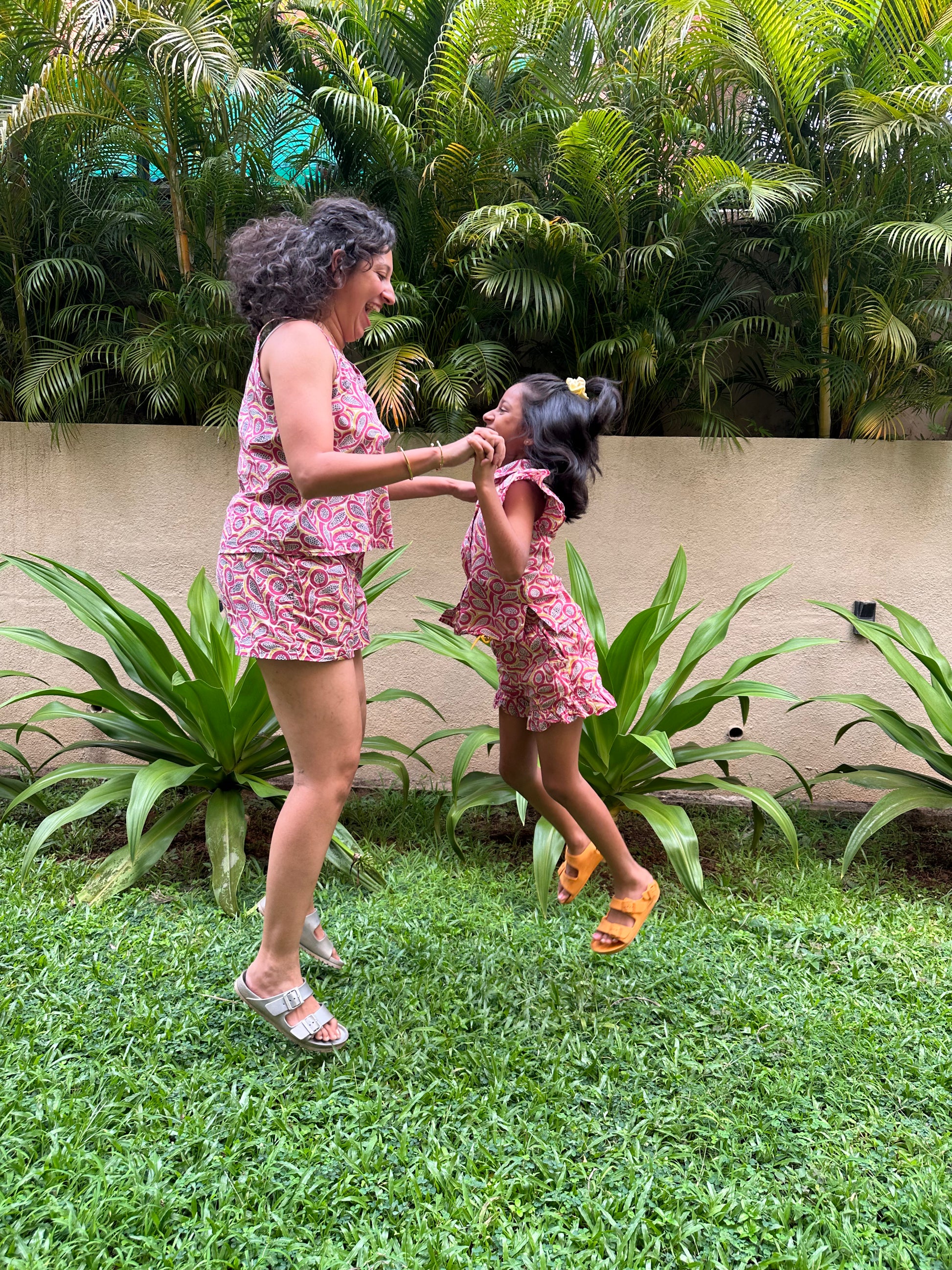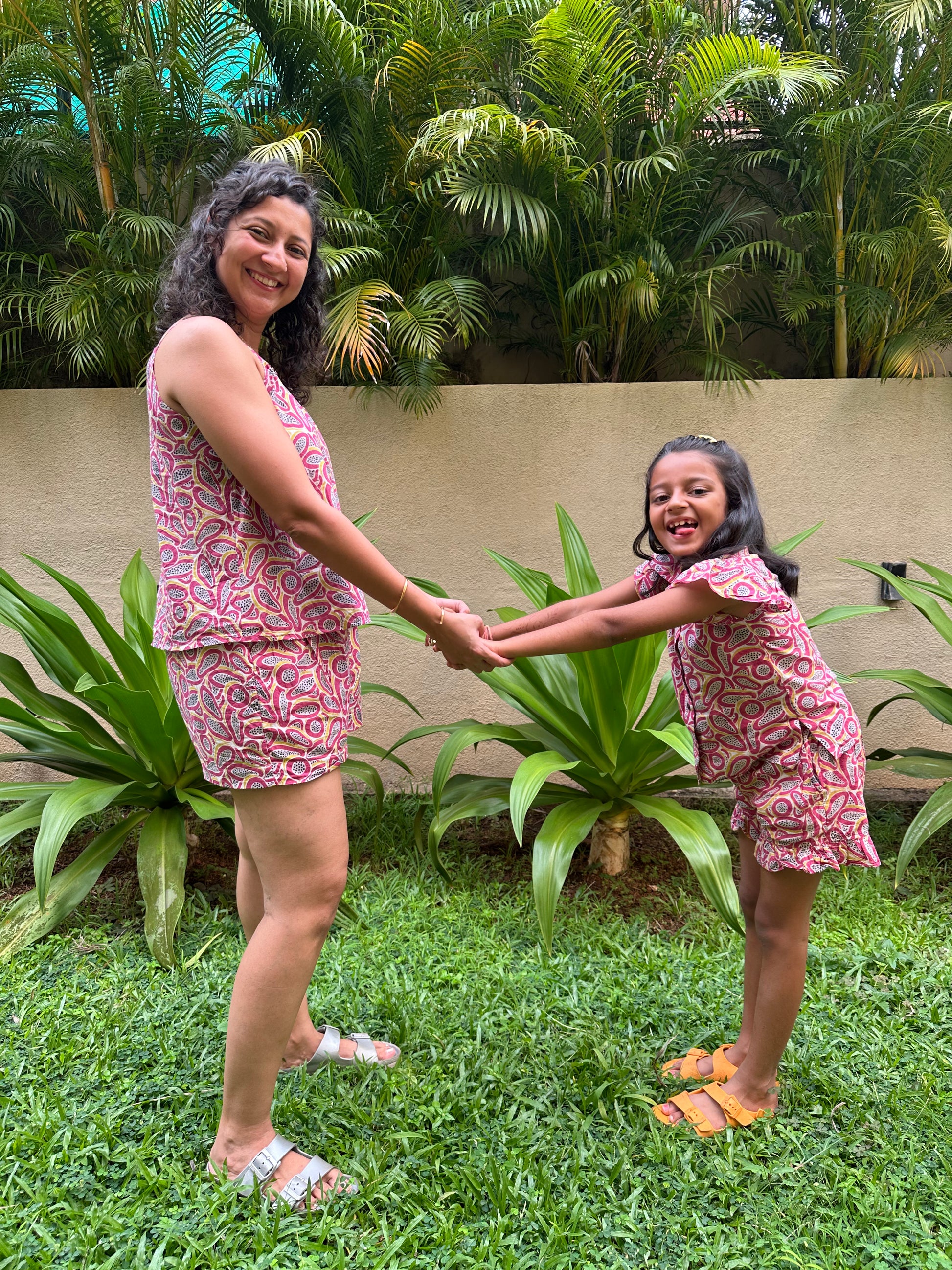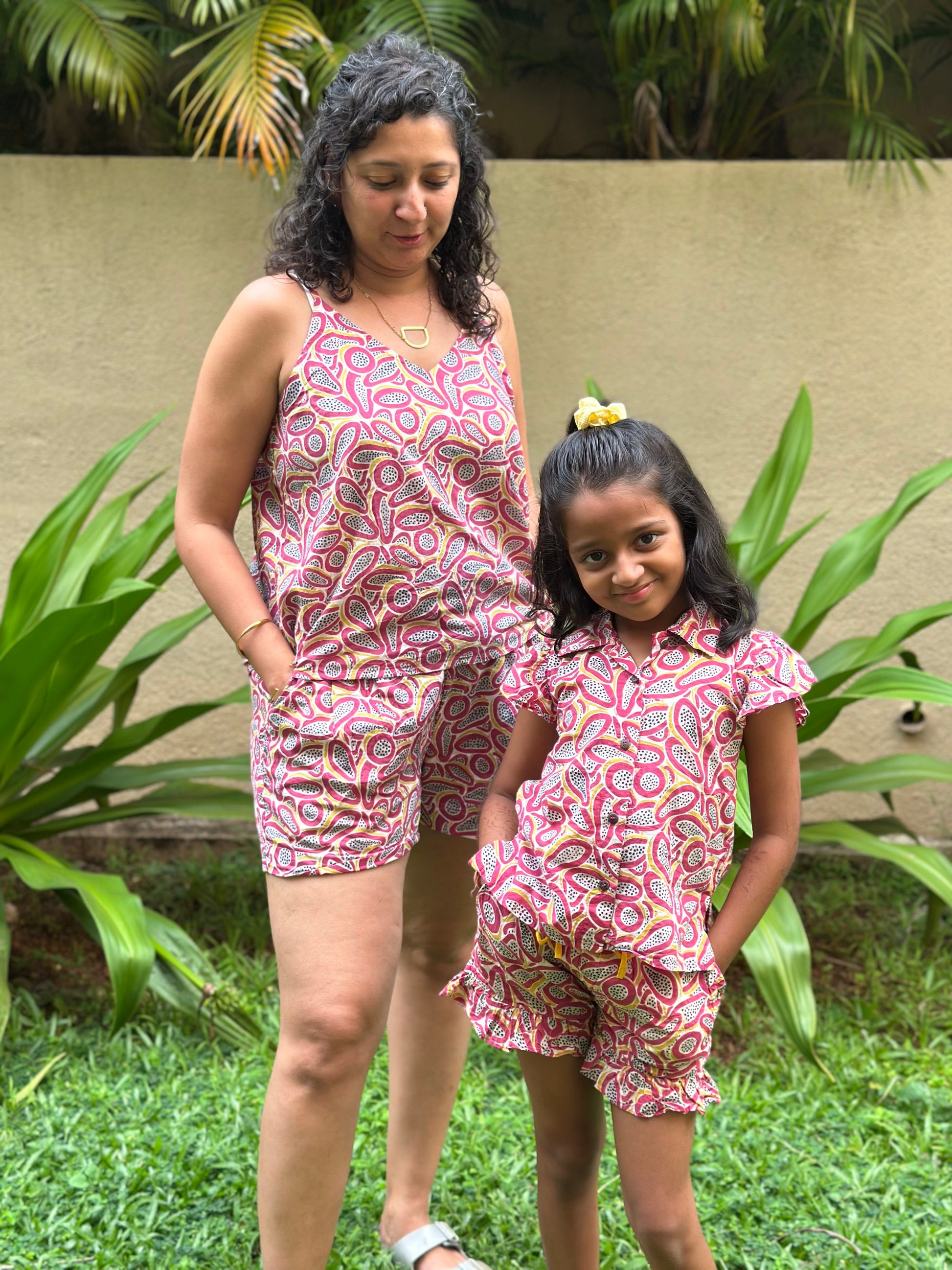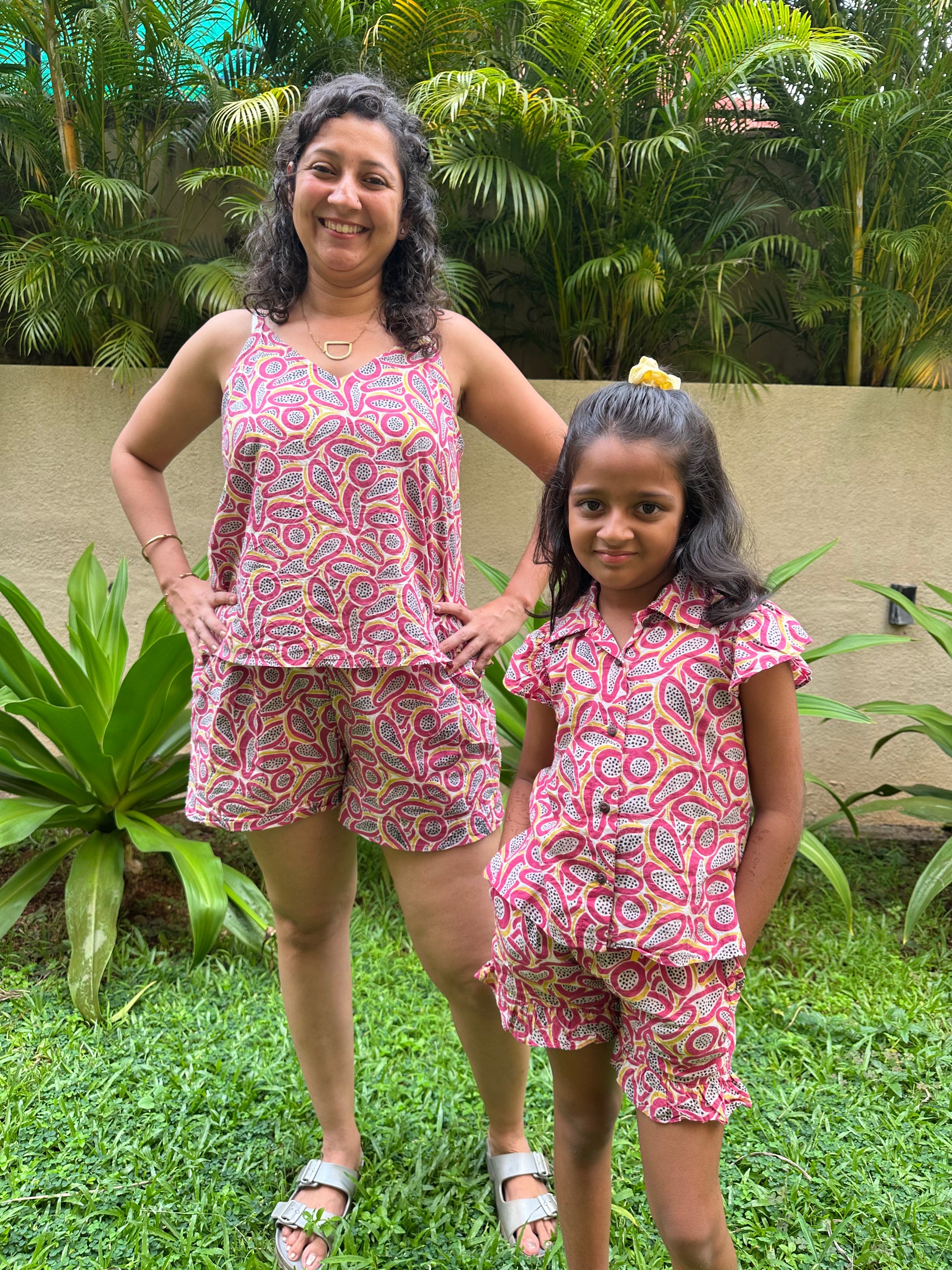 Adult dress: Embrace comfort and style with our Papaya print Coord Set. Made from 100% sustainable cotton, this super comfortable set is perfect for a playful day out or lounging at home. It includes a relaxed-fit V-neck styled strappy top with half-elastic thick waistband shorts with side pockets.