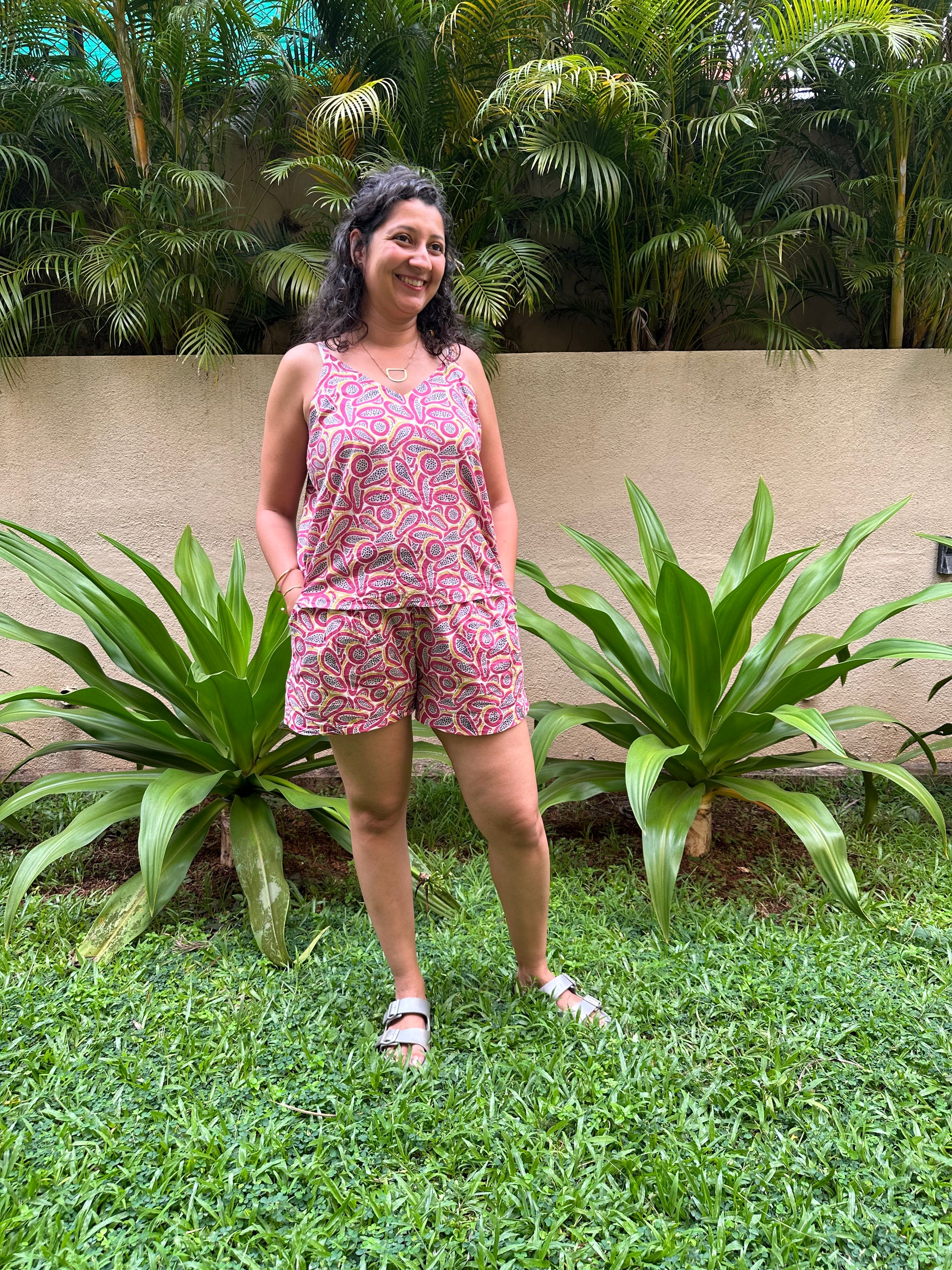 Adult dress: Embrace comfort and style with our Papaya print Coord Set. Made from 100% sustainable cotton, this super comfortable set is perfect for a playful day out or lounging at home. It includes a relaxed-fit V-neck styled strappy top with half-elastic thick waistband shorts with side pockets.