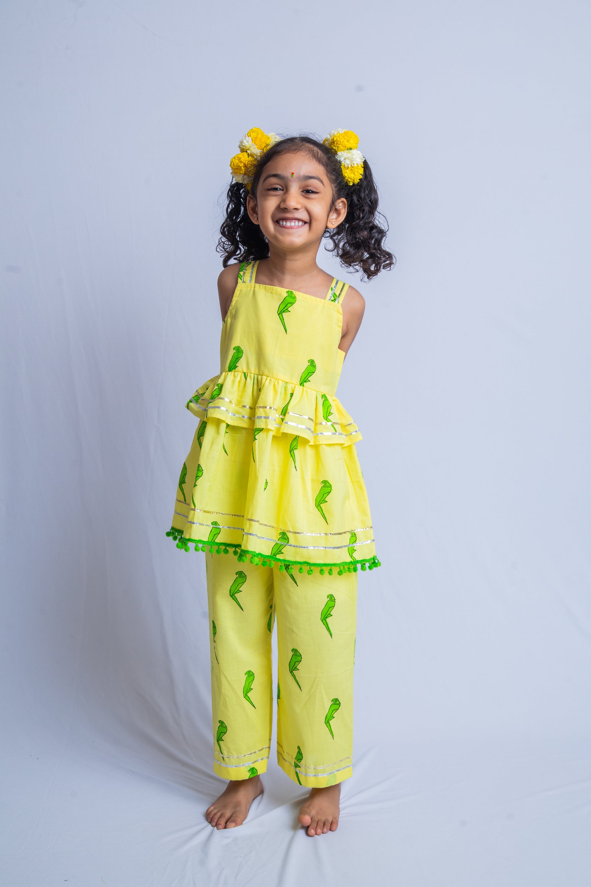 A stylish coord set for Girls in our Origami Parrot print, featuring a two layers top with contrast pom-pom detailing and matching pants with some gota patti detailing. The outfit blends Indo western style with handblock print, crafted from 100% cotton for comfort and breathabilty. Perfect for a unique Festive look!