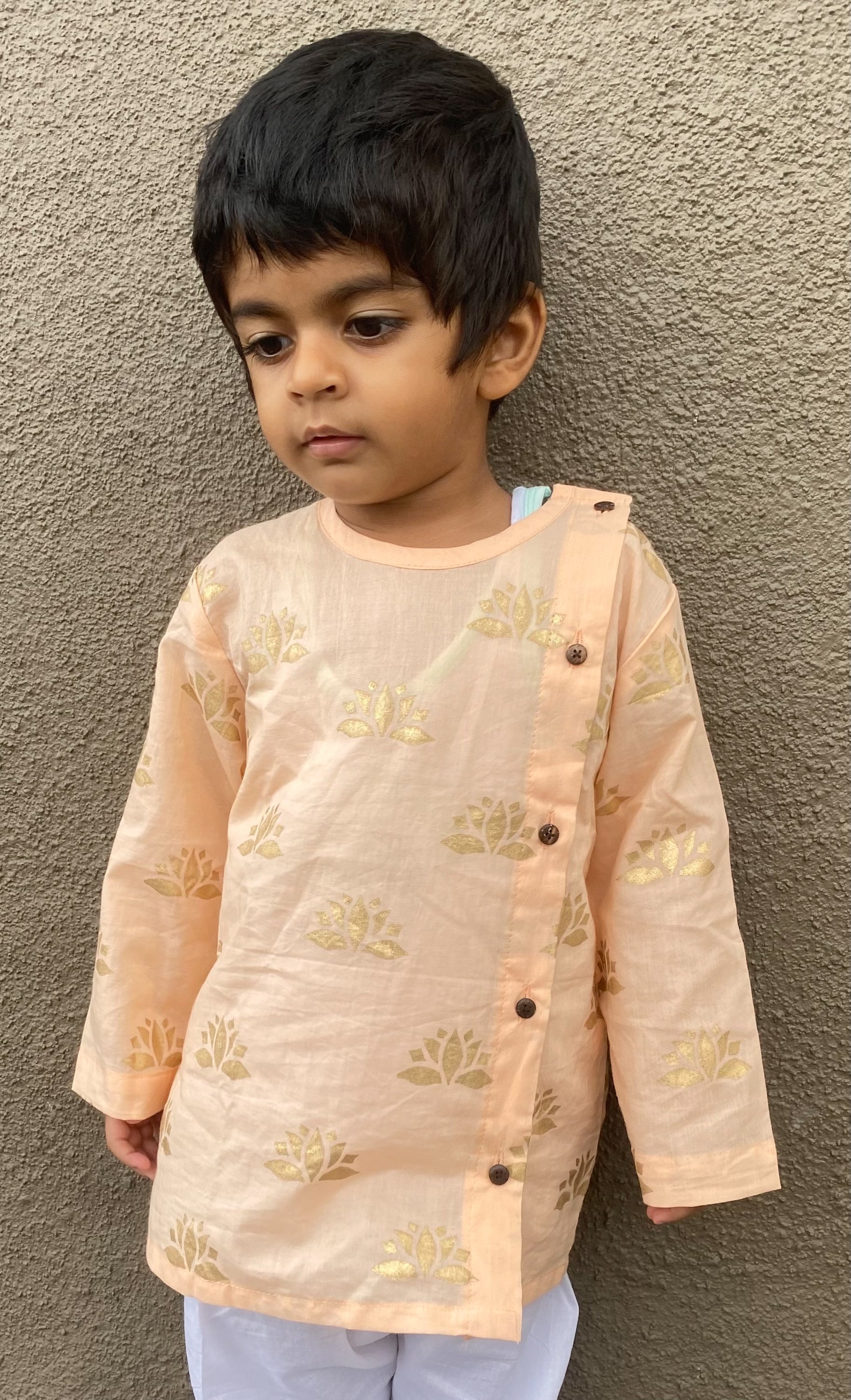 Dress your little one in this charming fresh paisely Peach Lotus print themed festive set, made from 100% cotton for all-day comfort. Featuring a gold khadi print, the kurta comes with a stylish side placket, while the white cotton pants offers a comfortable look. Perfect for a festive occasion which blends traditional elegance with playful details.
