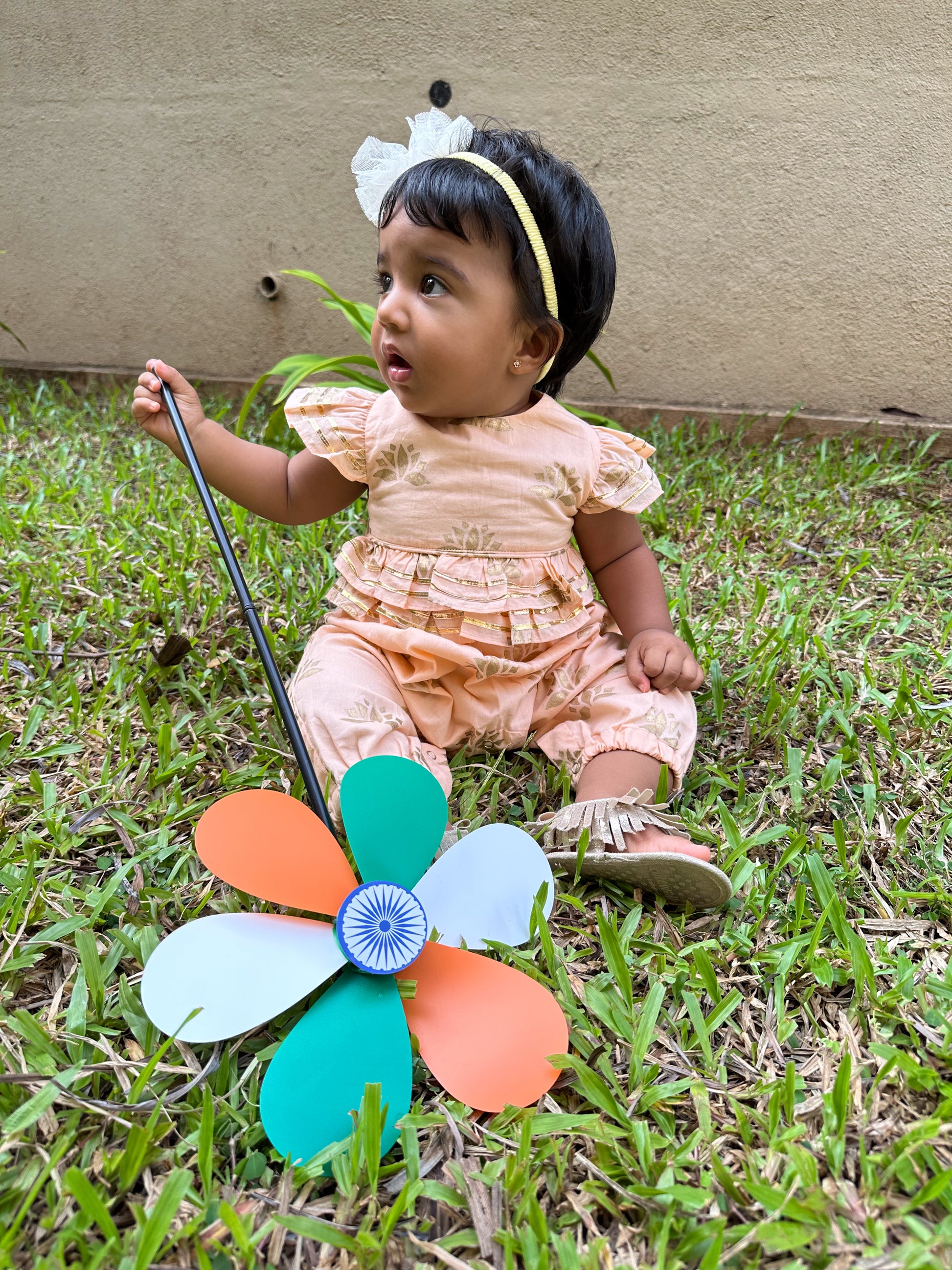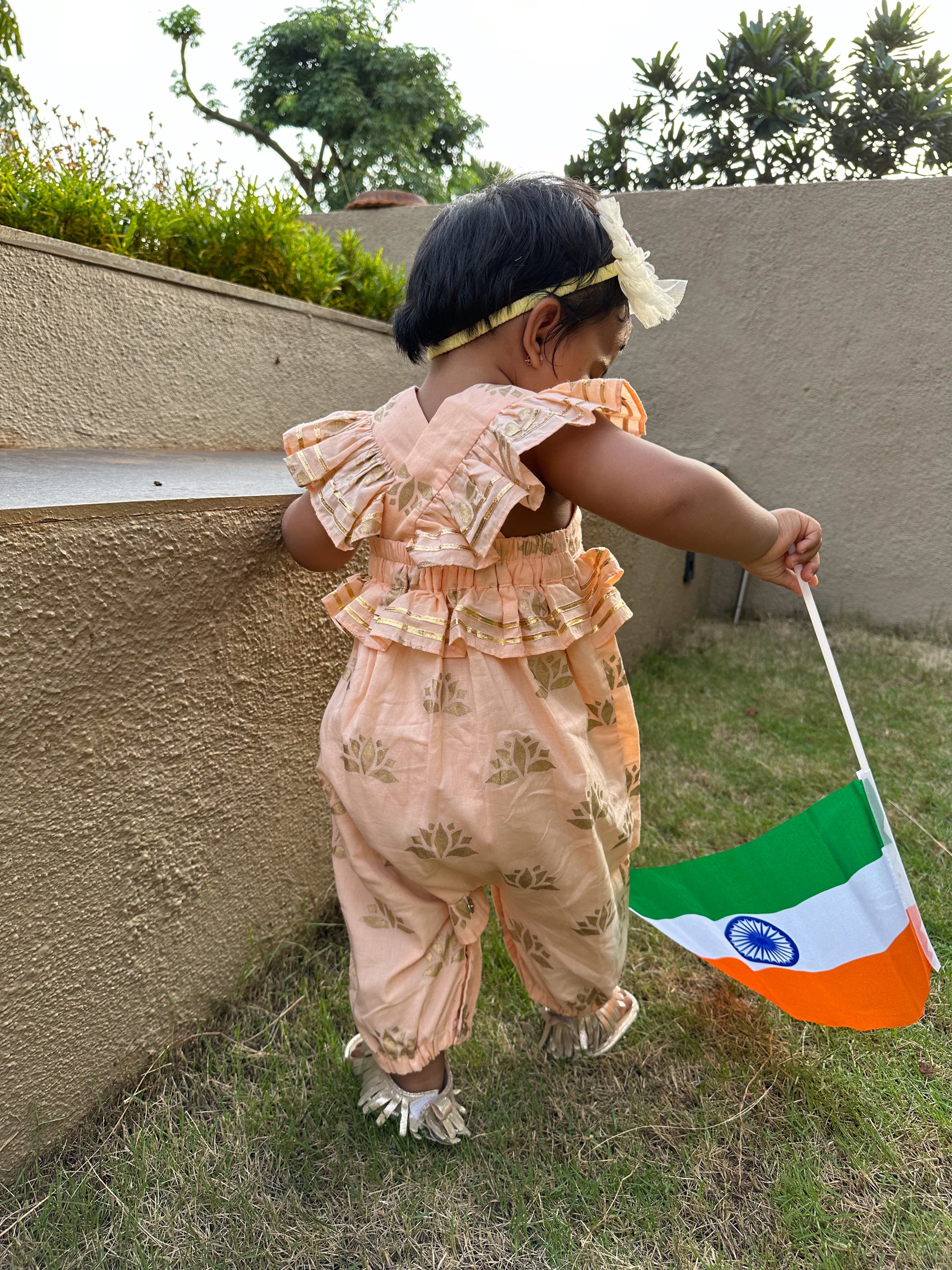 Flutter around in our paisley Peach Gold Khadi Lotus print Jumpsuit Onesie which is full of charm. It has a super cute detailing of frills around the shoulder going upto the back adding a little sparkle with gold gota patti detailing.