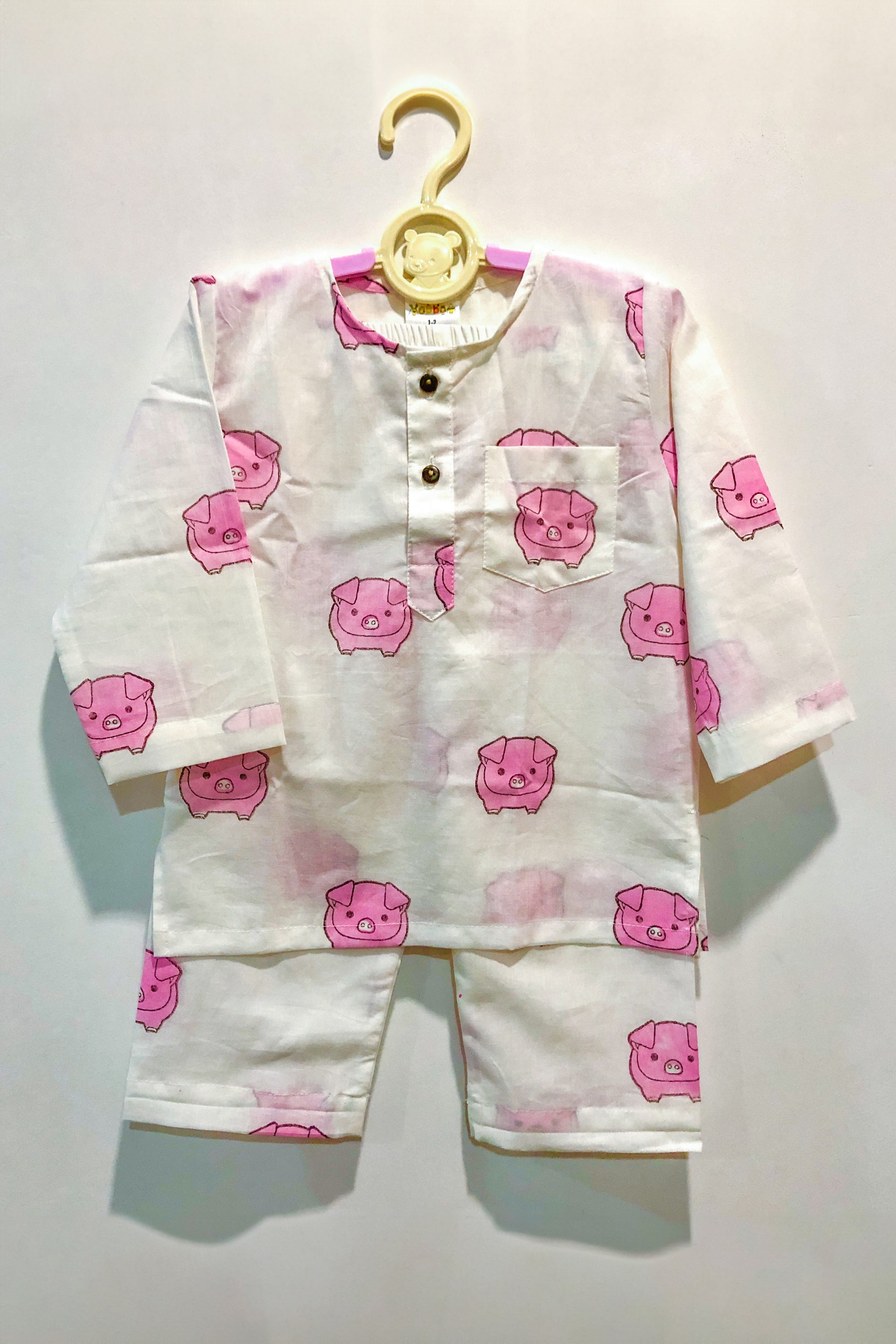 Sleep tight in our soft cotton mul night suit with a Pig kurta & pajama with piping, hand-block printed.