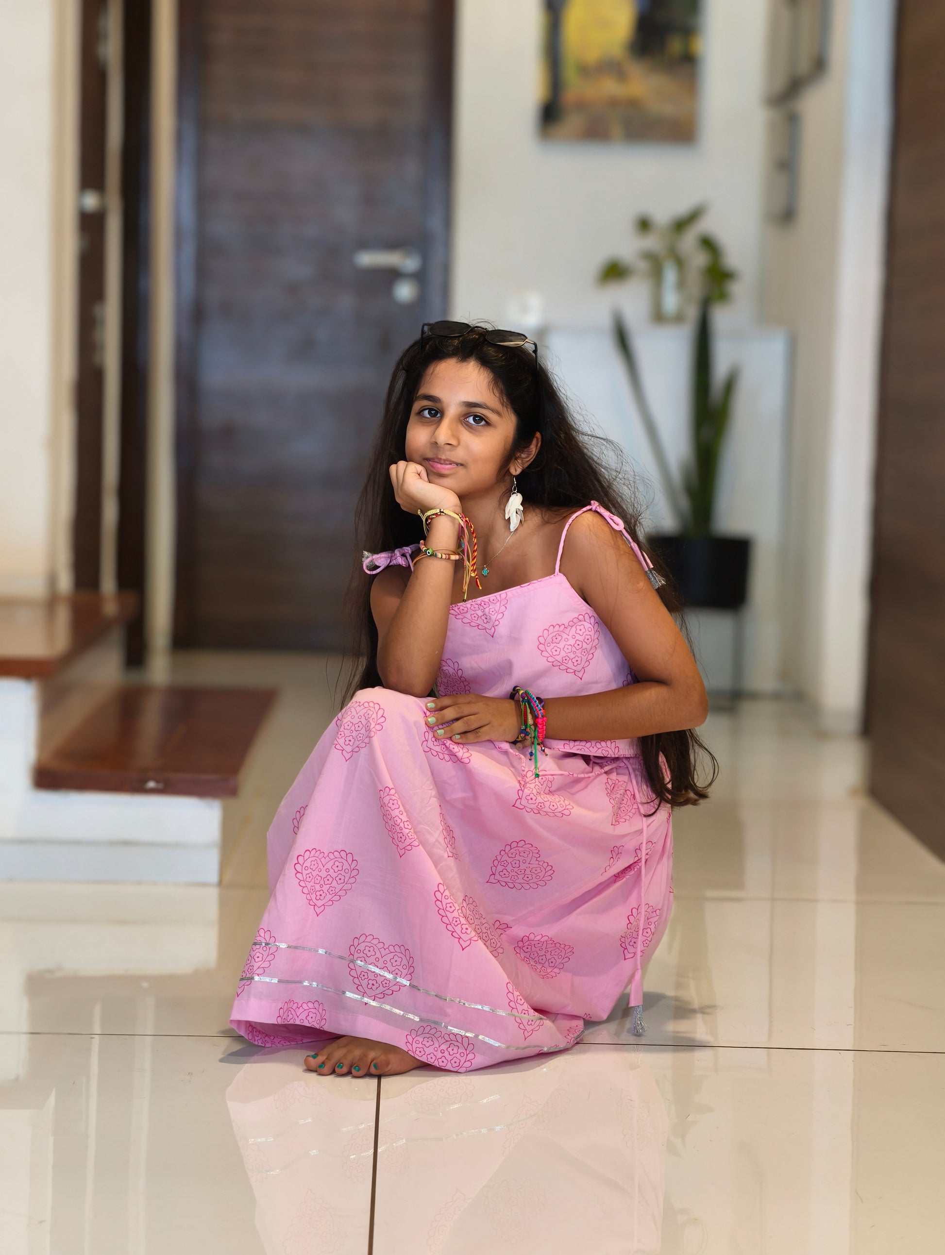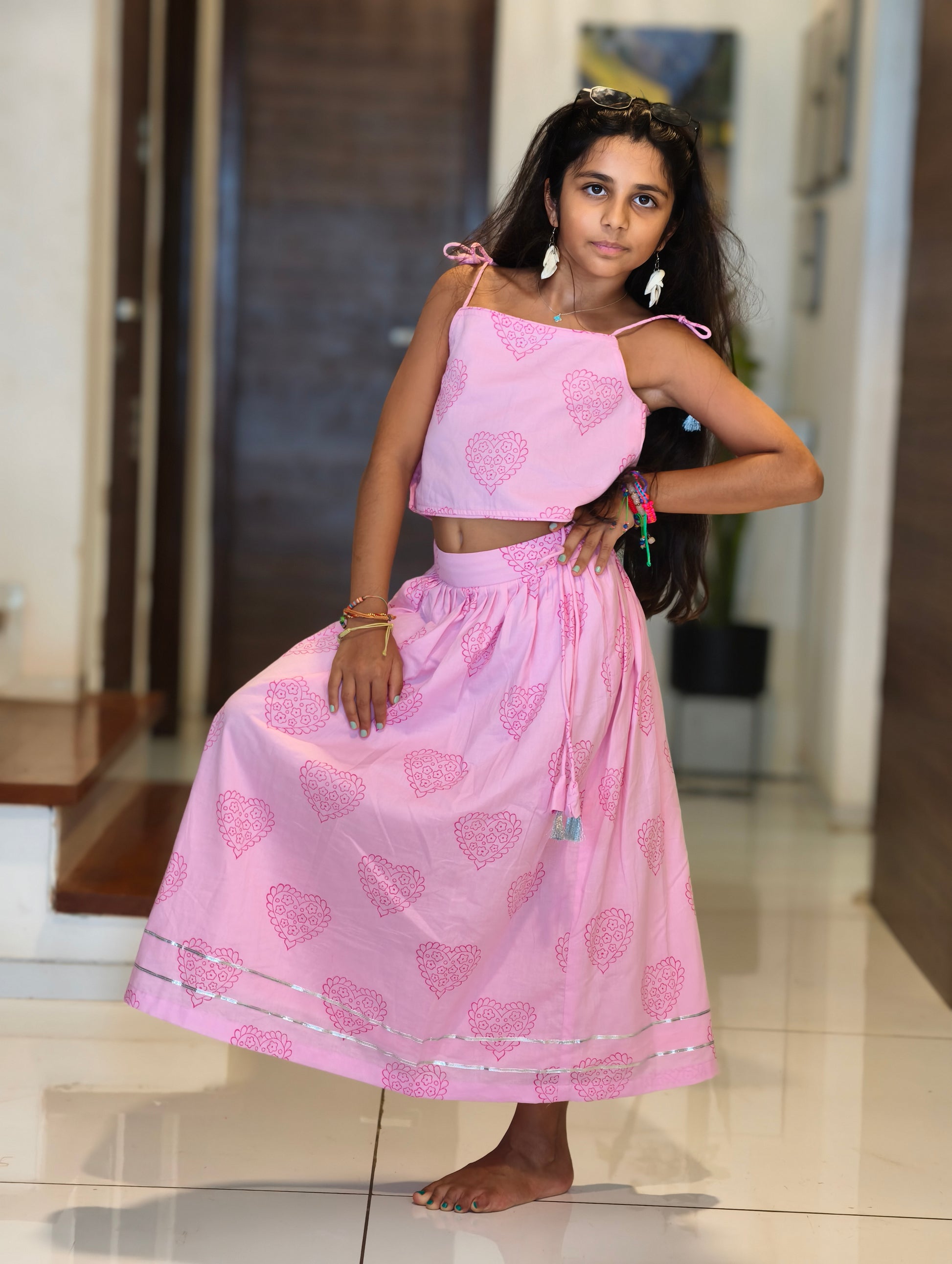 - Light pink base with block printed hearts on choli with tie-up style straps