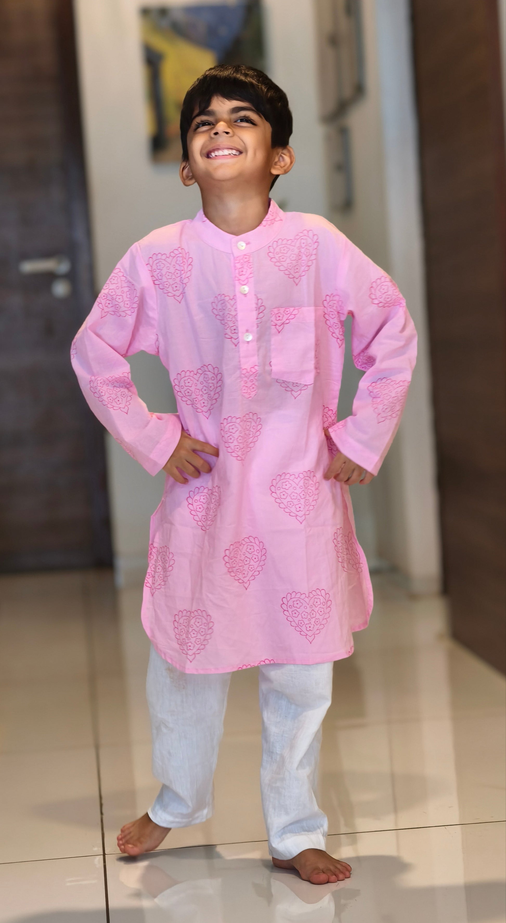 Dress your little one in this charming Pink Hearts festive set, made from 100% cotton for all-day comfort. Featuring a dark pink block print, the kurta comes with a regular round neck elegant styled neck & placket, while the white cotton pants are perfect to wear all through the day. Great for a festive occasion which blends traditional elegance with playful details.