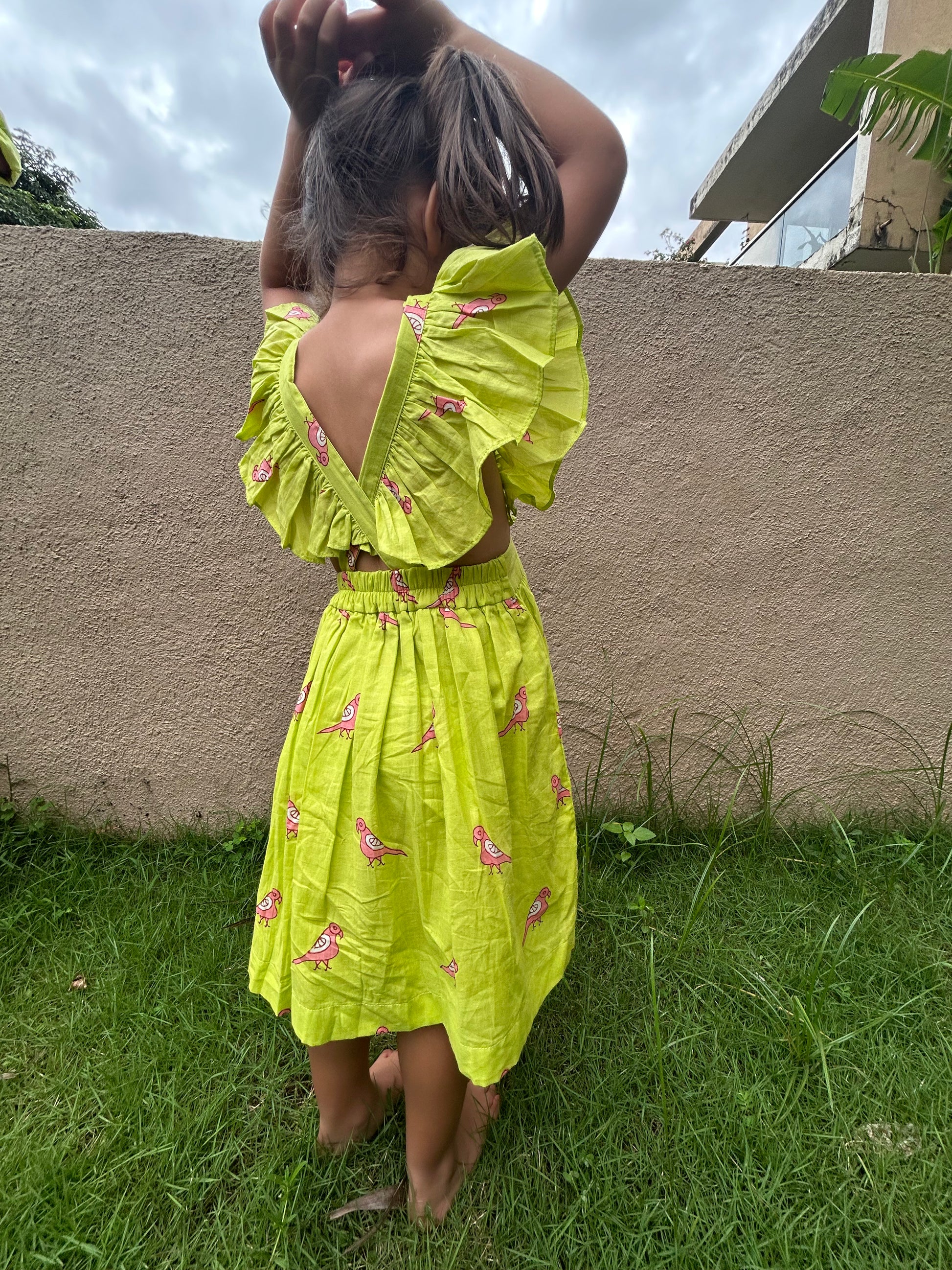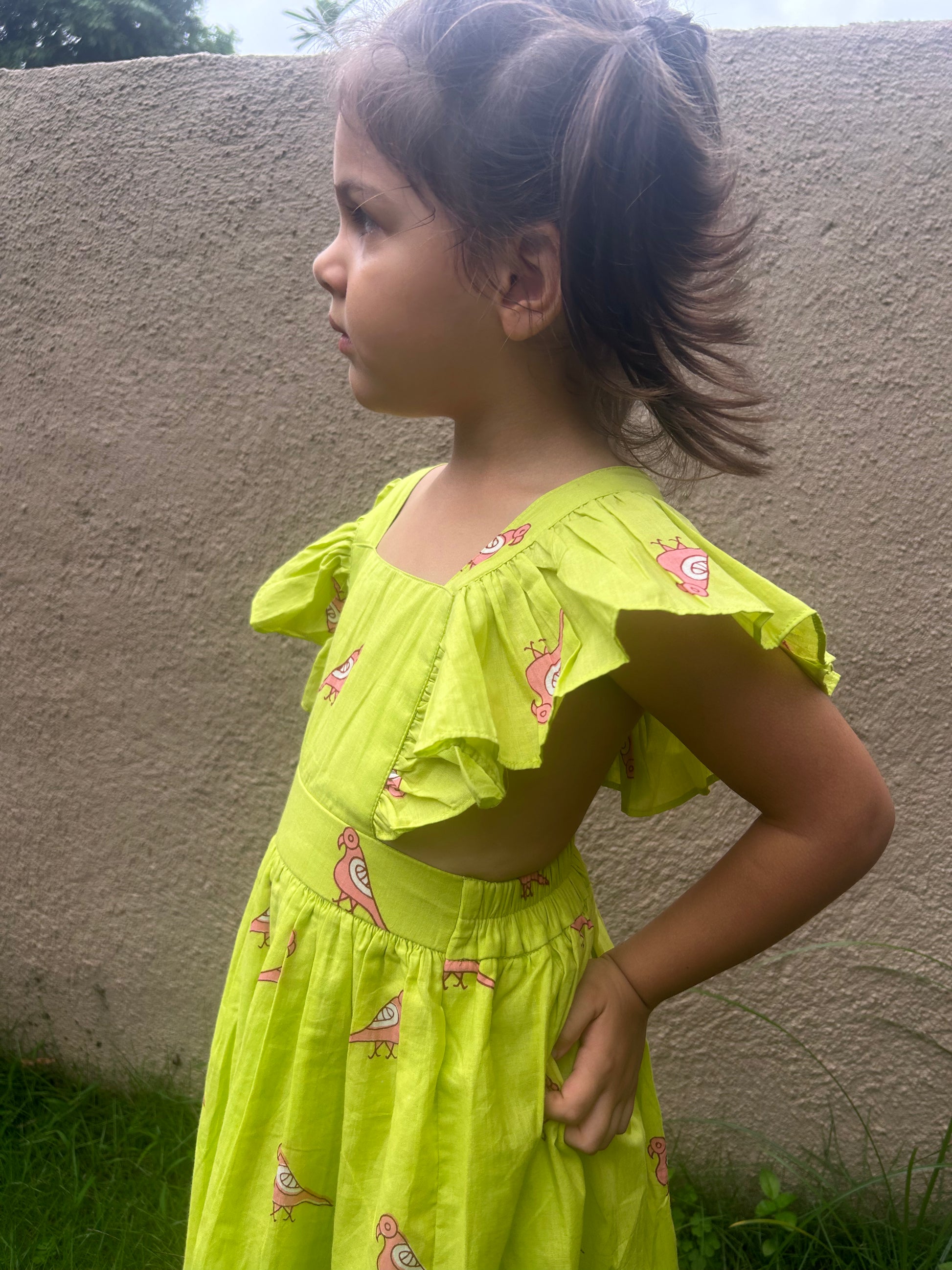 Flutter around in our bright Pink parrots ruffle backless dress which is full of charm. It has super cute frills around the sleeves of the dress going upto the back.