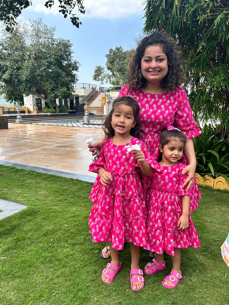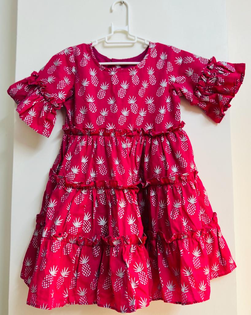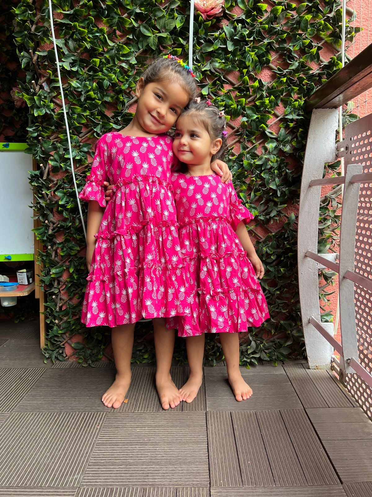 Adult Dress: Let your girl shine in this hot Pink & Silver Khadi Pineapple Dress , featuring stylish bell sleeves with a frill around the dress, making it perfect for dancing and prancing during this festive season. A beautiful blend of comfort and tradition in a stunning color.
