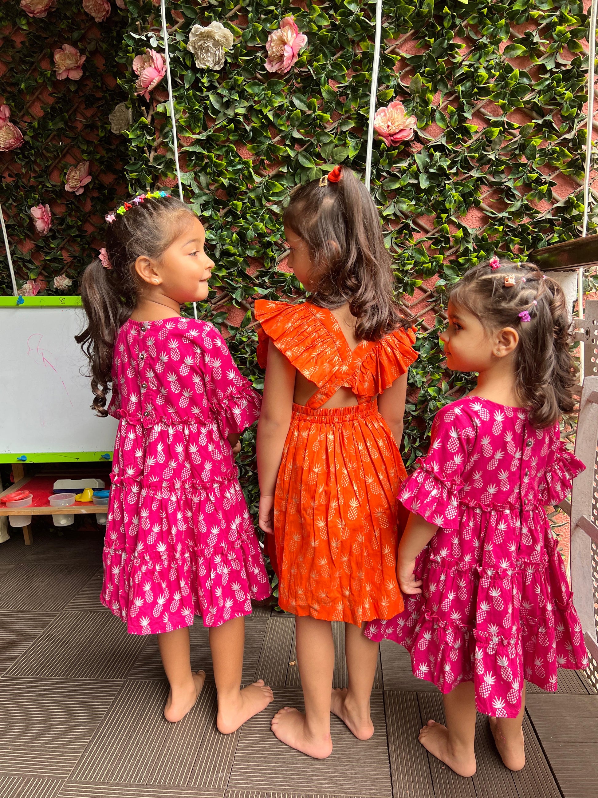 Girls Dress: Let your girl shine in this hot Pink & Silver Khadi Pineapple Dress , featuring stylish bell sleeves with a frill around the dress, making it perfect for dancing and prancing during this festive season. A beautiful blend of comfort and tradition in a stunning color.