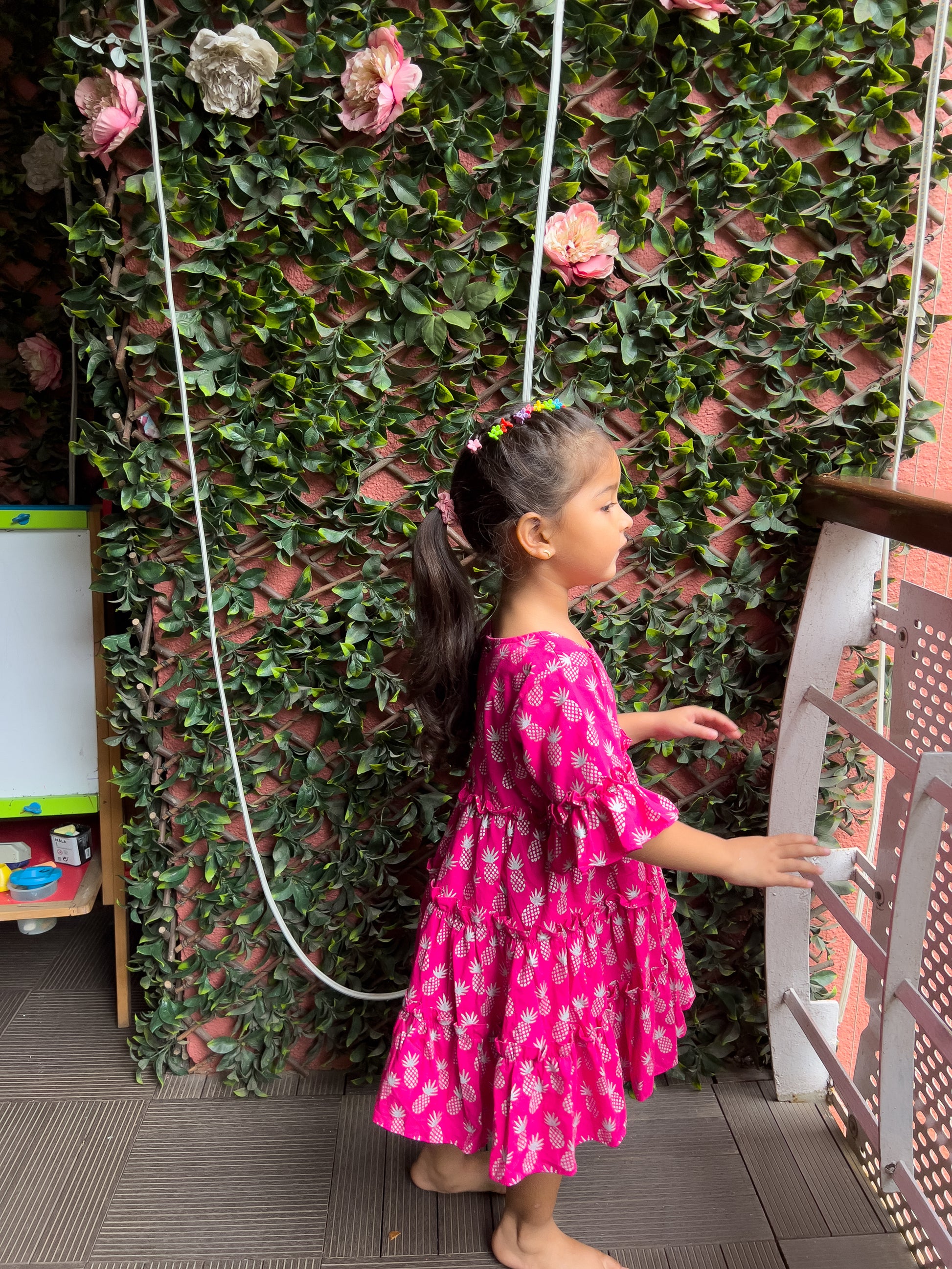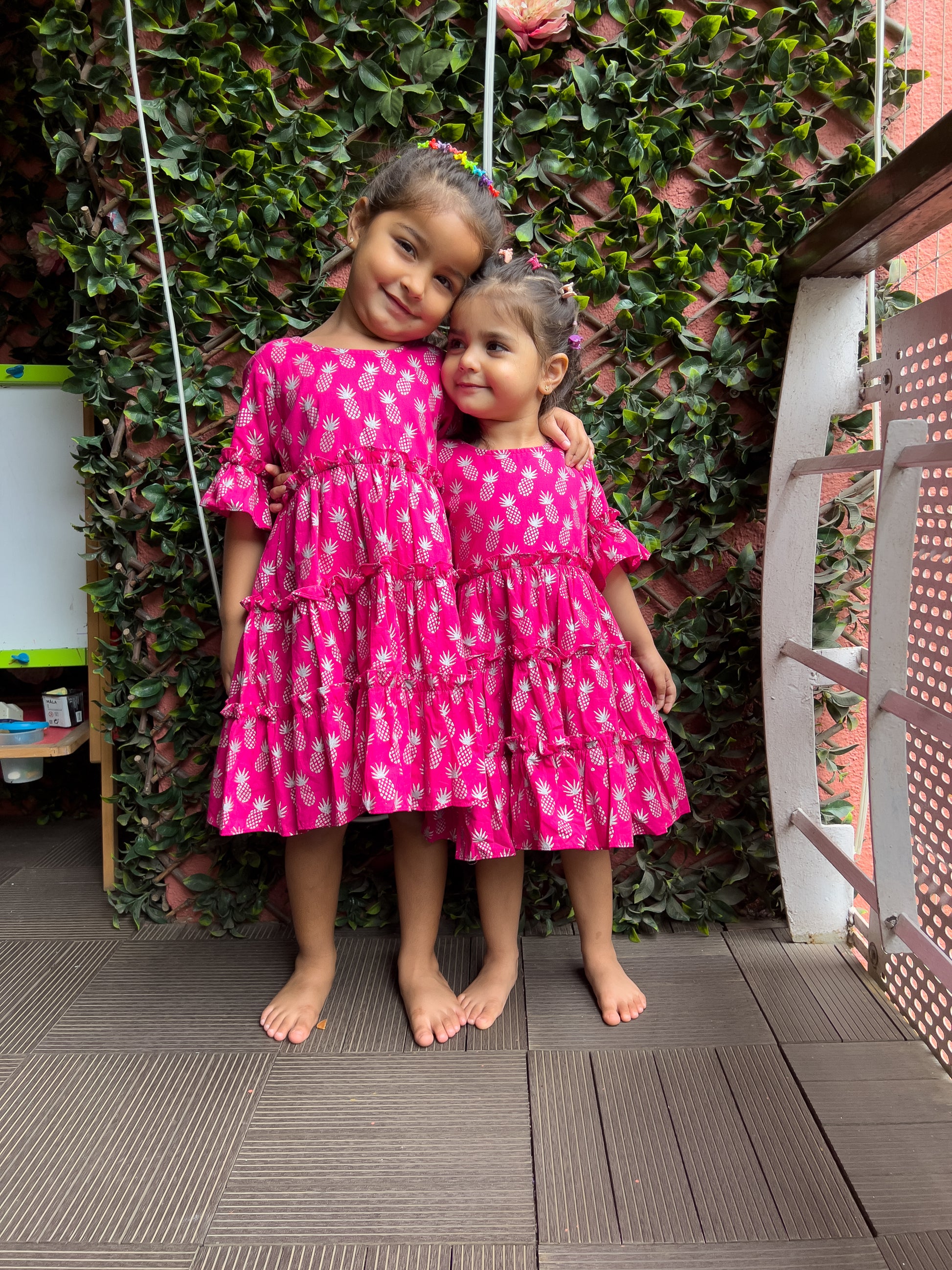 Let your girl shine in this hot Pink & Silver Khadi Pineapple Dress , featuring stylish bell sleeves with a frill around the dress, making it perfect for dancing and prancing during this festive season. A beautiful blend of comfort and tradition in a stunning color.