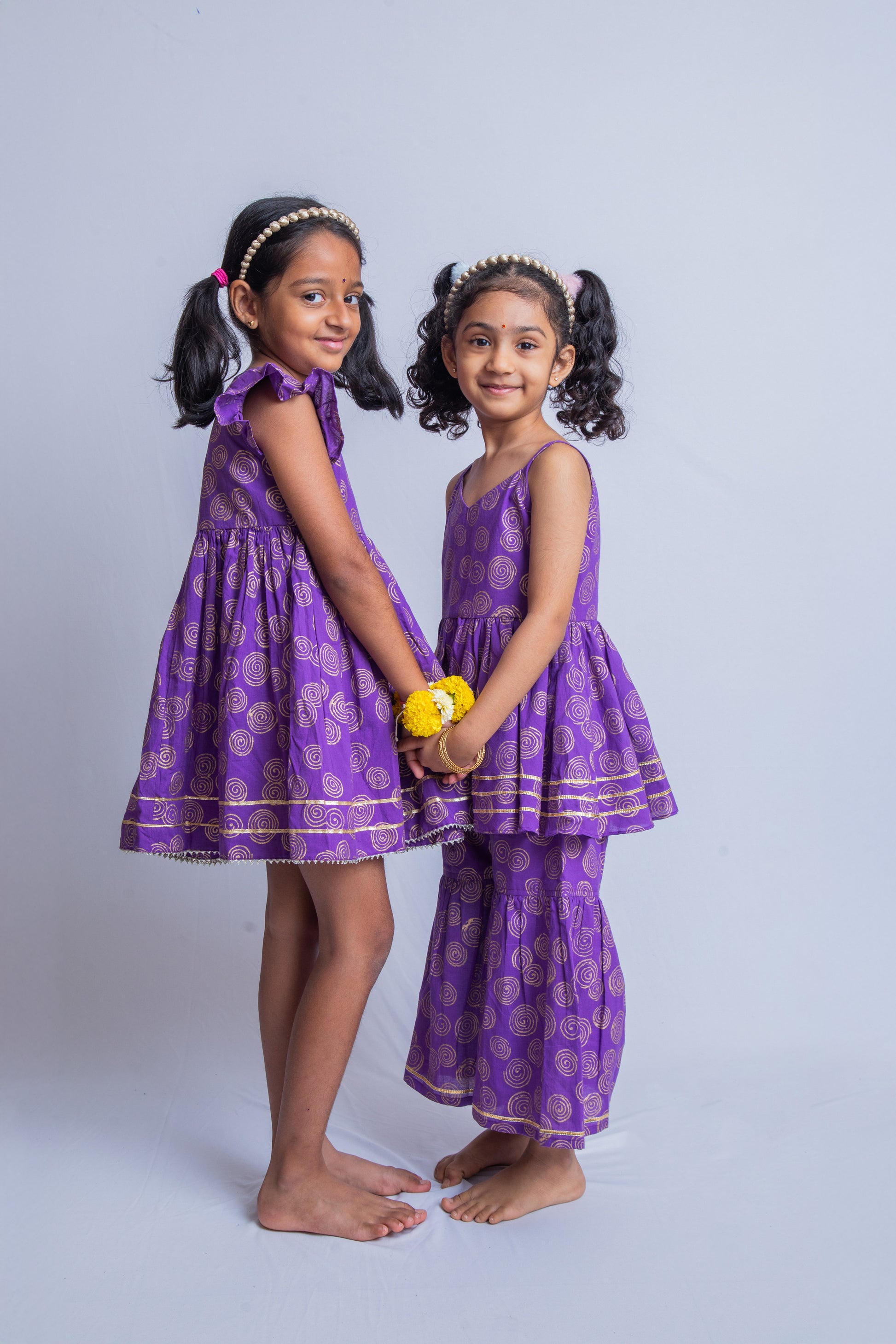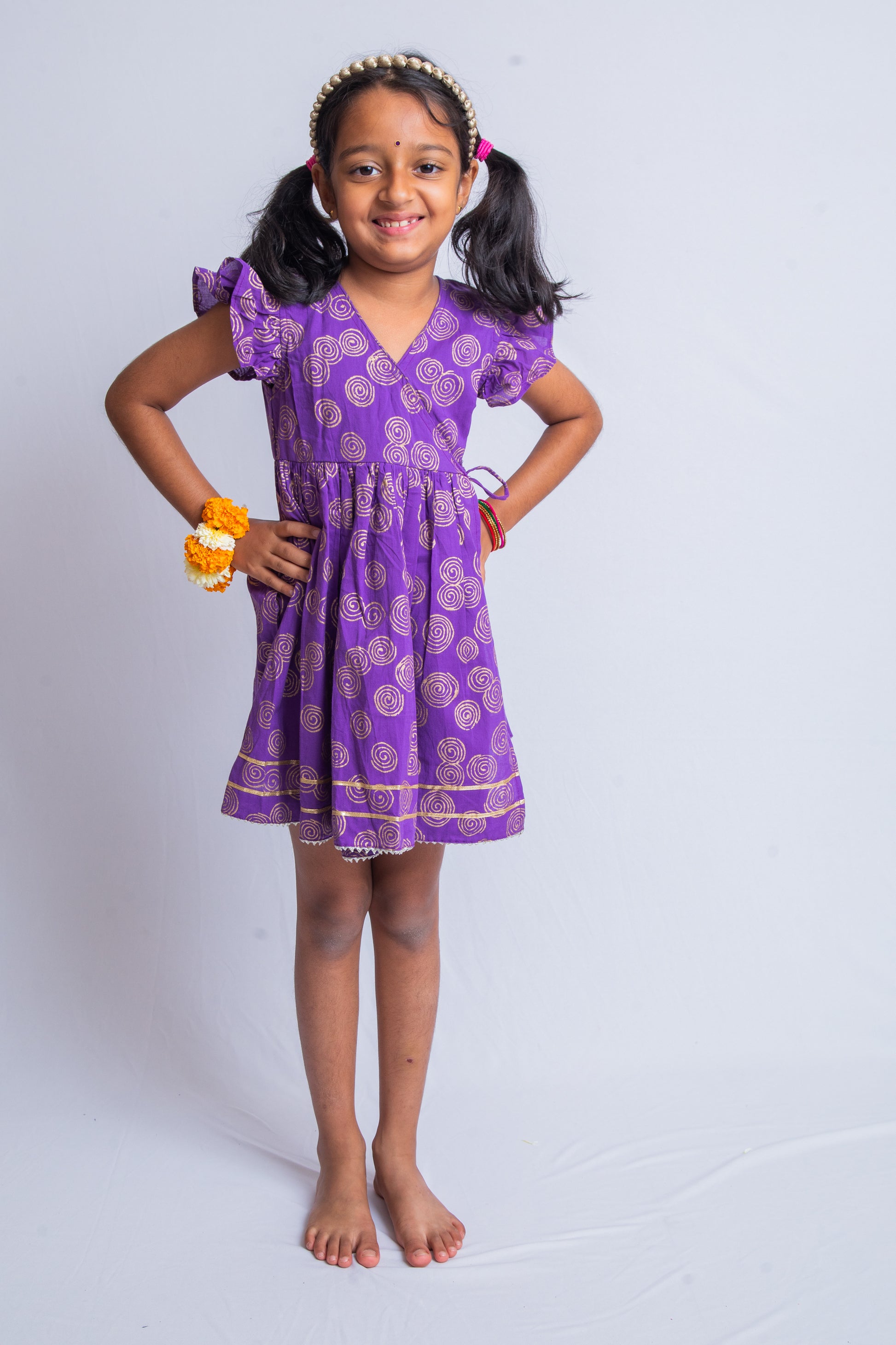 Brighten up your festive celebrations with our Purple & Gold Jalebi Angarakha Dress for girls. Made with 100% cotton, this hand-block printed outfit features a stylish cross-tie kurta. Perfect for special occasions.