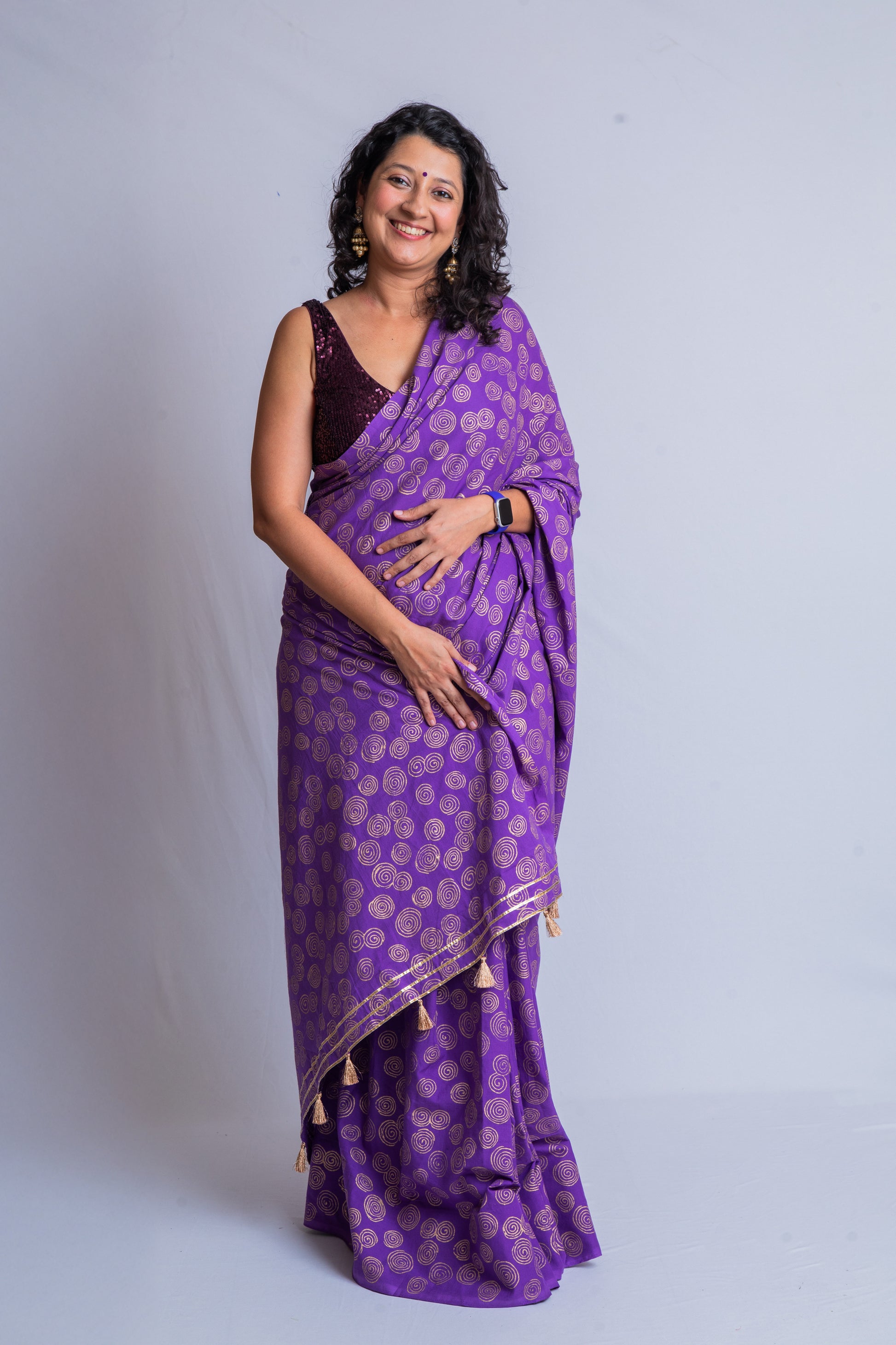 Discover our latest launch: the Women's Saree Collection, crafted from 100% cotton and adorned with our signature quirky prints. This versatile saree in our Purple with Gold Jalebi print is perfect for both casual and formal occasions, offering effortless style and endless stylish possibilities.