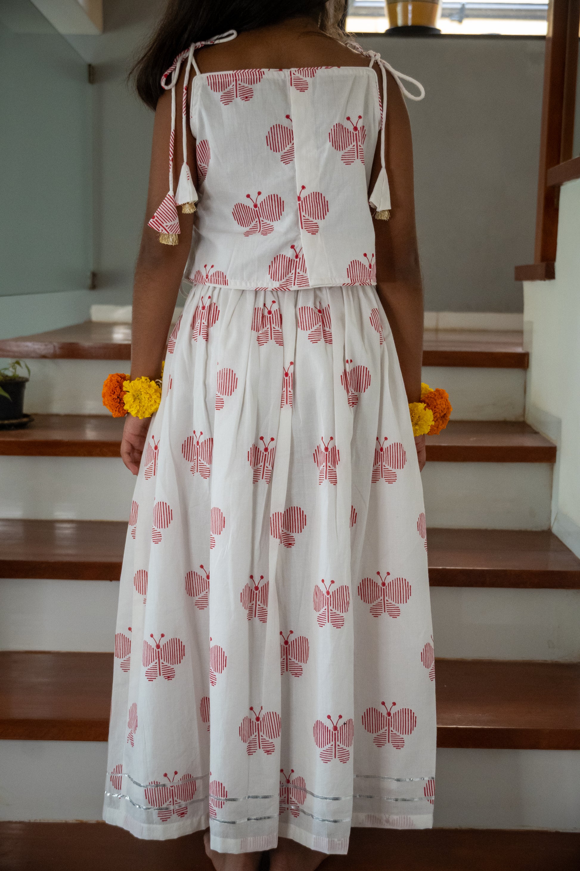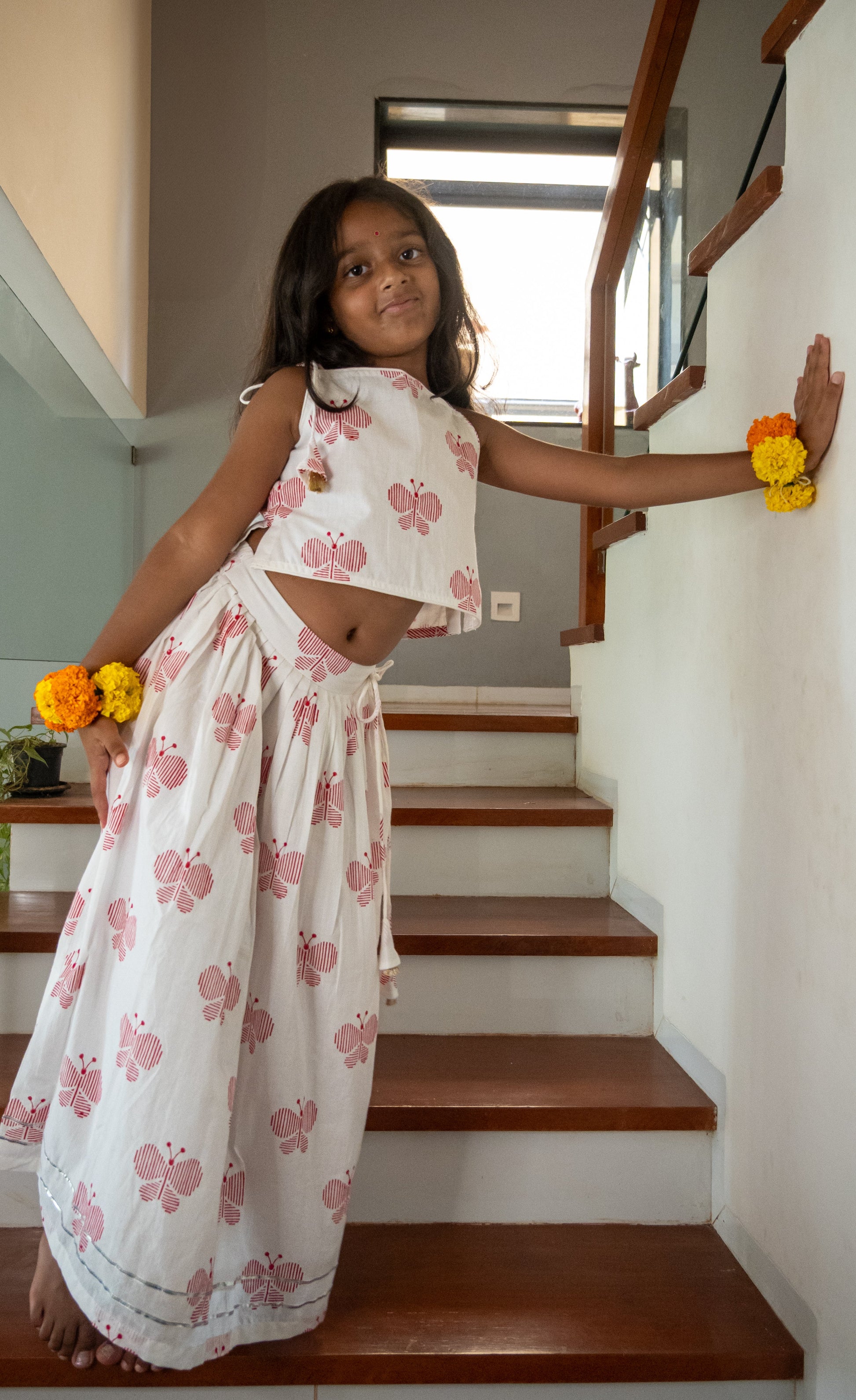 - White base with block printed butterflies on choli with tie-up style straps, silver funta detailing