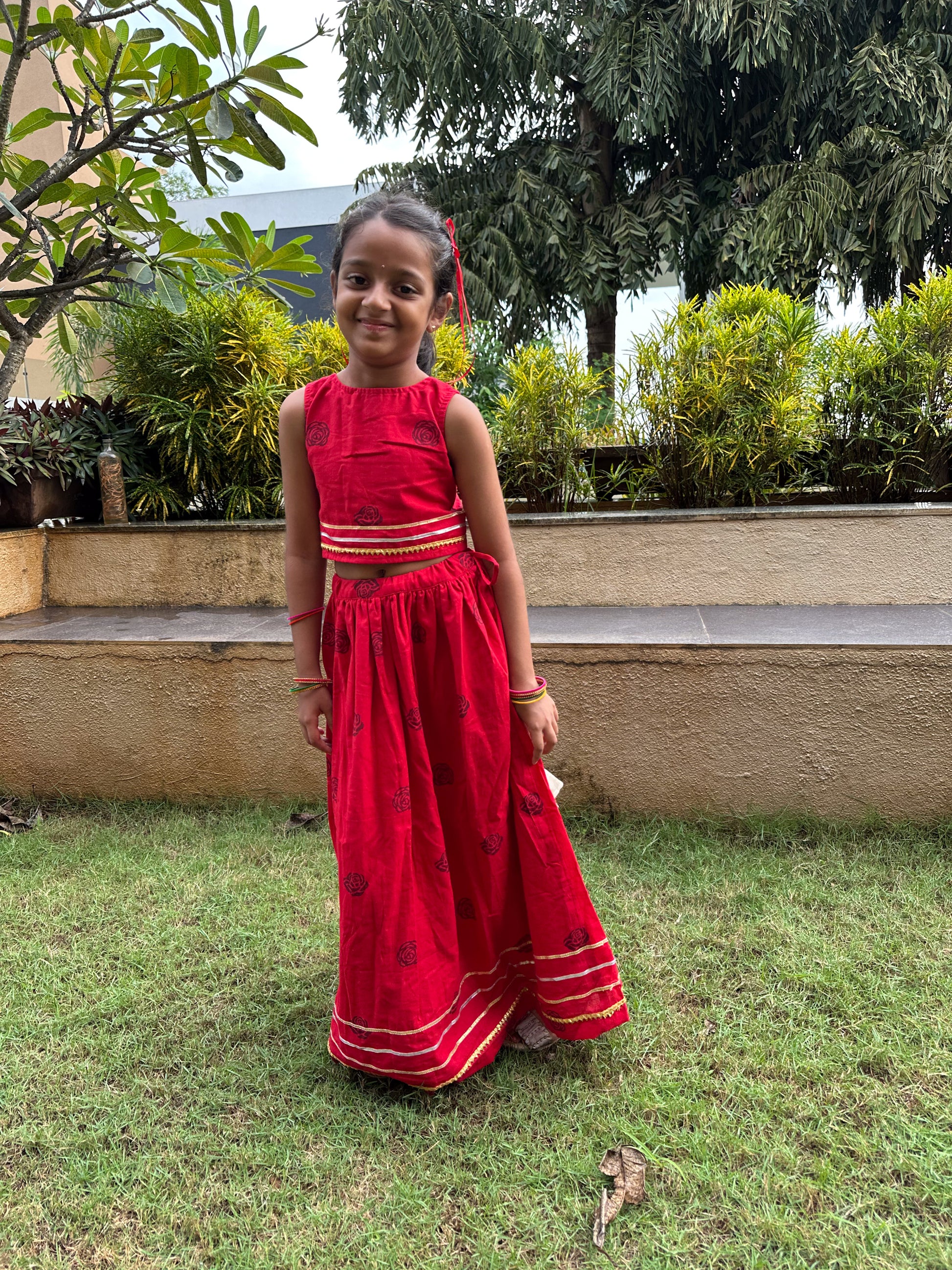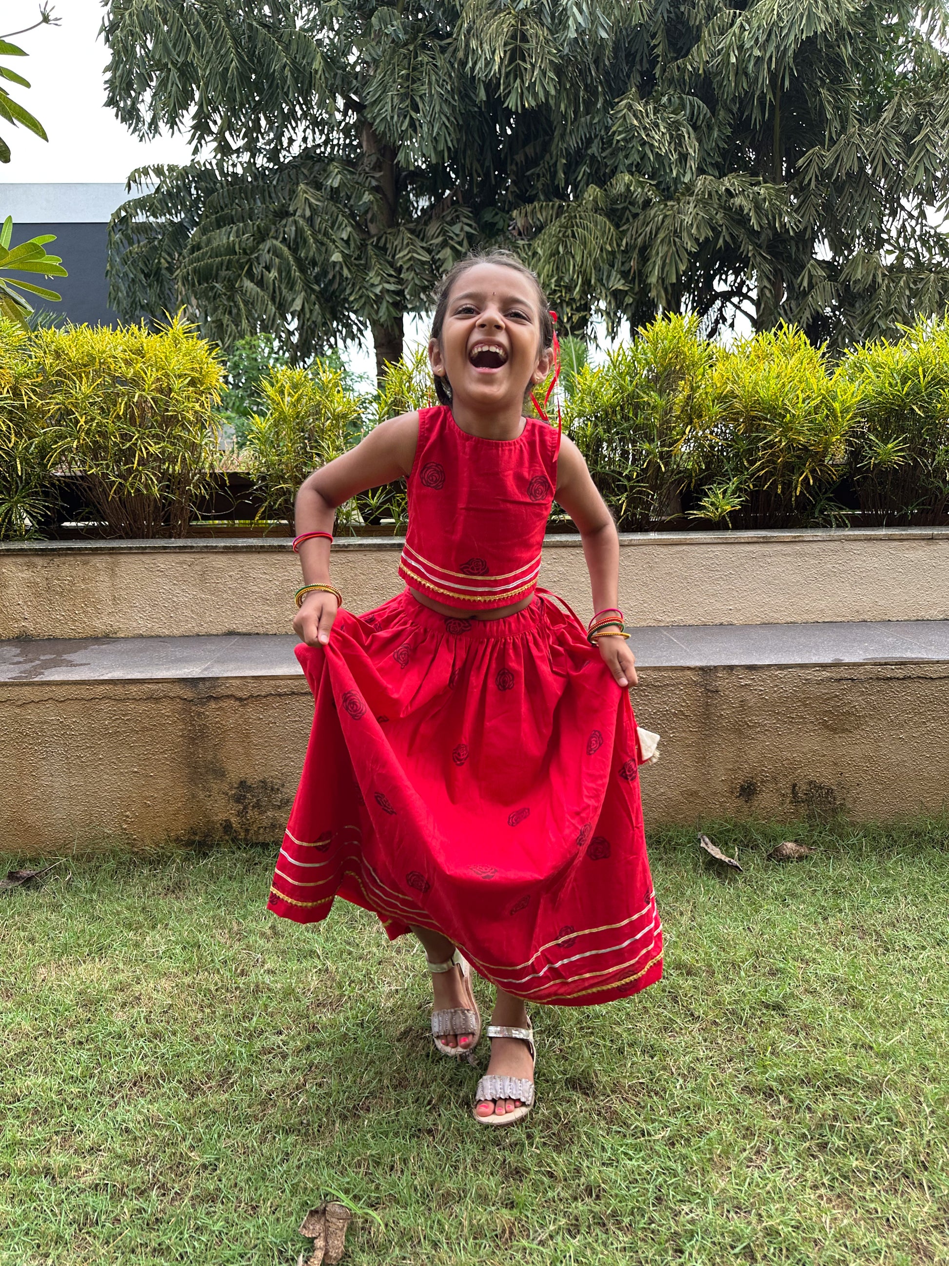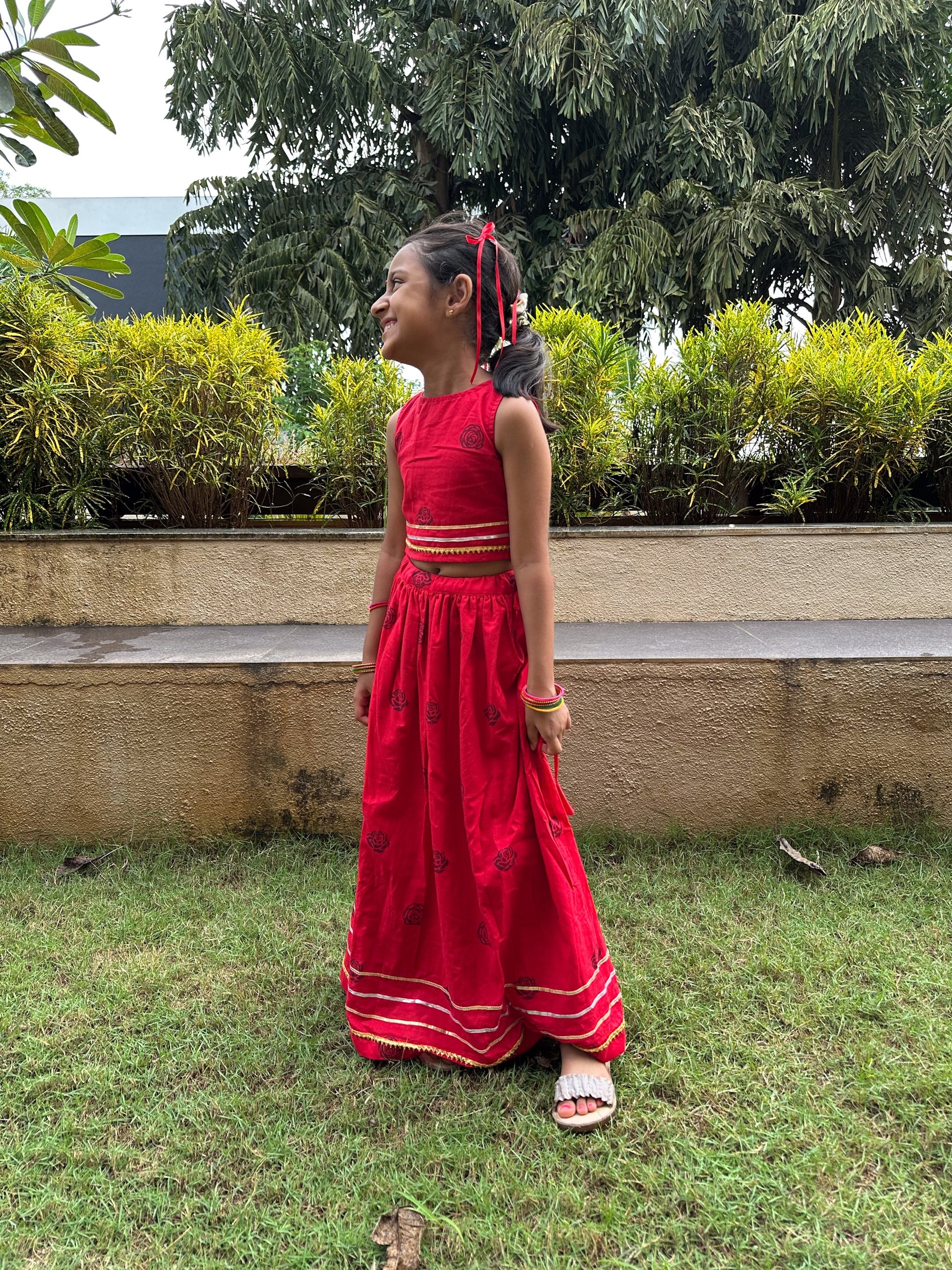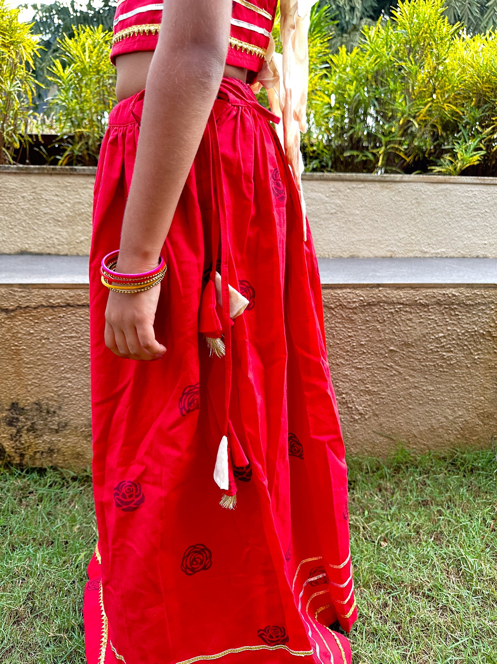 Let your girl shine in this striking Red with Blue Rose Ghagra Choli set, featuring a stylish tie up back choli. Paired with an adjustable wasit skirt, this outfit allows for ease of movement, making it perfect for dancing and prancing during the festive season. A beautiful blend of comfort and tradition in a stunning color.