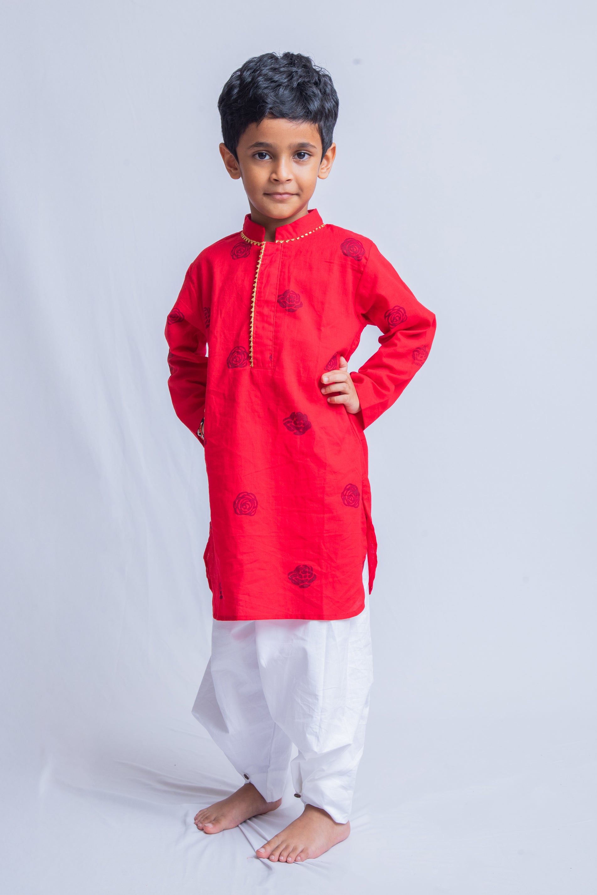 Dress your little one in this beautiful Red with Blue Roses print themed festive set, made from 100% cotton for all-day comfort. Featuring a red based cloth with burgundy roses, the kurta comes with a stylish button placket with triangle shaped gota patti detailing around it, with white cotton pants to offer a unique look. Perfect for a festive occasion which blends traditional elegance with playful details.