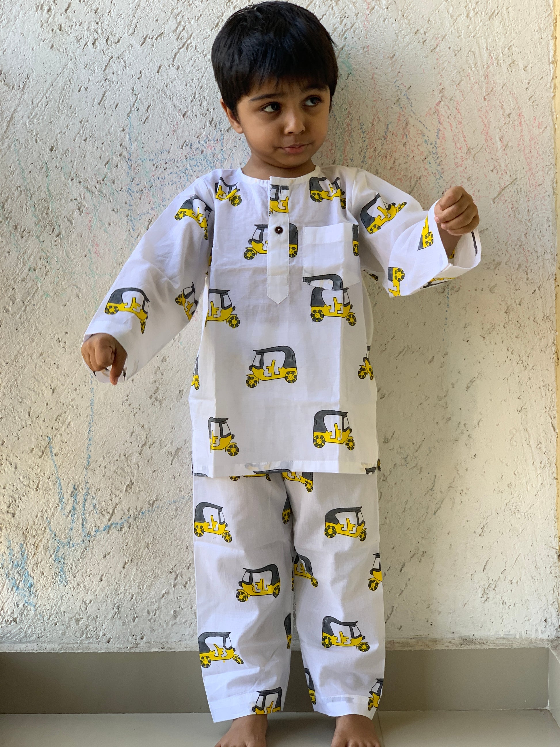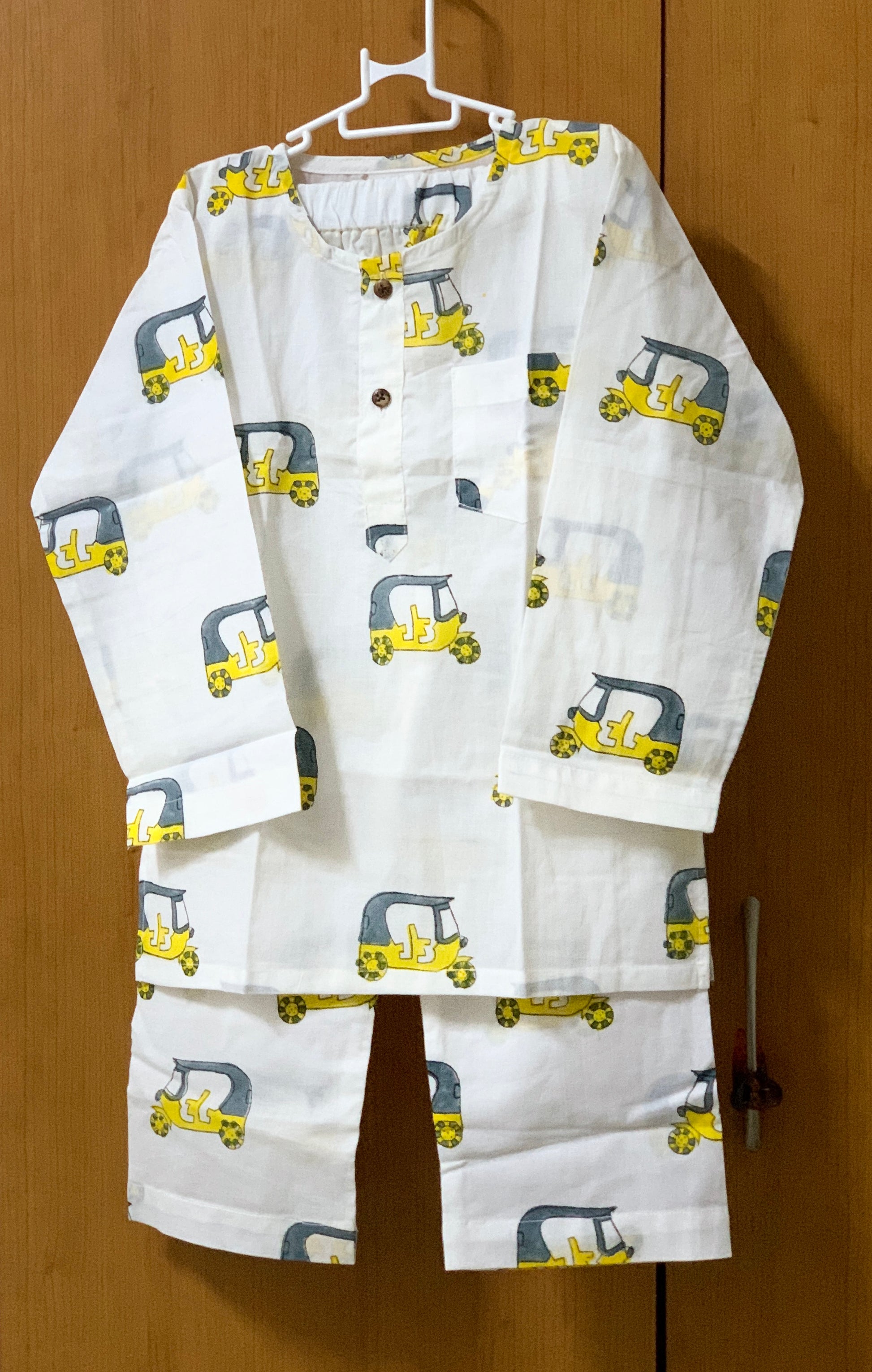 Sleep tight in our soft cotton mul night suit with Auto-rickshaw kurta and pajama set which is hand-block printed.