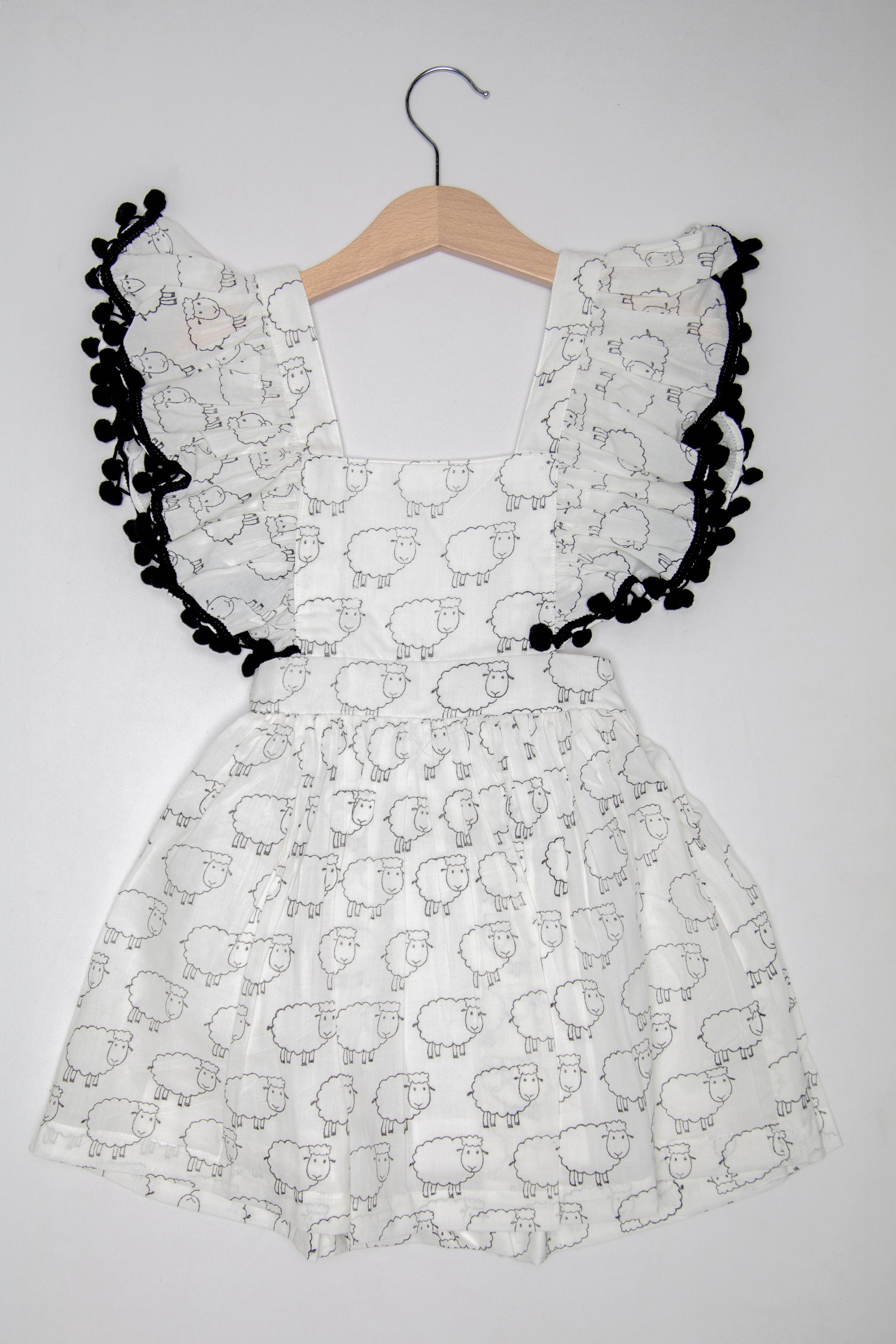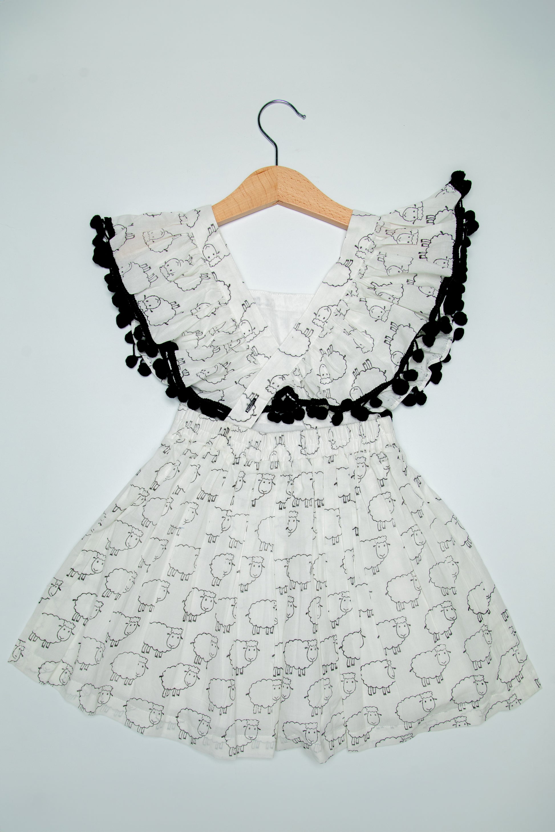 Flutter around in our Sheep print ruffle dress which is full of charm. It has a super cute pom-pom detailing around the frills of the dress going upto the back.