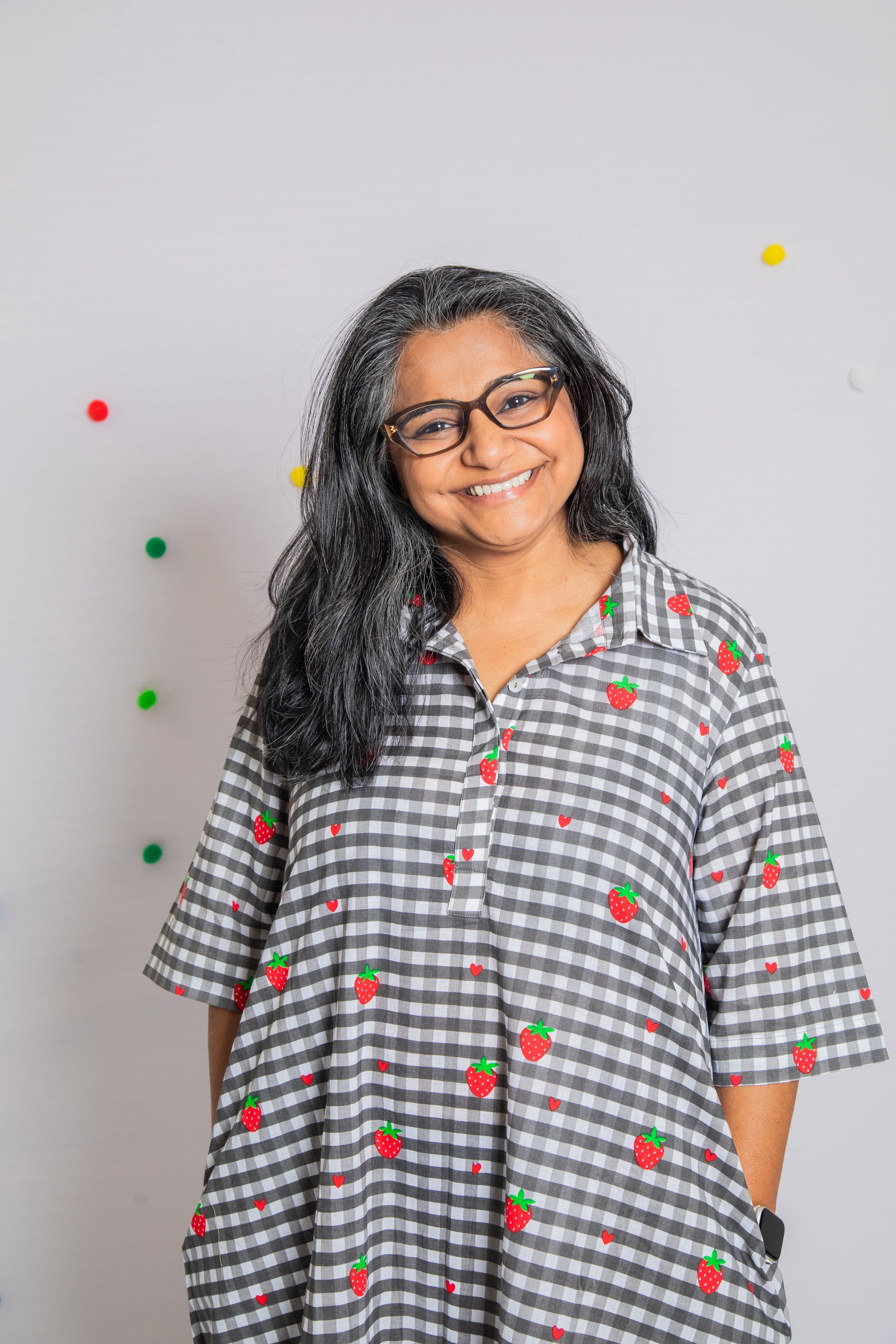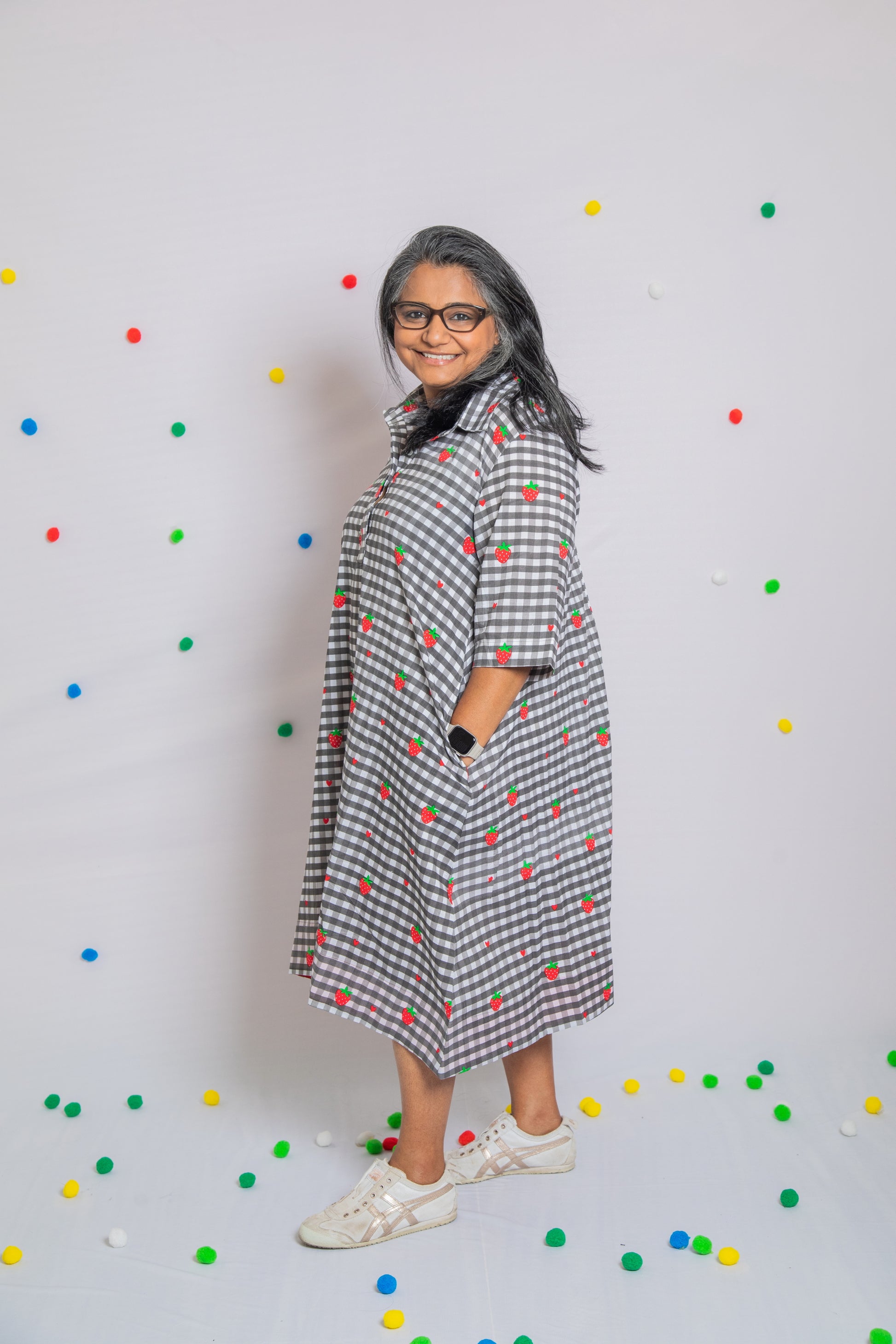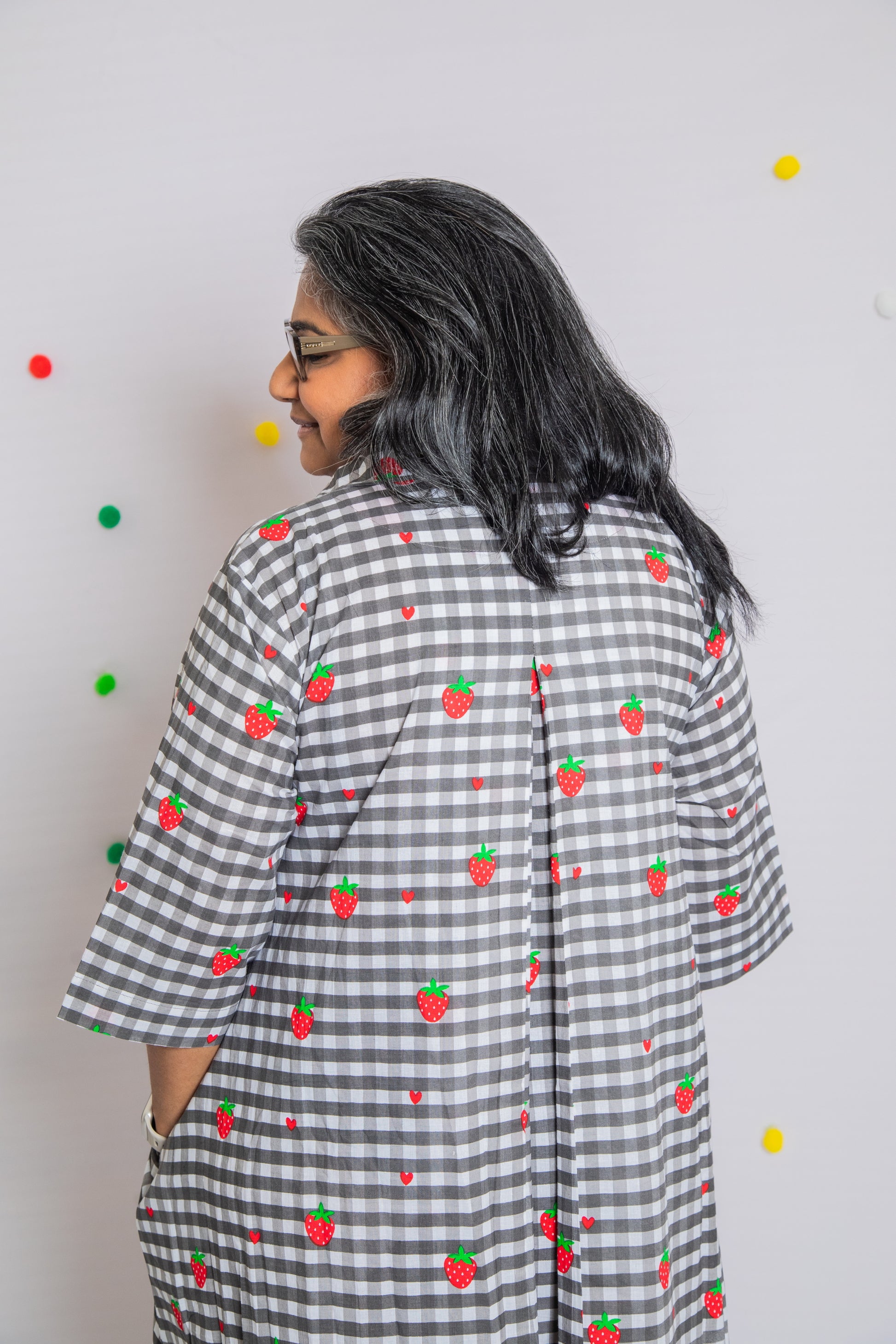 Adult dress: Discover our Checkered with Strawberries & Hearts print button-down style shirt collar dress, featuring a trendy pleat style back with side pockets. This knee length dress is beautifully screen-printed and is handcrafted with a 100% cotton fabric, offering all day comfort and effortless style.