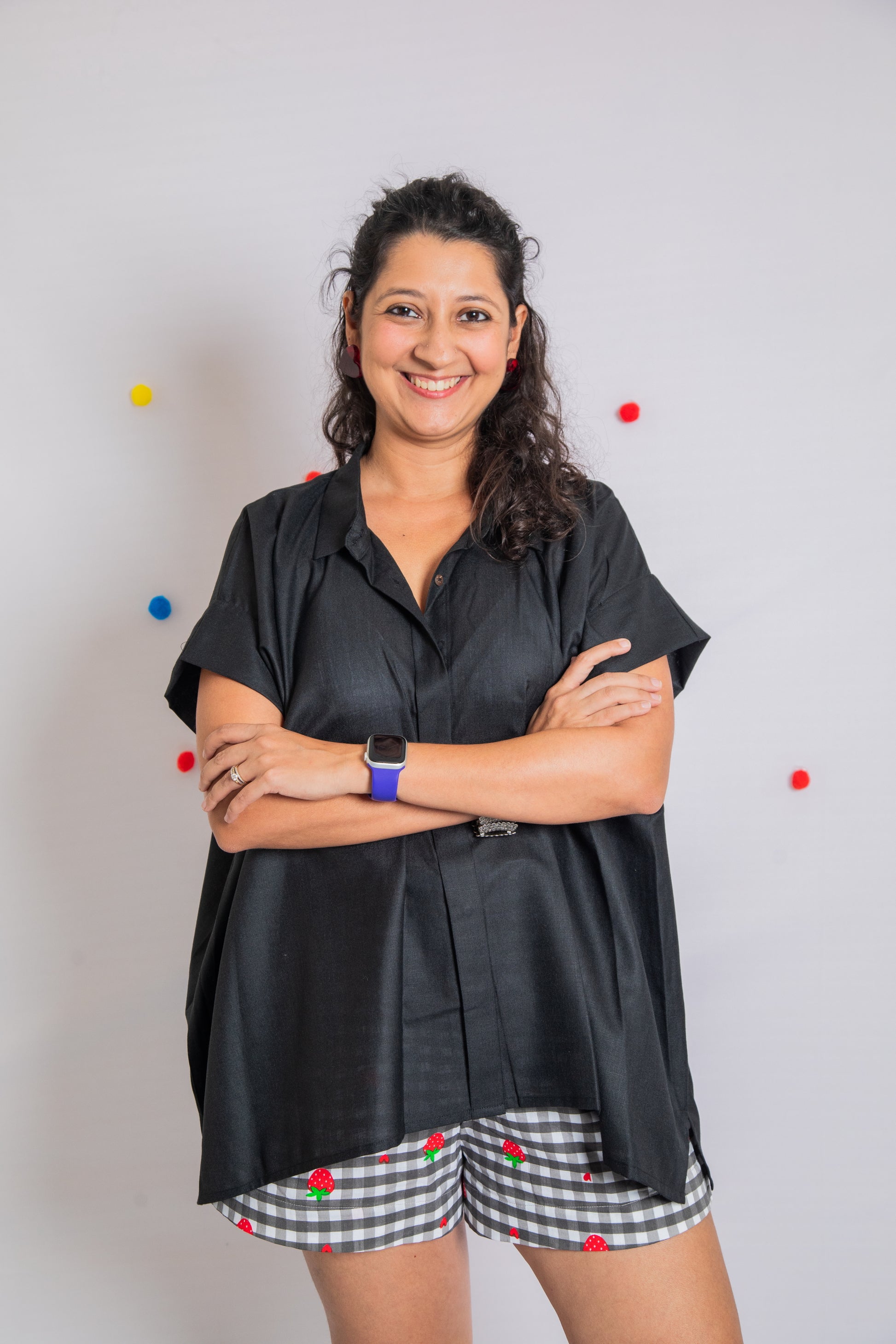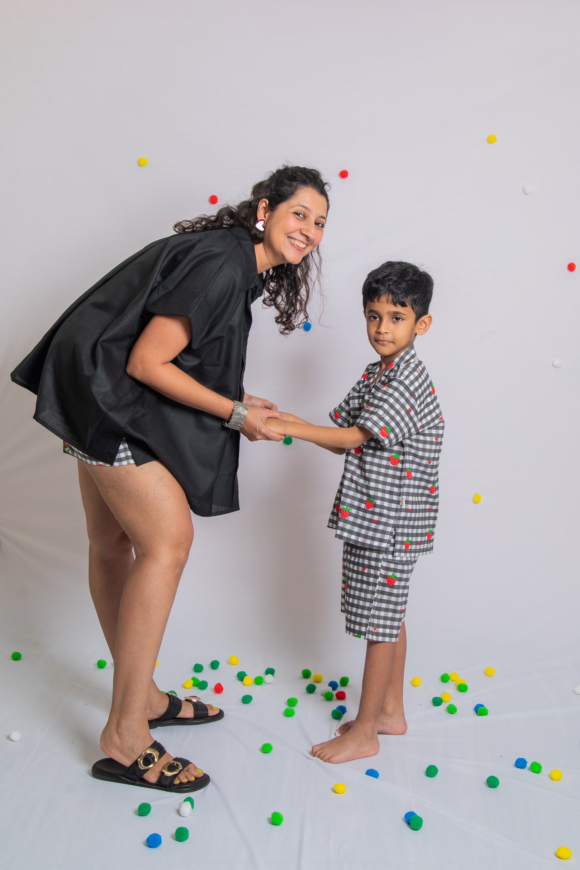 Adult Co-ord set: Embrace comfort and style with our Strawberry & Hearts print Co-ord Set. Made from 100% cotton, this super comfortable set is perfect for a playful day out or lounging at home. It includes a relaxed-fit Black flowy box styled shirt with a half-elastic thick waistband Strawberry print shorts with side pockets.