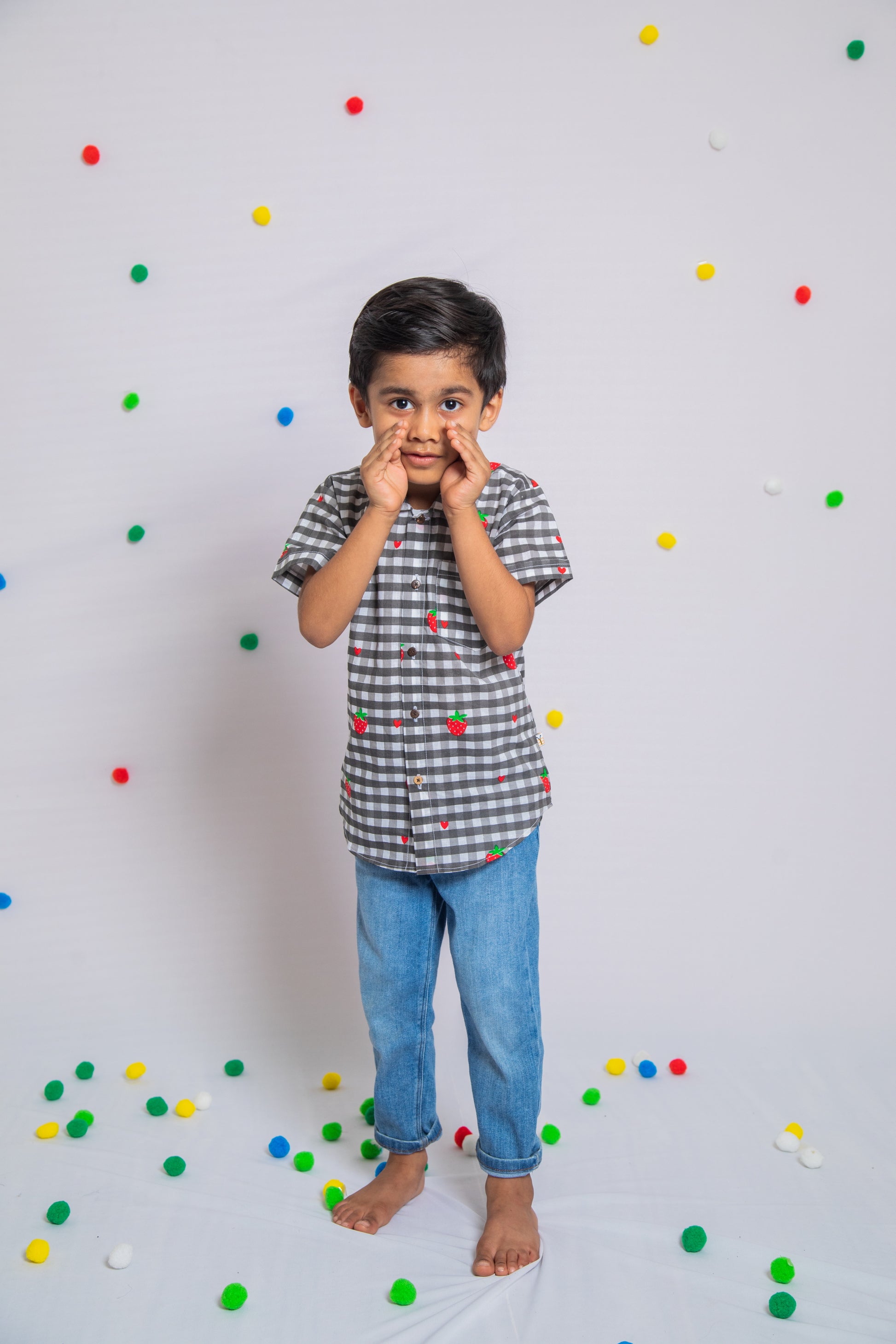 This stylish Strawberry print shirt is a must have ensemble for this Summer!