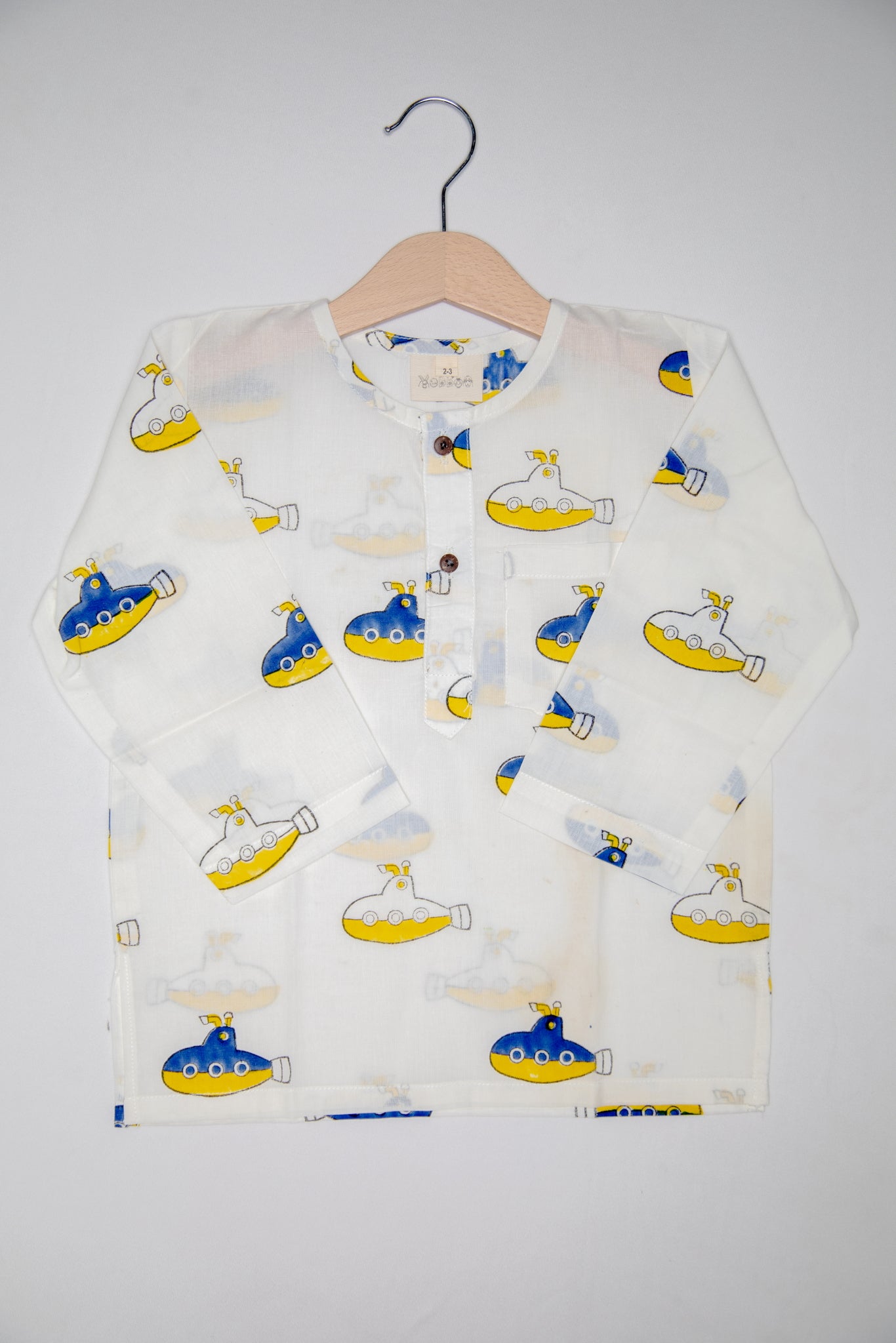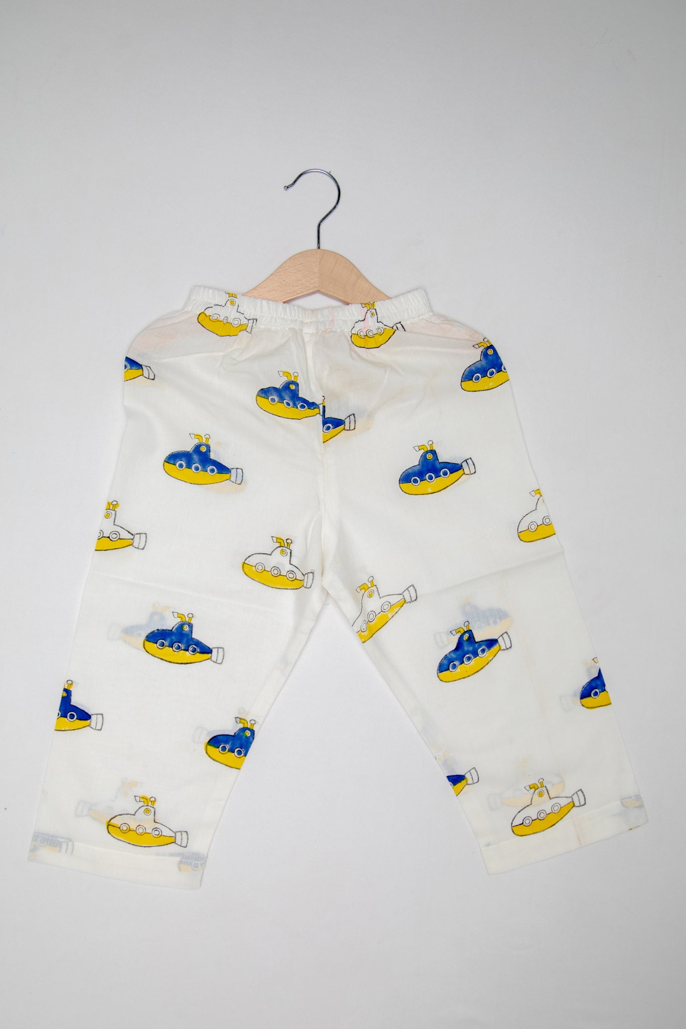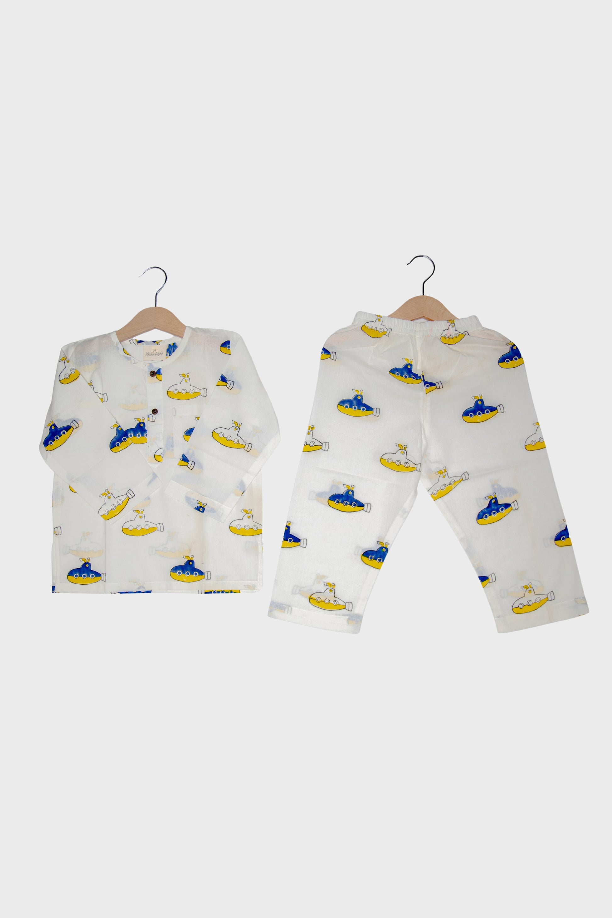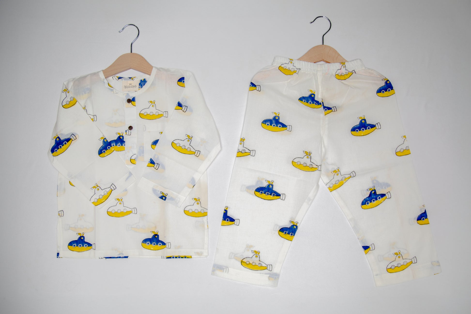 Sleep tight in our soft cotton mul night suit with Submarine print kurta and pajama set which is hand-block printed.